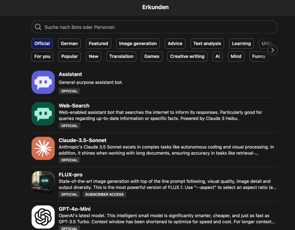 - Vielseitigkeit: Poe.com bietet Zugang zu verschiedenen KI-Modellen wie GPT-4, Claude, und spezialisierten Tools wie Stable Diffusion in einer einzigen Plattform.