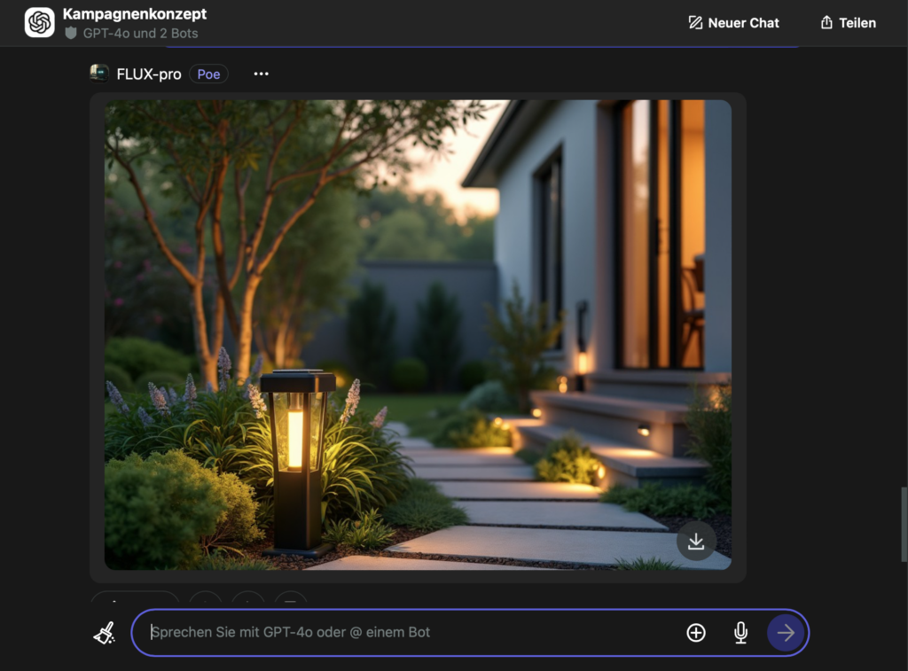 1. Kampagnenkonzept (mit GPT-4o): Prompt: „Entwickle ein Kampagnenkonzept für ‚EcoGlow‘, unsere neue Serie solarbetriebener Gartenleuchten. Fokussiere auf Nachhaltigkeit, Design und Benutzerfreundlichkeit.“