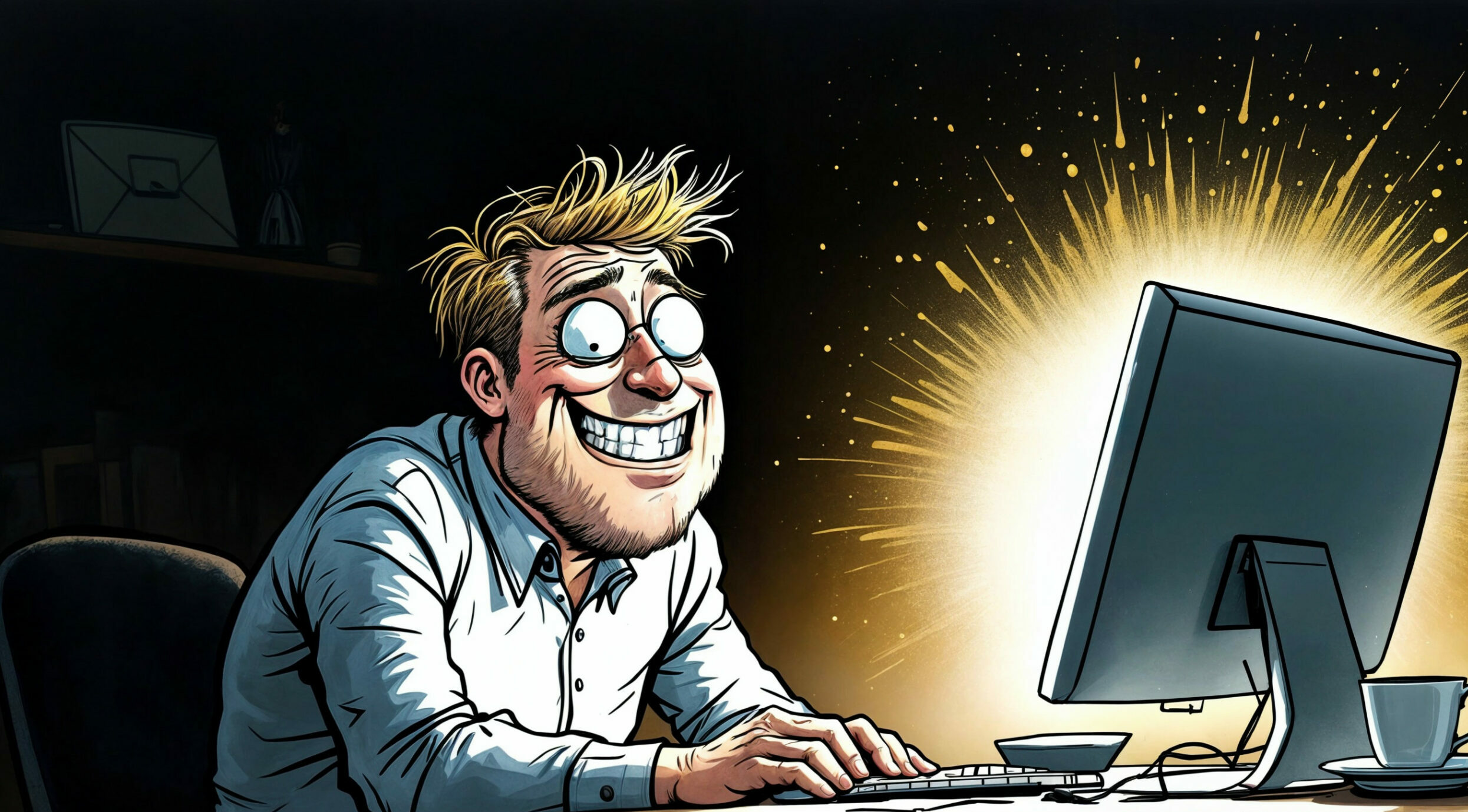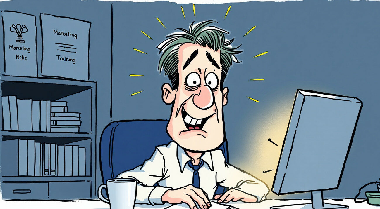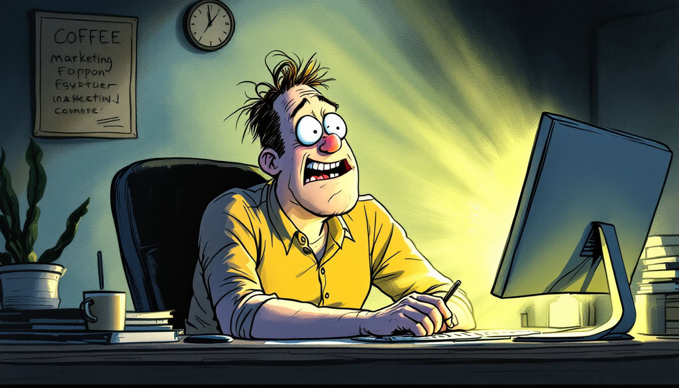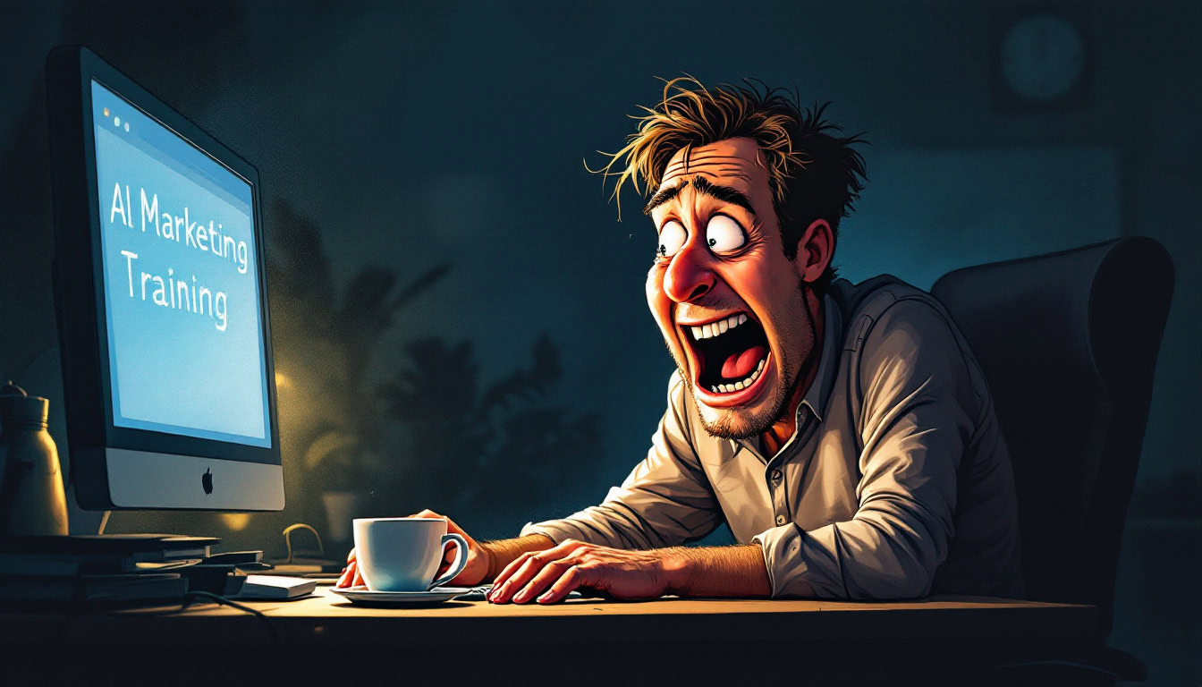 PS: Unsere Illustrationen sagen alles: Ein völlig erschöpfter Marketer, Augenringe tief wie der Marianengraben, das Haar zerzaust und die fünfte Kaffeetasse in der Hand. Gerade als alles verloren scheint, entdeckt er unsere KI-Marketing-Schulung – und plötzlich blitzt Hoffnung in seinen Augen auf. Endlich Licht im Marketing-Dunkel!