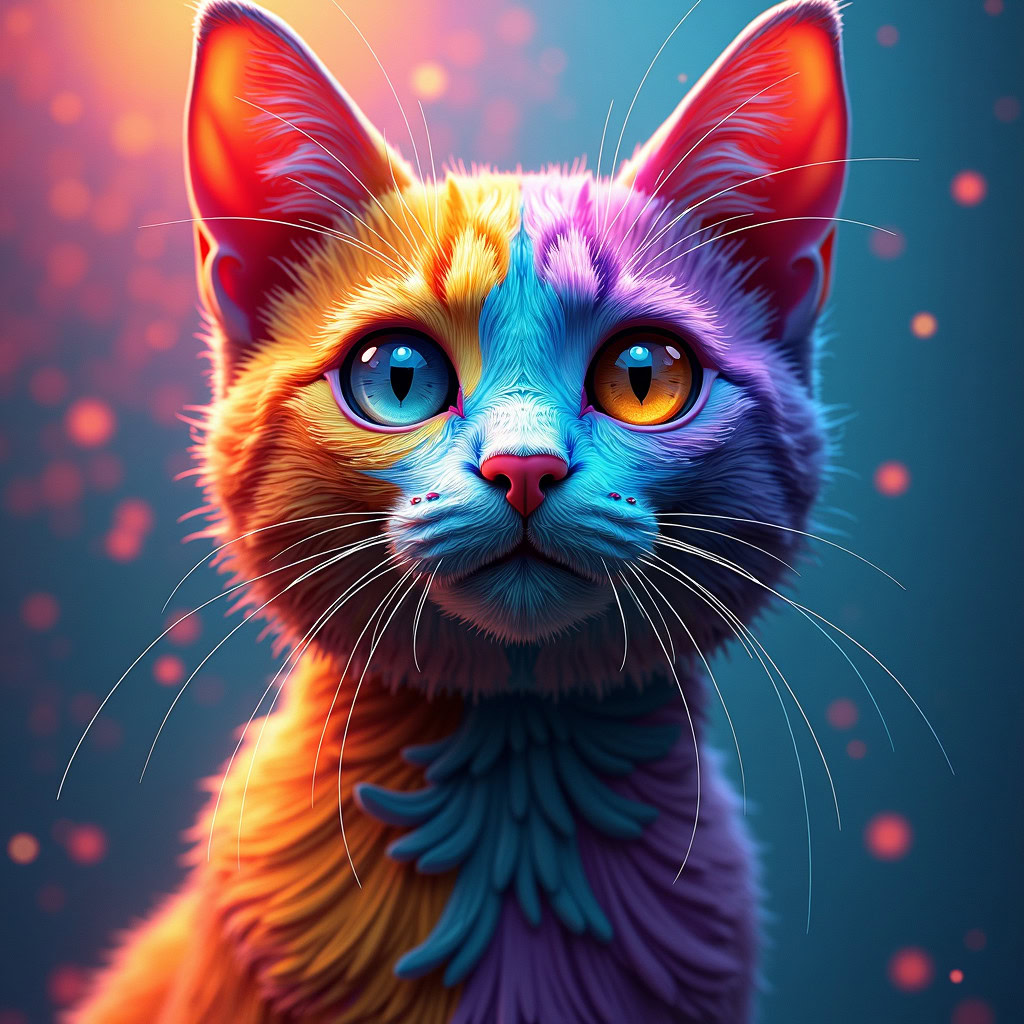 Prompt: fantasy 3d illustration of a colorful cat, centered, looking at viewer, psychedelic art, abstract, ehemeral, elusive and unstable, psychedelic background, oil painting texture
