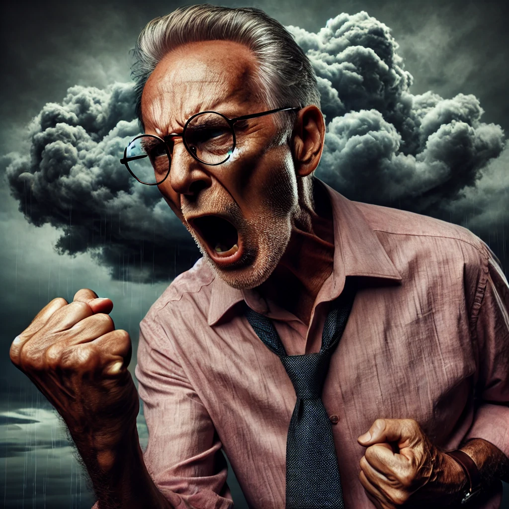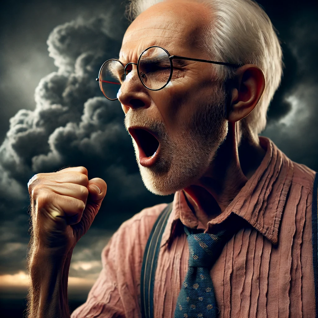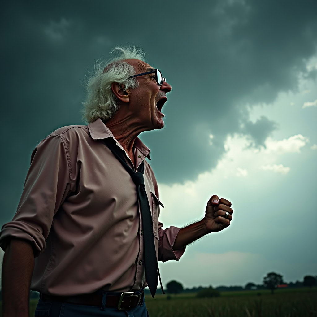 Prompt: photo of a frail old man with clenched fist yelling wearing glasses and an old faded pinkish shirt with a tie around his neck and looking at a threatening storm cloud, cinematic, detailed, atmospheric, dramatic light