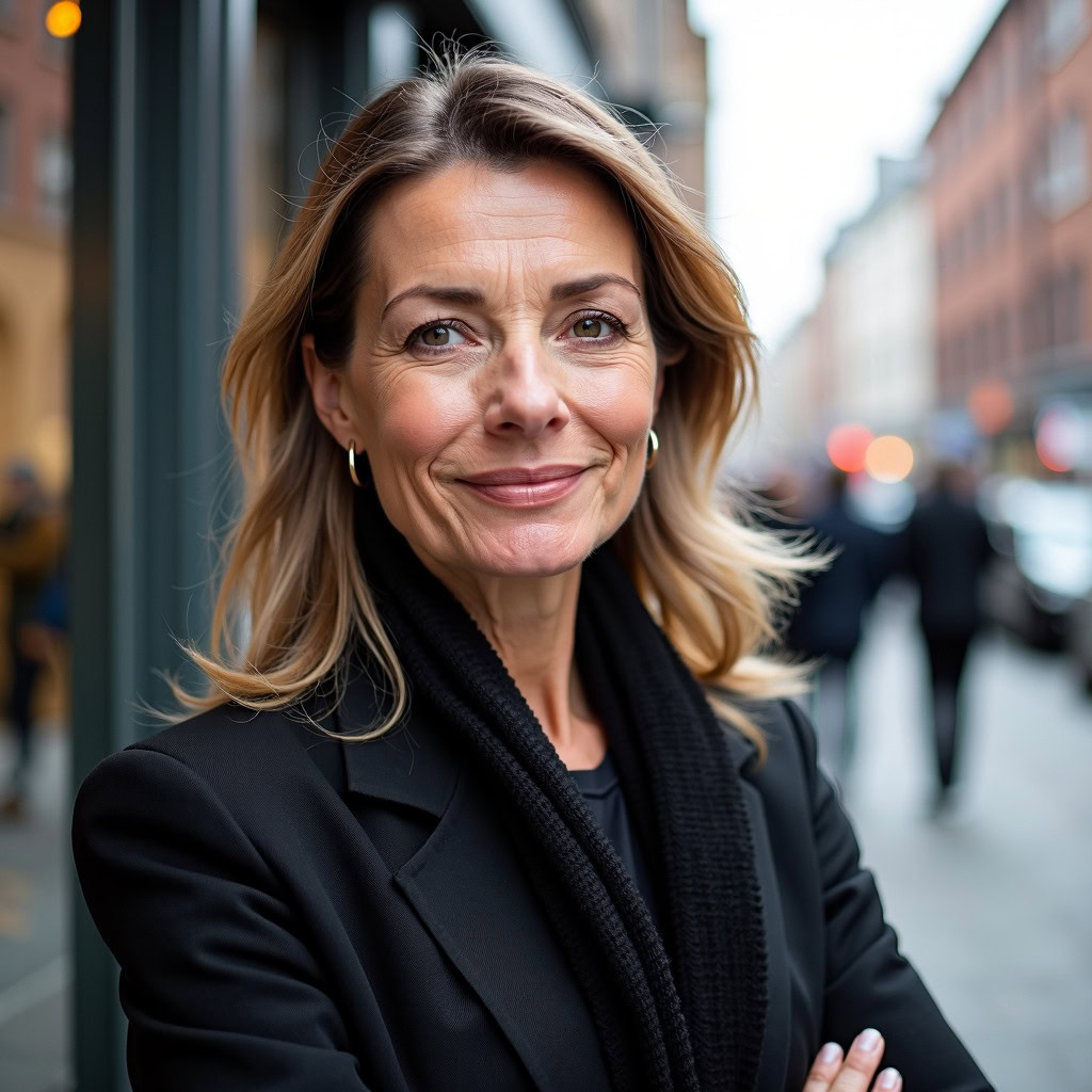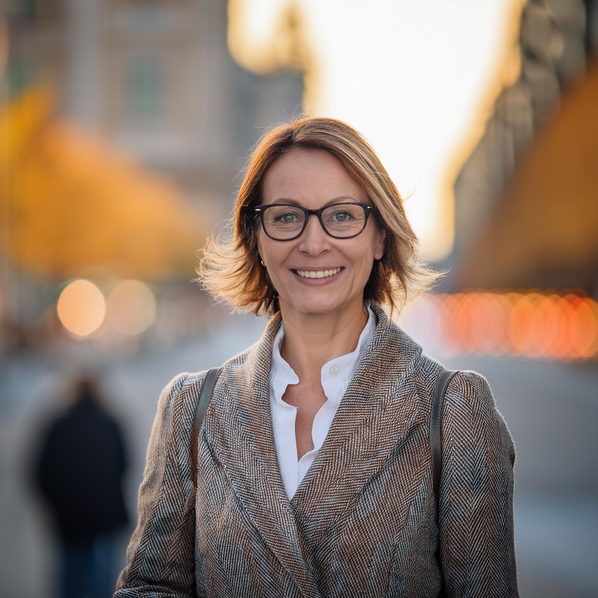 Prompt: portrait photo of a 40 year old business woman, streets of munich