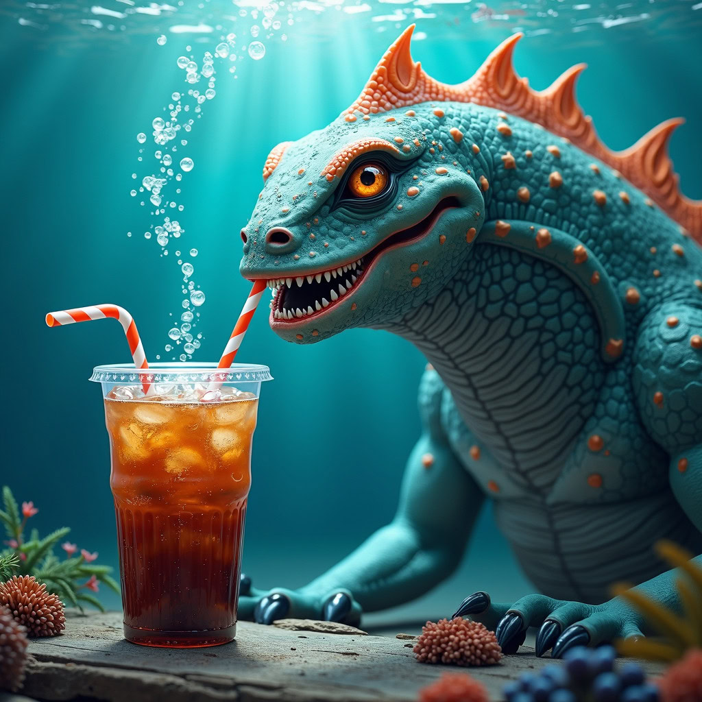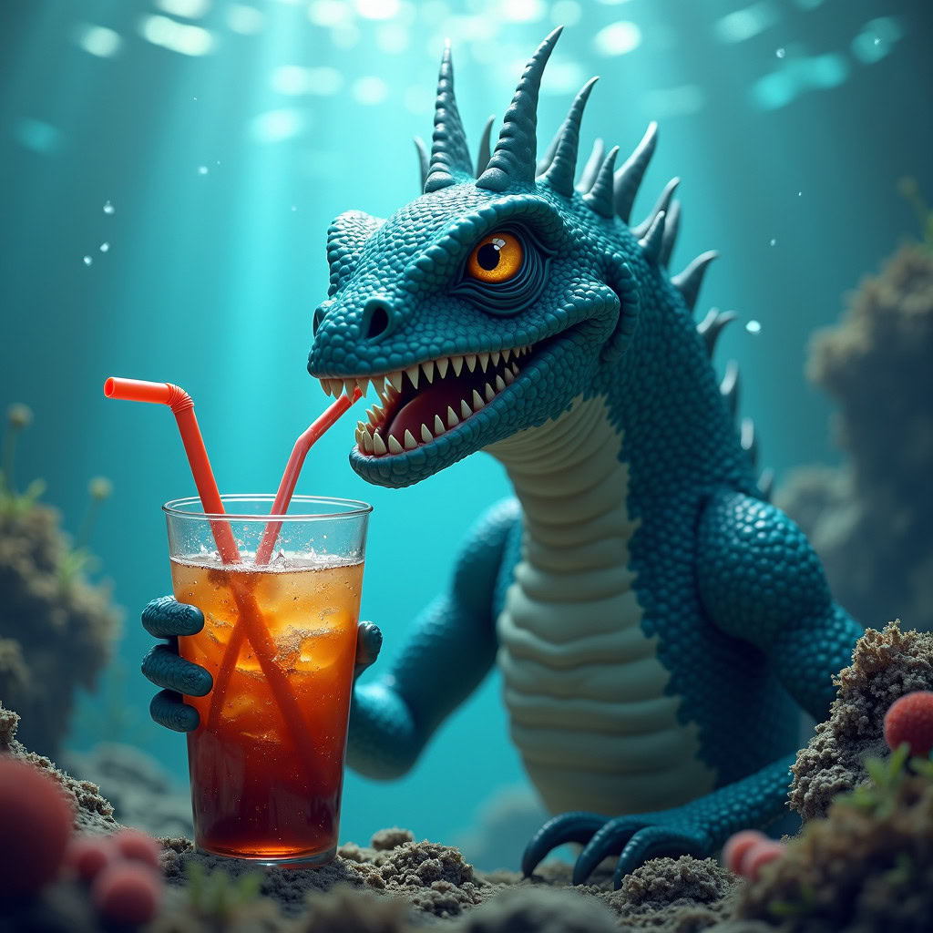Prompt: photo of a sea monster drinking a soda with a drinking straw, underwater, deep sea, fantasy, abstract