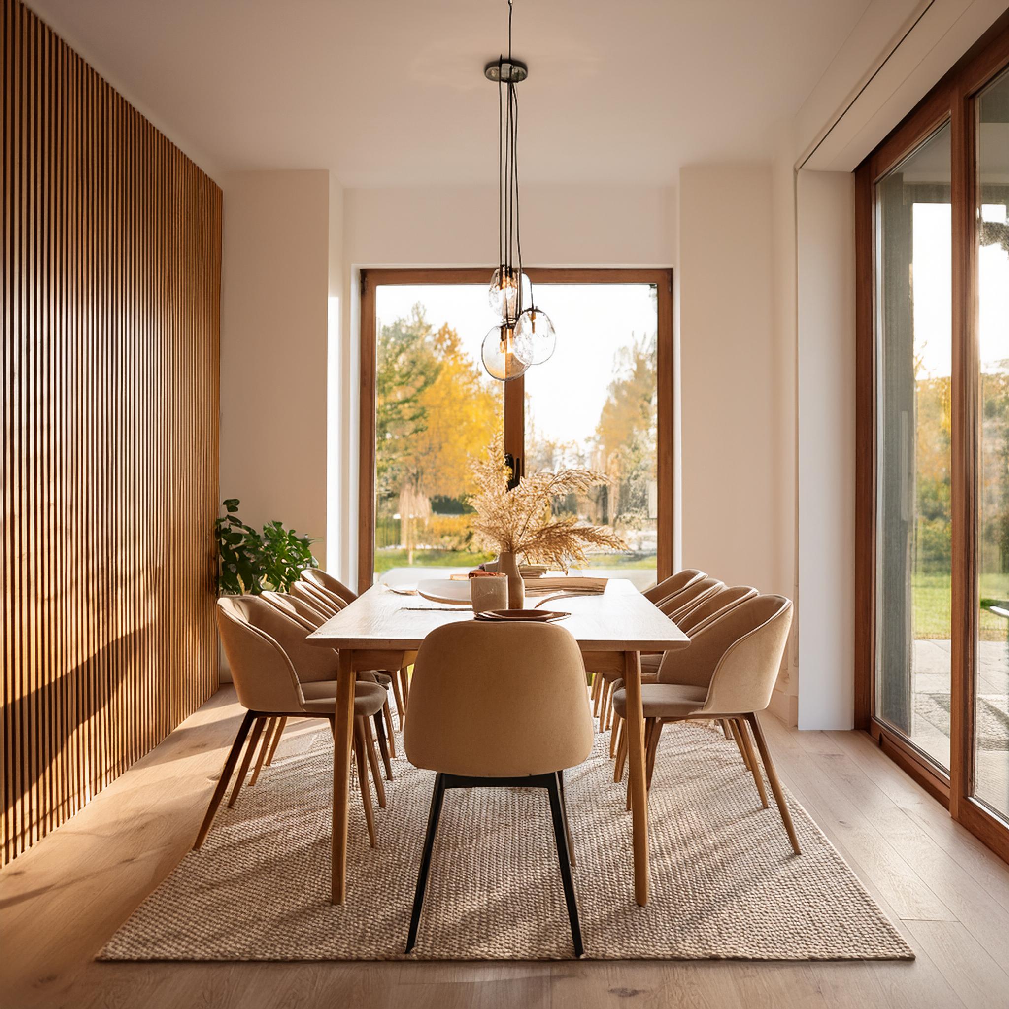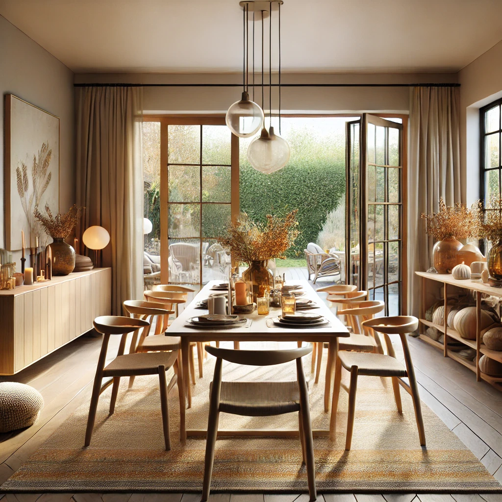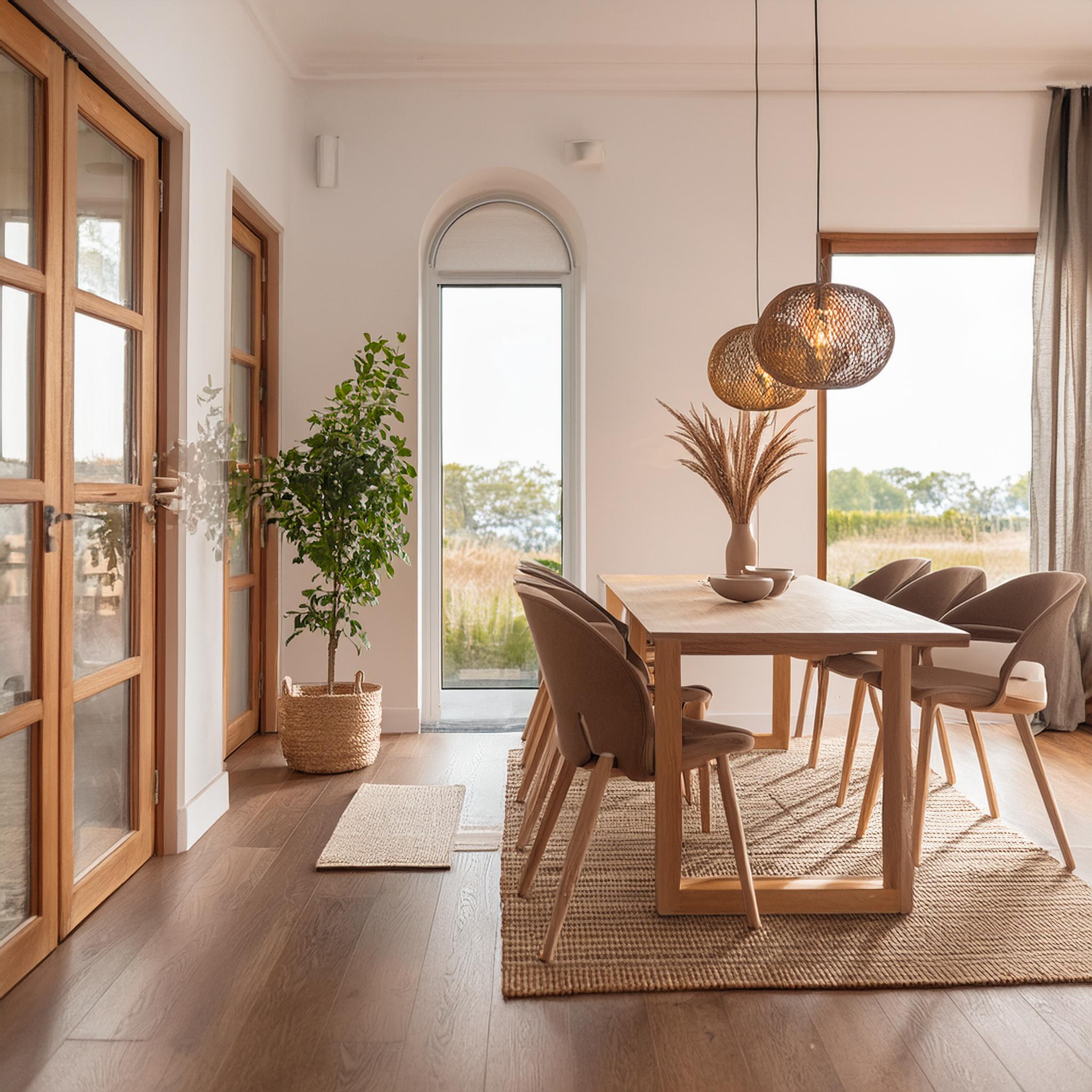 Prompt: photo of a dining room with large doors and modern swedish furniture, decorated in a bright warm and earthy color scheme, hygge style