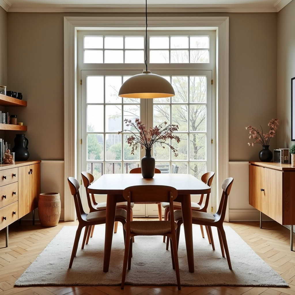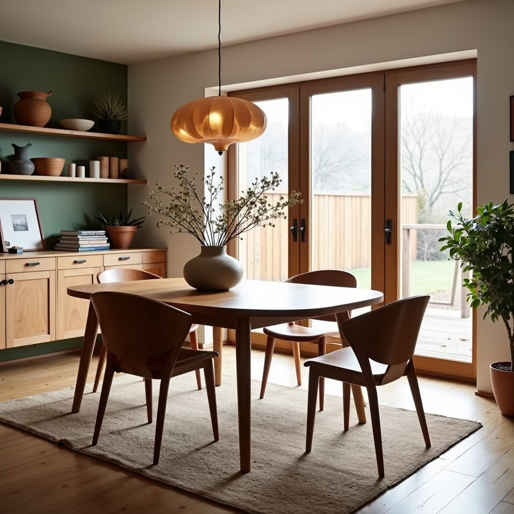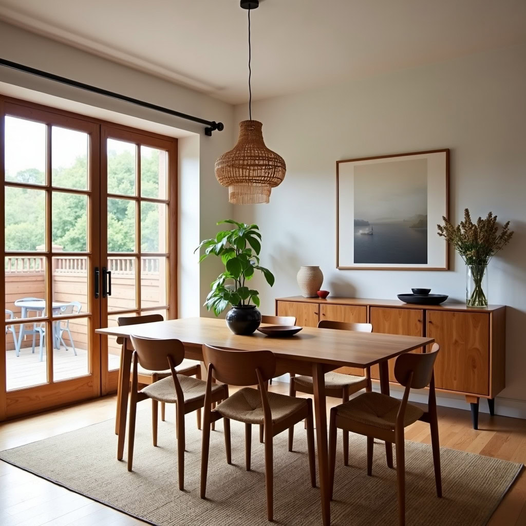 Prompt: photo of a dining room with large doors and modern swedish furniture, decorated in a bright warm and earthy color scheme, hygge style