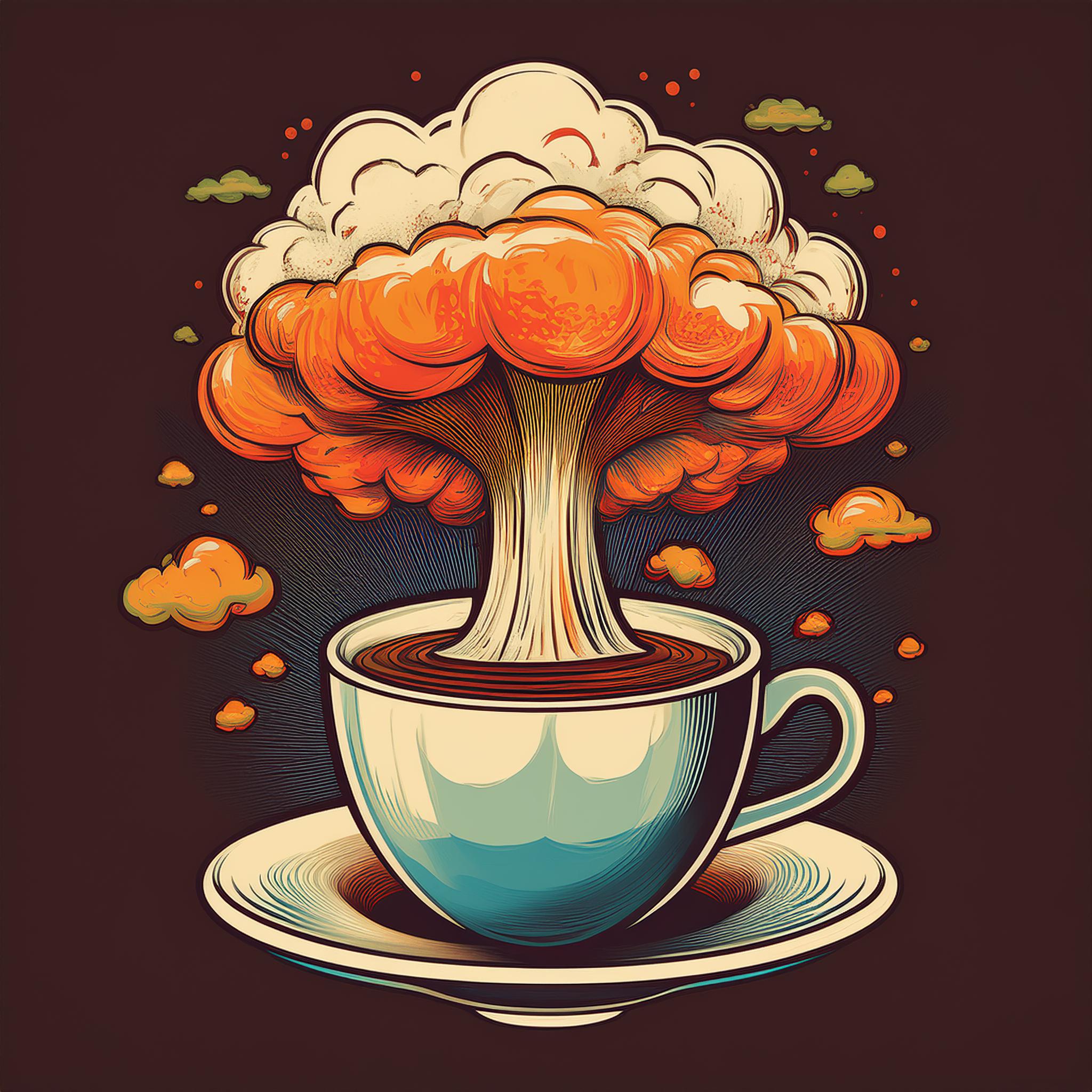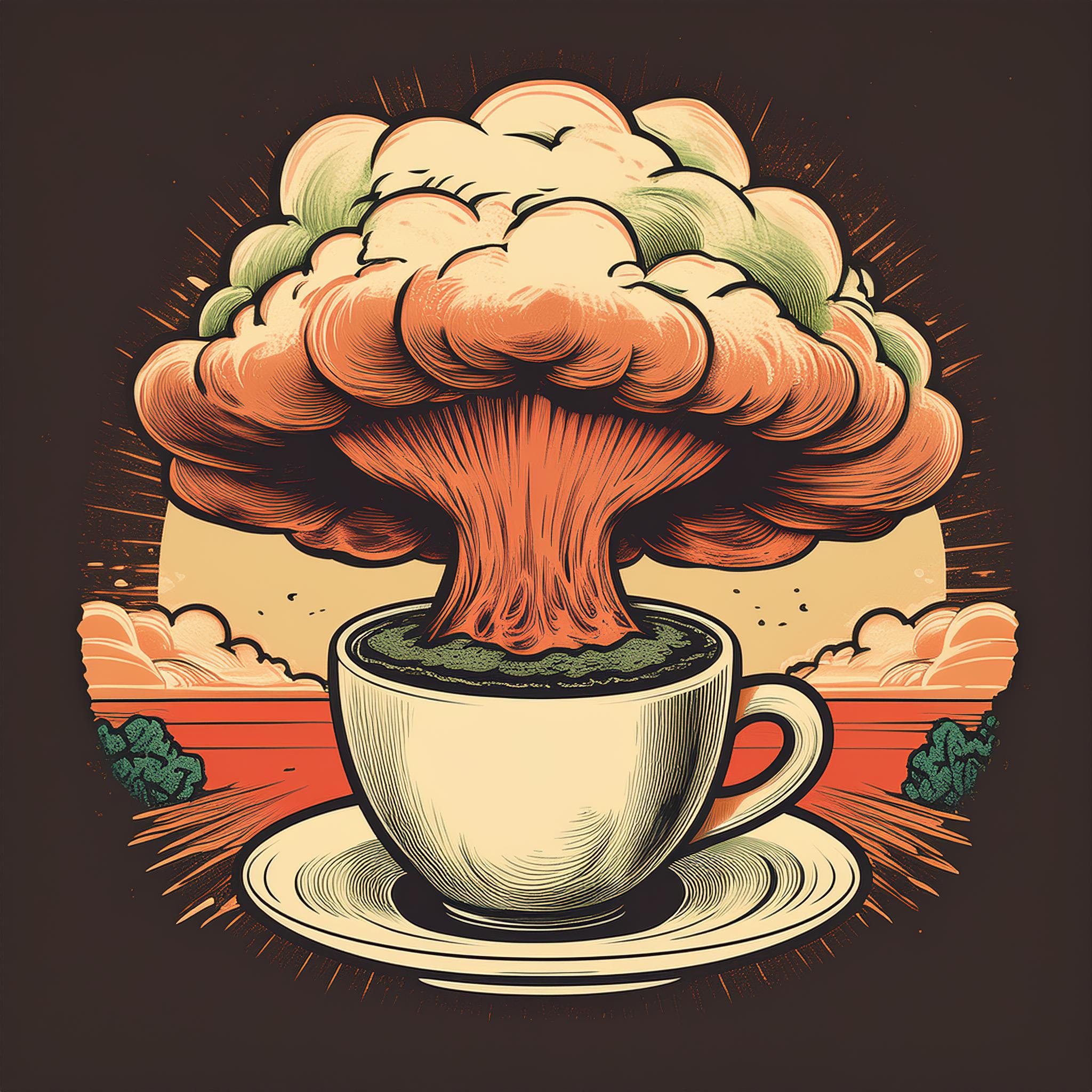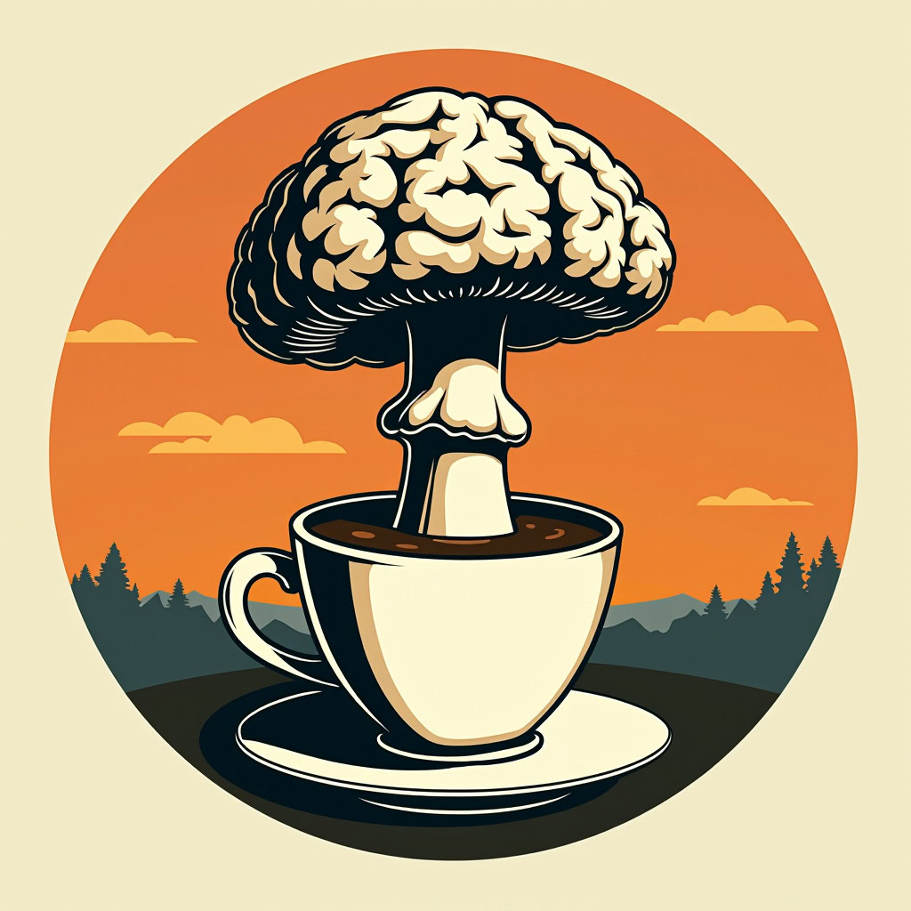 Prompt: Coffee logo, featuring a mushroom cloud coming out of a cup, the cloud looks like brains, full colour print, vintage colours, 1960s