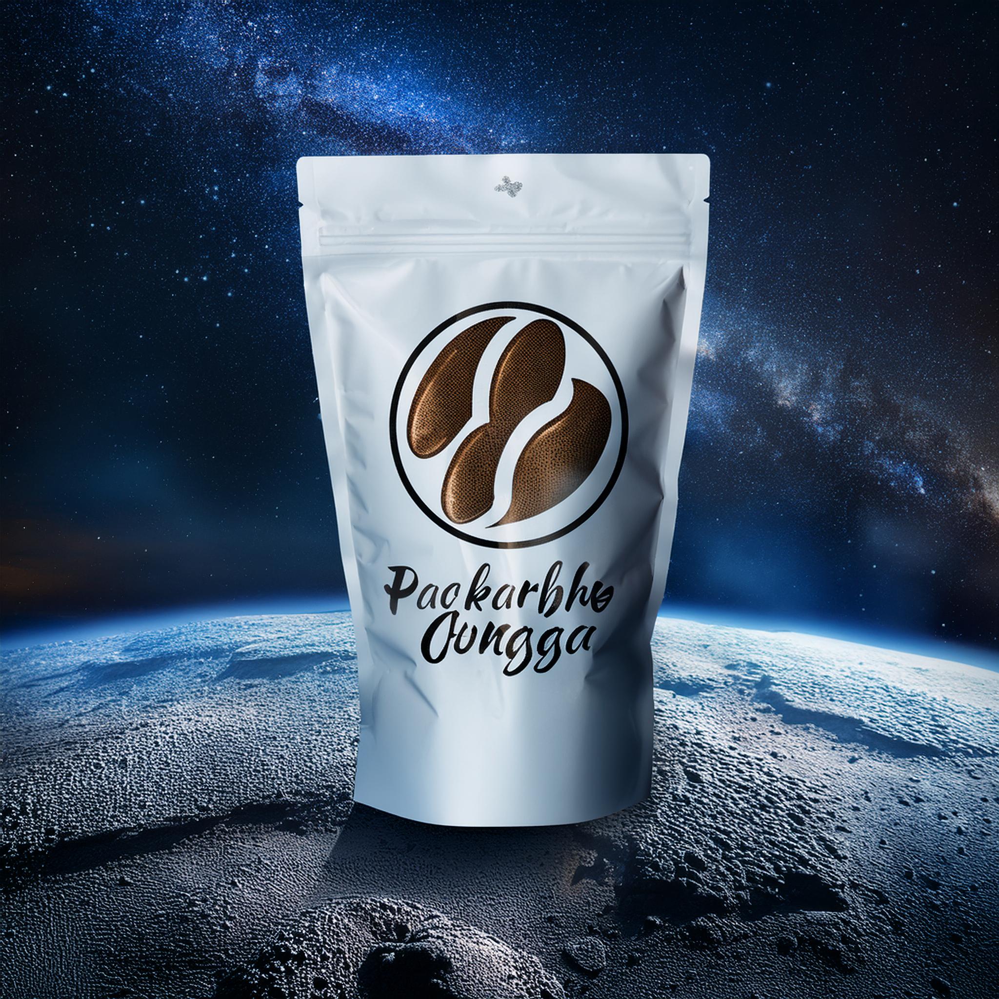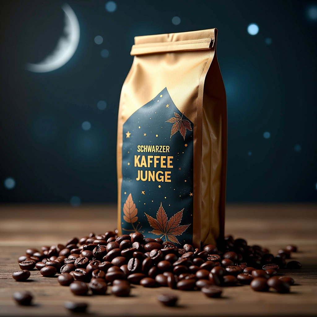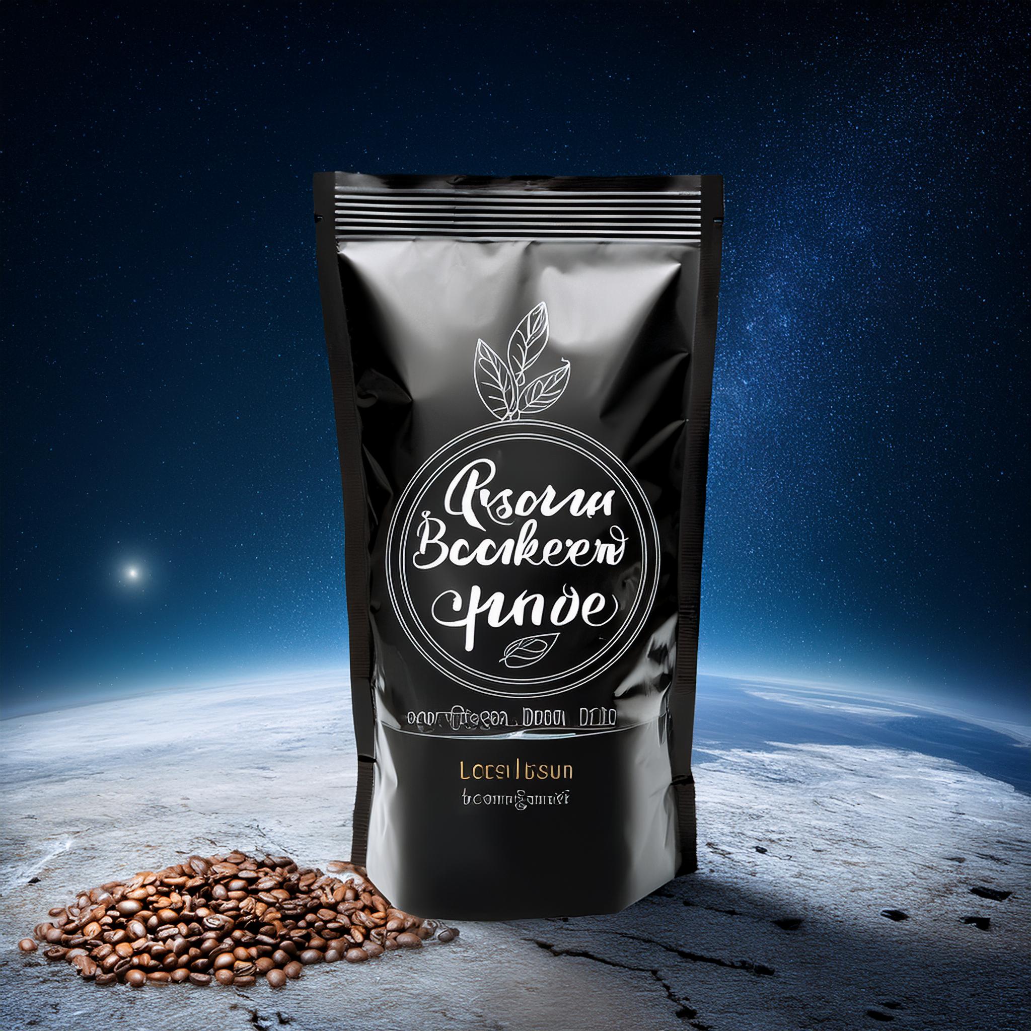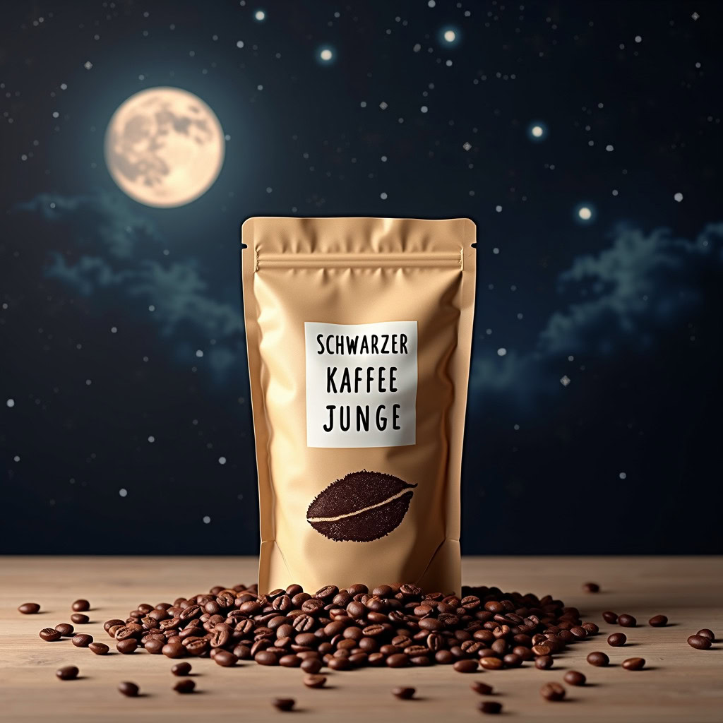 Prompt: a realistic standup pouch product photo mockup decorated with coffee beans and Coffee-leaves with the words „SCHWARZER KAFFEE JUNGE“ featured prominently, scifi, on the moon, space, stars, night