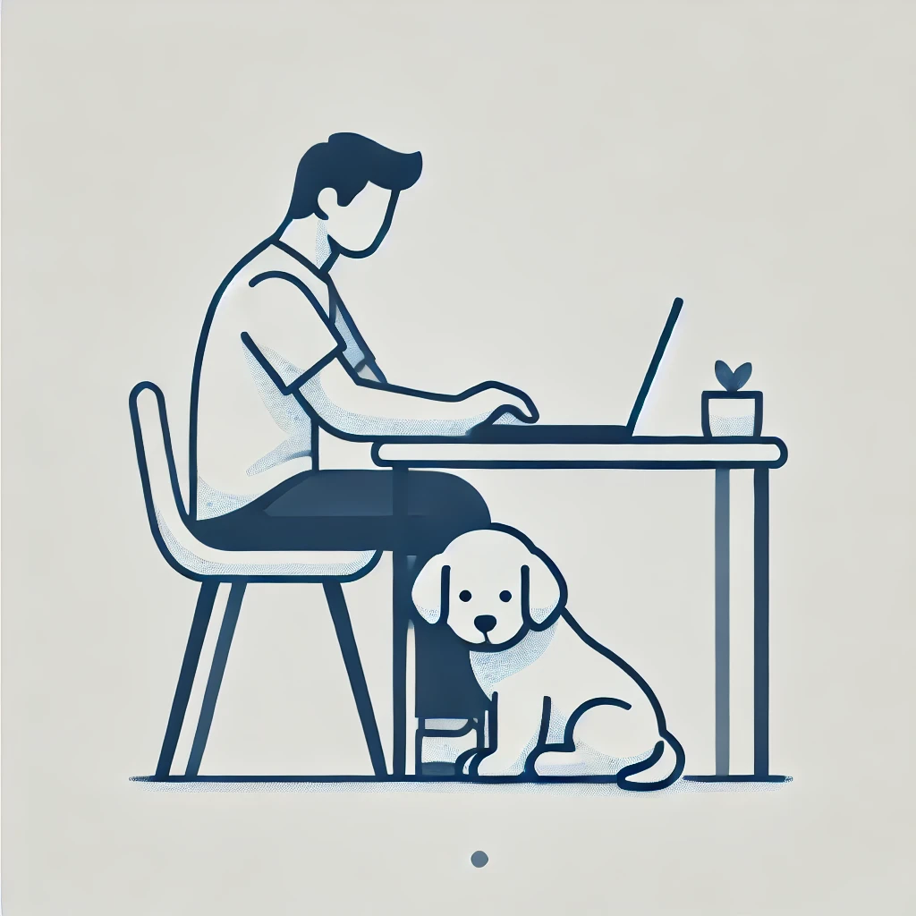 Prompt: flat vector illustration of a man sitting at a desk with his laptop, puppy, isolated on a white background, simple, minimalistic, closeup