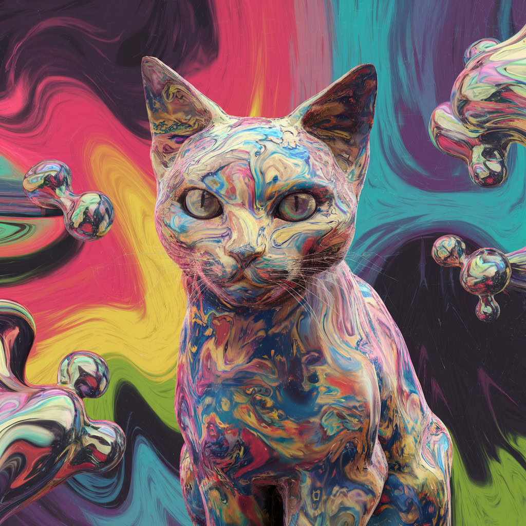 Prompt: fantasy 3d illustration of a colorful cat, centered, looking at viewer, psychedelic art, abstract, ehemeral, elusive and unstable, psychedelic background, oil painting texture