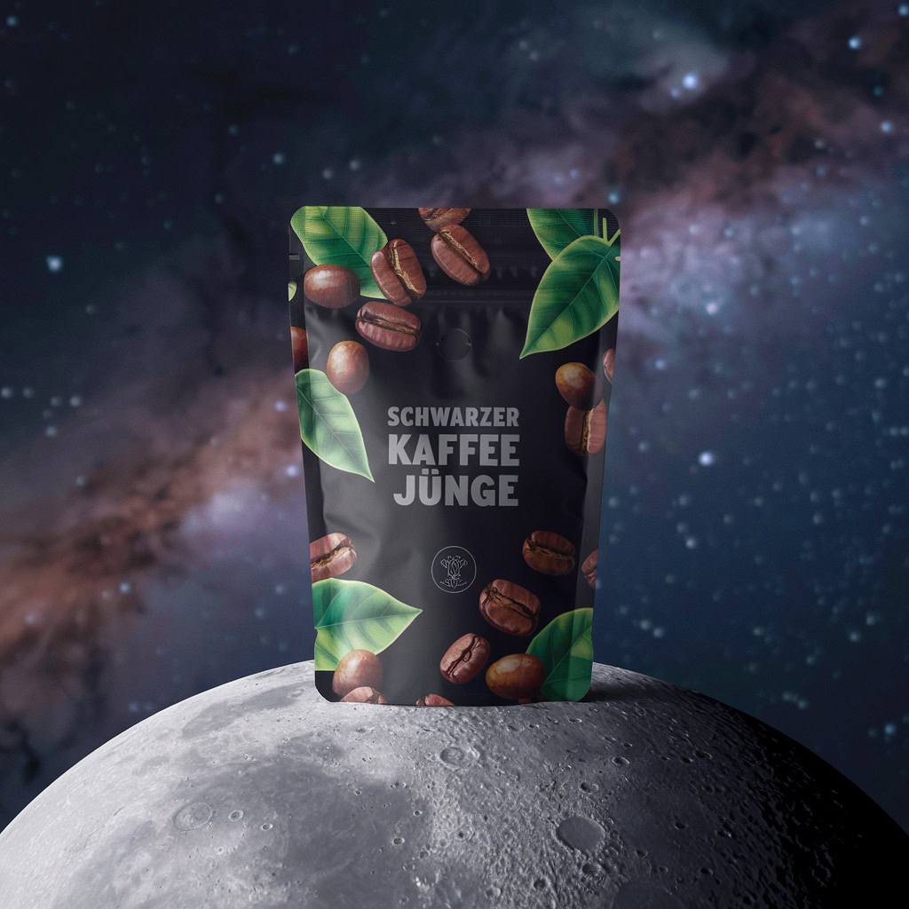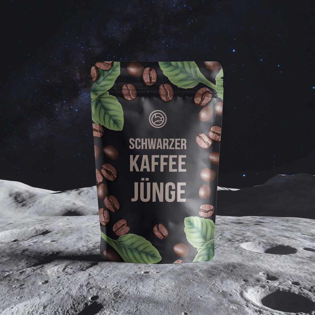 Prompt: a realistic standup pouch product photo mockup decorated with coffee beans and Coffee-leaves with the words „SCHWARZER KAFFEE JUNGE“ featured prominently, scifi, on the moon, space, stars, night