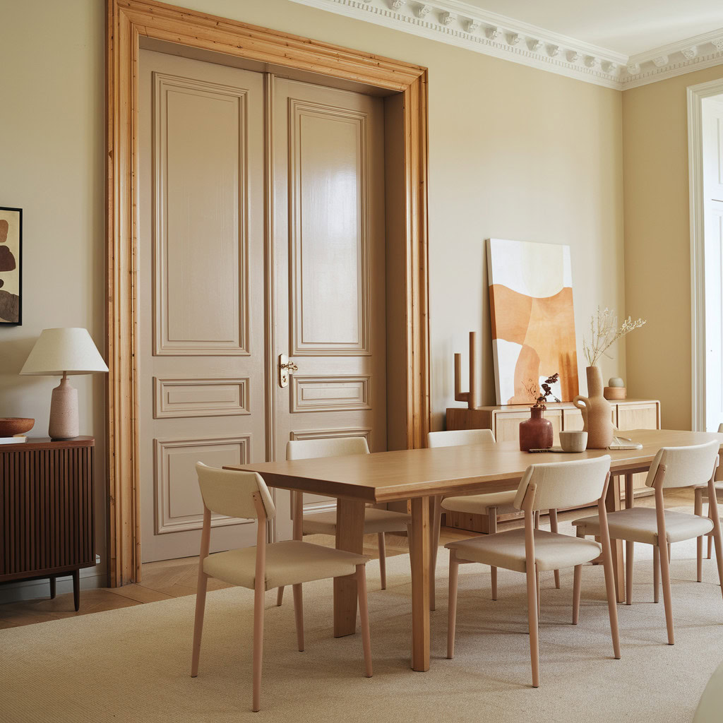Prompt: photo of a dining room with large doors and modern swedish furniture, decorated in a bright warm and earthy color scheme, hygge style
