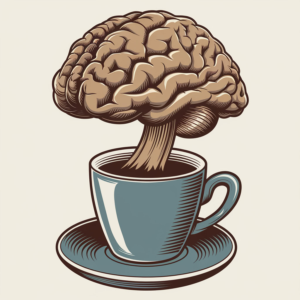 Prompt: Coffee logo, featuring a mushroom cloud coming out of a cup, the cloud looks like brains, full colour print, vintage colours, 1960s