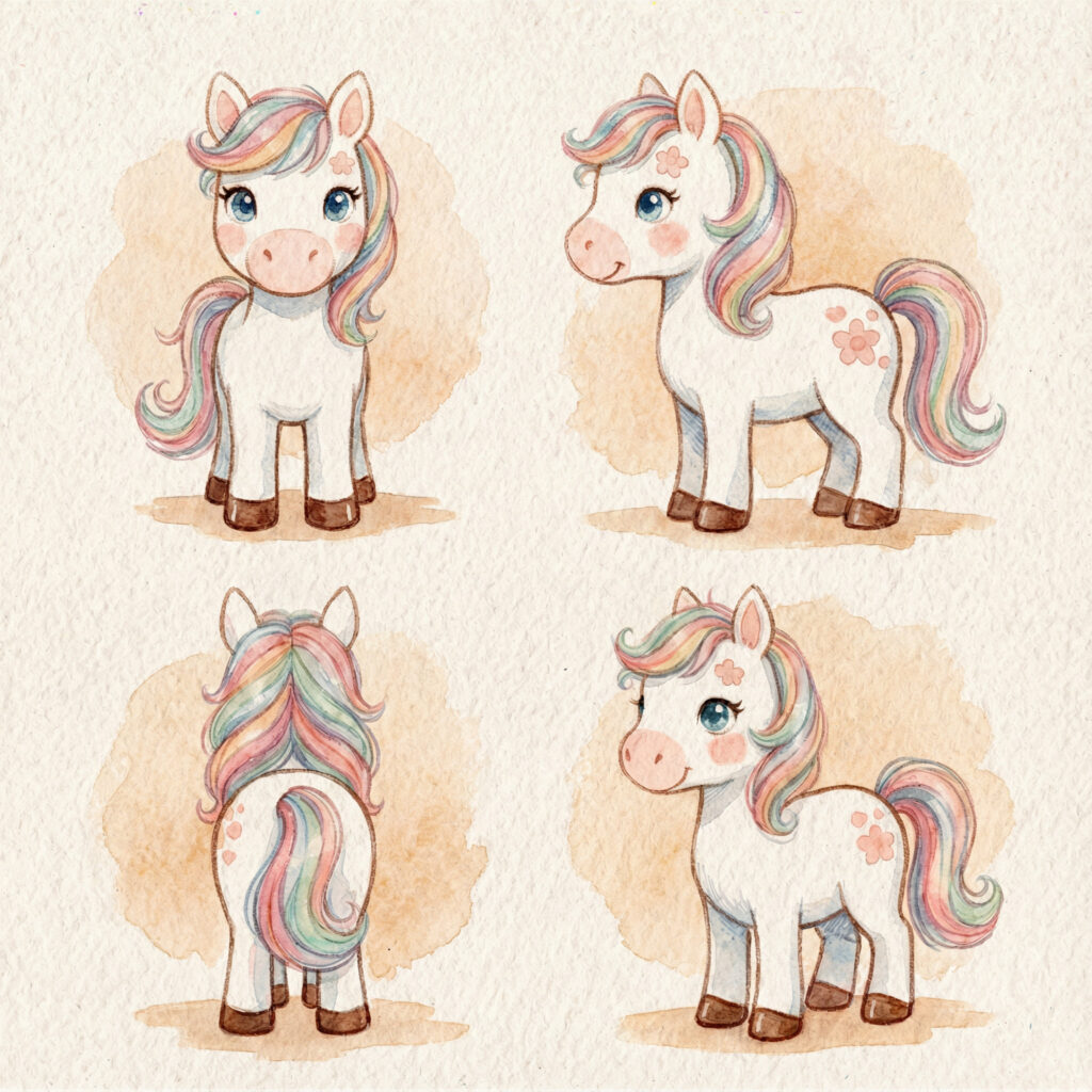 Create a combined charactersheet in a watercolor illustration style featuring a young girl and a unicorn, both depicted at the same size for accurate size reference in future image generation. The girl is a charming child with short, wavy reddish-brown hair tied in a small topknot, large expressive blue eyes, rosy cheeks with freckles, wearing a pastel star-patterned t-shirt and denim shorts with casual slip-on shoes. Show her in multiple poses: front, back, side, and three-quarter views, including a close-up of her face with a gentle smile and lively expression. The unicorn is a small, adorable creature with a white coat, large blue eyes, rosy cheeks, and a soft pink muzzle. It has a flowing mane and tail in pastel rainbow colors with subtle curls, decorated with small flower markings on its body and brown hooves. Present the unicorn in front, back, side, and three-quarter views, matching the girl’s size exactly. Both characters are set against a textured off-white watercolor paper background with soft beige watercolor washes behind the unicorn for subtle contrast. The lighting is soft and natural, enhancing the delicate watercolor textures and gentle color palette. The overall vibe is whimsical, friendly, and suitable for a children’s storybook character reference sheet. Ensure the composition is spacious and clear, making it an ideal size and format for detailed character reference and future image generation.