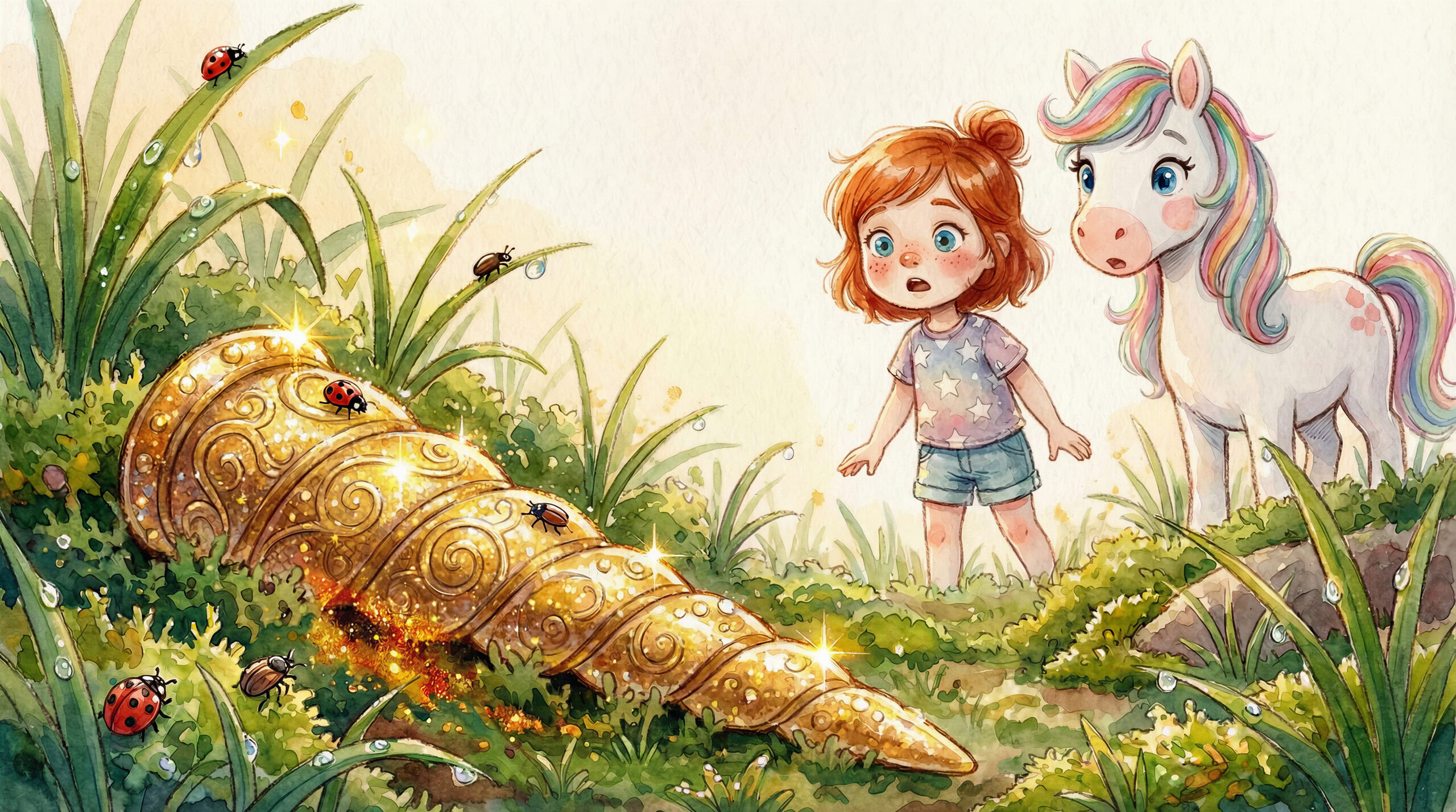 „Waldrand bei mildem Tageslicht. Das Mädchen, etwa 4 Jahre alt, lockige Haare, bunte Kleidung, stolpert erschrocken vor Schreck einen Schritt zurück. Vor ihr sitzt ein kleines weißes Pony mit bunter Mähne, bitterlich weinend. Kein Horn ist zu sehen — nur das traurige Pony. Im Hintergrund beginnt der Wald, mit Bäumen und neugierigen Tieren…“