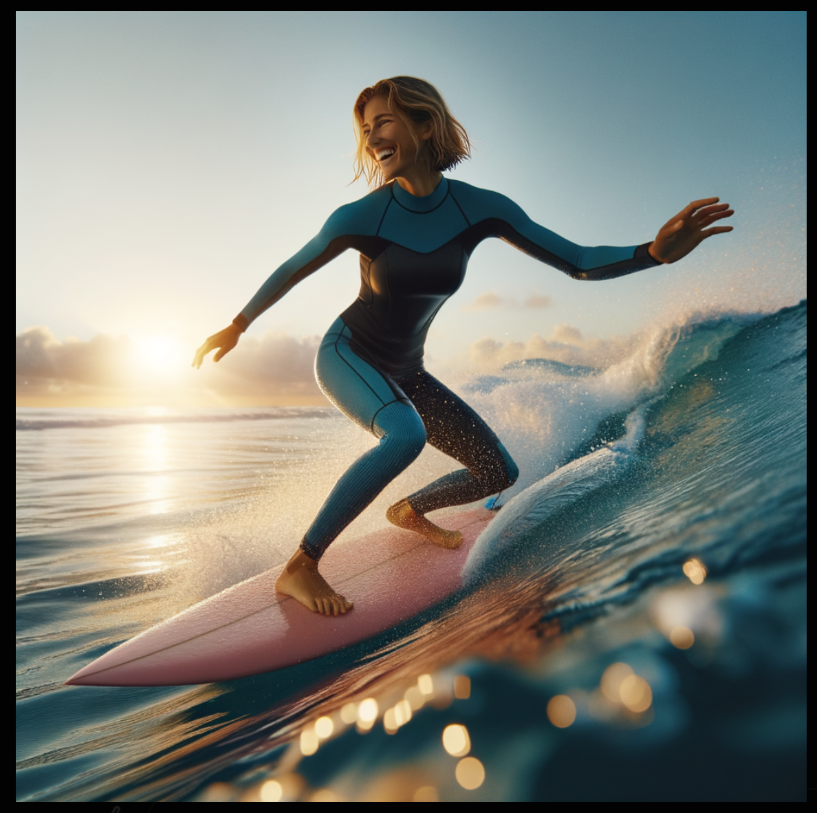 Vor Beginn der KI Weiterbildung experimentierte ich bereits mit Bildgenerierungs-Tools wie DALL-E, jedoch ohne professionelle Anleitung blieben die Ergebnisse qualitativ durchschnittlich. Das erste Bild in der Bilderserie veranschaulicht dies – ein unscharfes, detailarmes KI-generiertes Surferbild meiner Anfängerversuche.