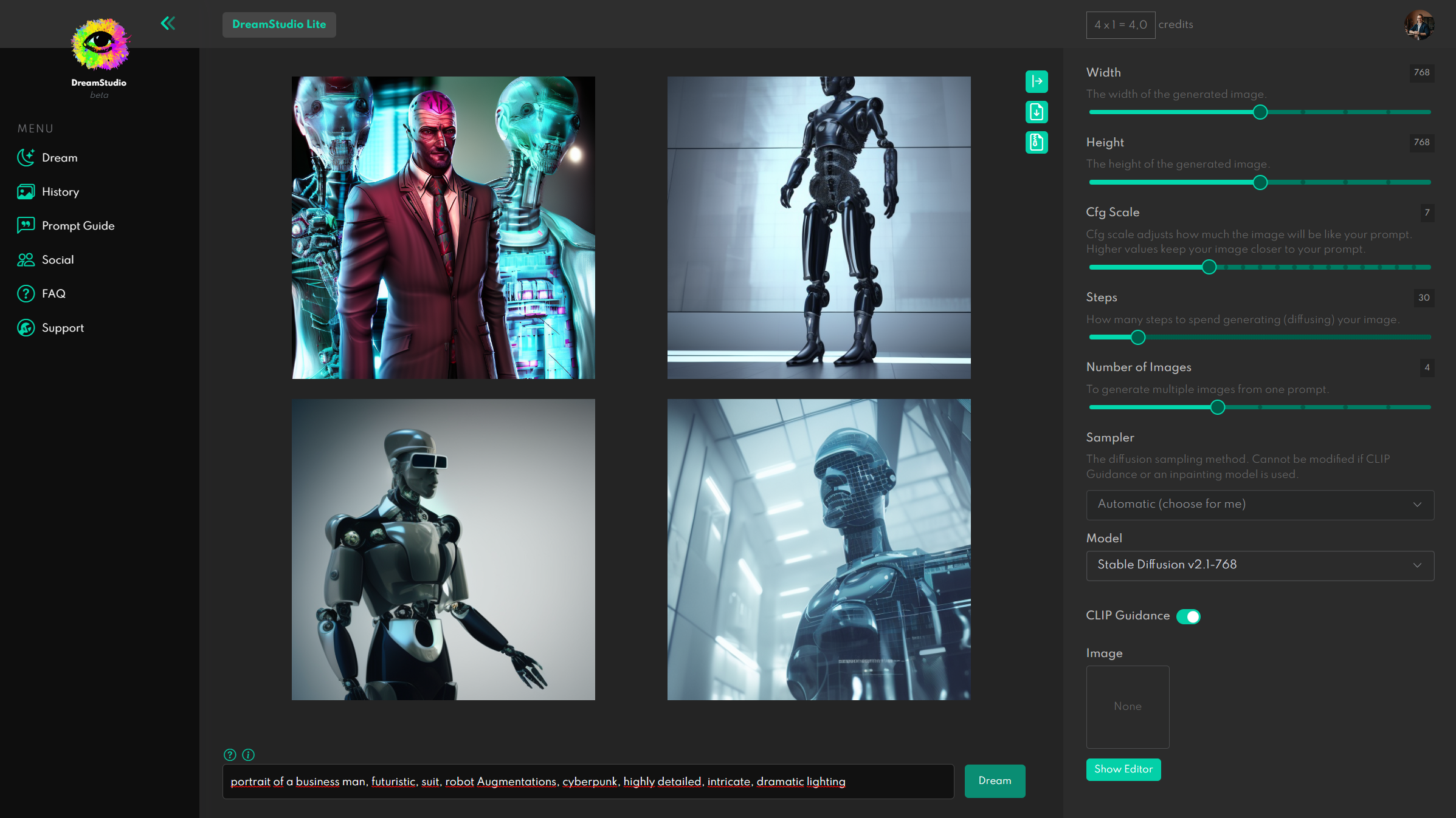 - Dreamstudio von StabilityAI – Die Entwickler der Stable Diffusion Models haben mit Dreamstudio einen simplen Playground zum Testen der Stable Diffusion Modelle 1.5 und 2.1 geschaffen. Nach Registrierung stehen euch eine Handvoll Credits zur Verfügung, die zur Generierung einiger Bilder ausreichen. Ein Bild in 768×768 Pixel entspricht etwa einem Credit. 1000 Credits kosten 10$.