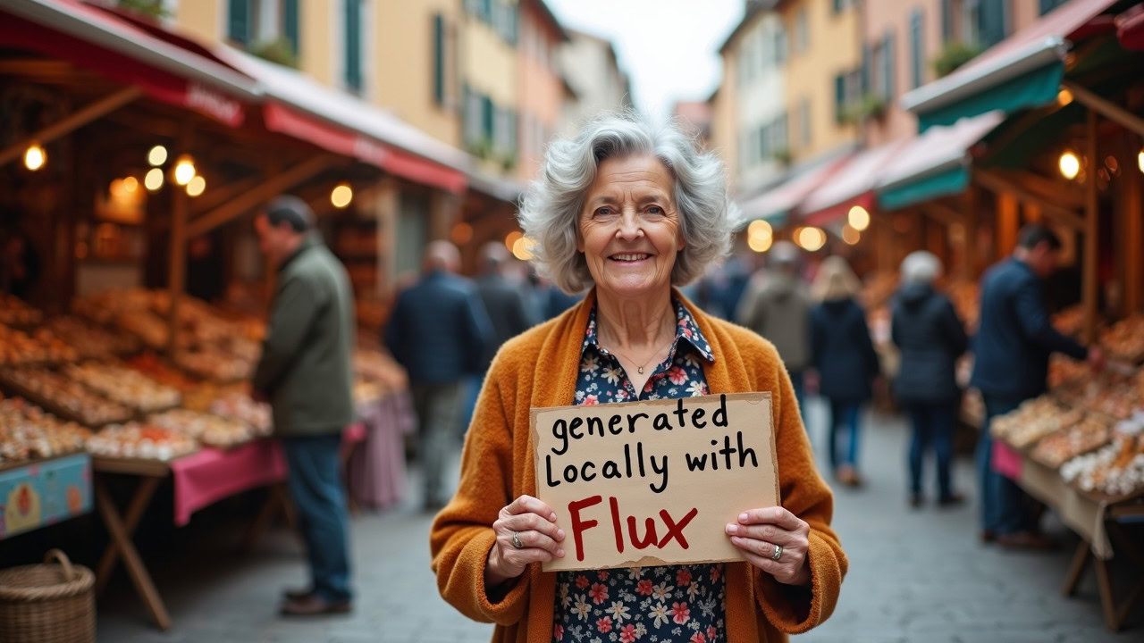 - Textwiedergabe: Funktioniert auf Englisch deutlich besser als auf deutsch. „Lokal generiert mit Flux“ konnte ich nicht fehlerfrei generieren „generated locally with flux“ schon.