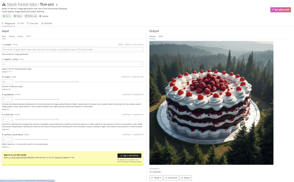 - Replicate: Perfekt für den einfachen Einstieg. Hier kannst du Flux.1 direkt im Browser ausprobieren, ohne Installation.