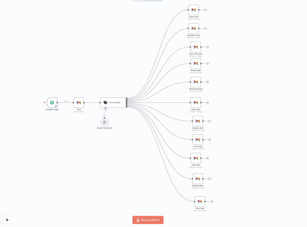 Die KI-basierte Kategorisierung ist das Herzstück des Workflows. Alle E-Mails werden durch einen Text Classifier geschickt, der sie den verschiedenen Labels zuordnet. Das war’s eigentlich schon – klingt simpel, oder? Aber wie gut das funktioniert, hängt stark von den Prompts innerhalb des Text Classifiers ab. Ganz nach dem Motto: Shit in, shit out! Mein Prompt lautet etwa so: „Analysiere diese E-Mail und ordne sie genau einem dieser Labels zu: Event für Einladungen und Termine, Meeting für Meeting-Anfragen, Kunden für Geschäftskommunikation, To Do für E-Mails die eine Aktion von mir benötigen, Newsletter für Werbung. Gib nur das Label zurück, nichts anderes.“