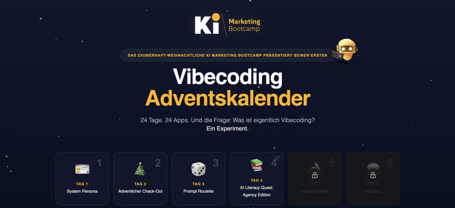 Dann melde dich bei uns! Für unseren Adventskalender haben wir noch Plätze frei, die wir gerne mit deiner Idee füllen möchten. Werde Teil unseres Experiments und lass uns gemeinsam zeigen, wie einfach und kreativ Vibecoding sein kann.