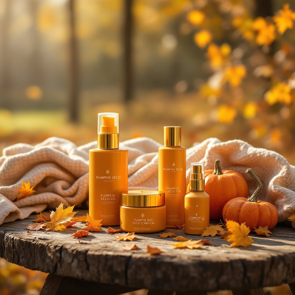 - Kürbiskernöl-Produkte auf Herbstlaub