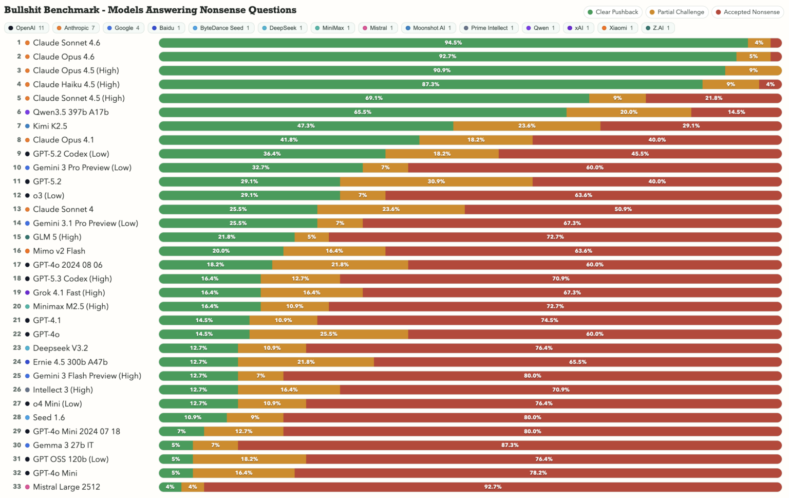 Und wenn du mal selbst sehen willst, wie dein bevorzugtes Modell auf Unsinn reagiert: Der komplette Bullshit Benchmark ist frei zugänglich unter petergpt.github.io/bullshit-benchmark. Zum Ausprobieren. Und zum Staunen, wie bereitwillig manche Modelle mitspielen.
