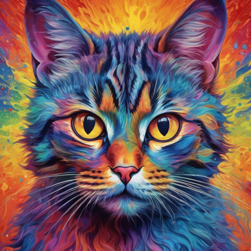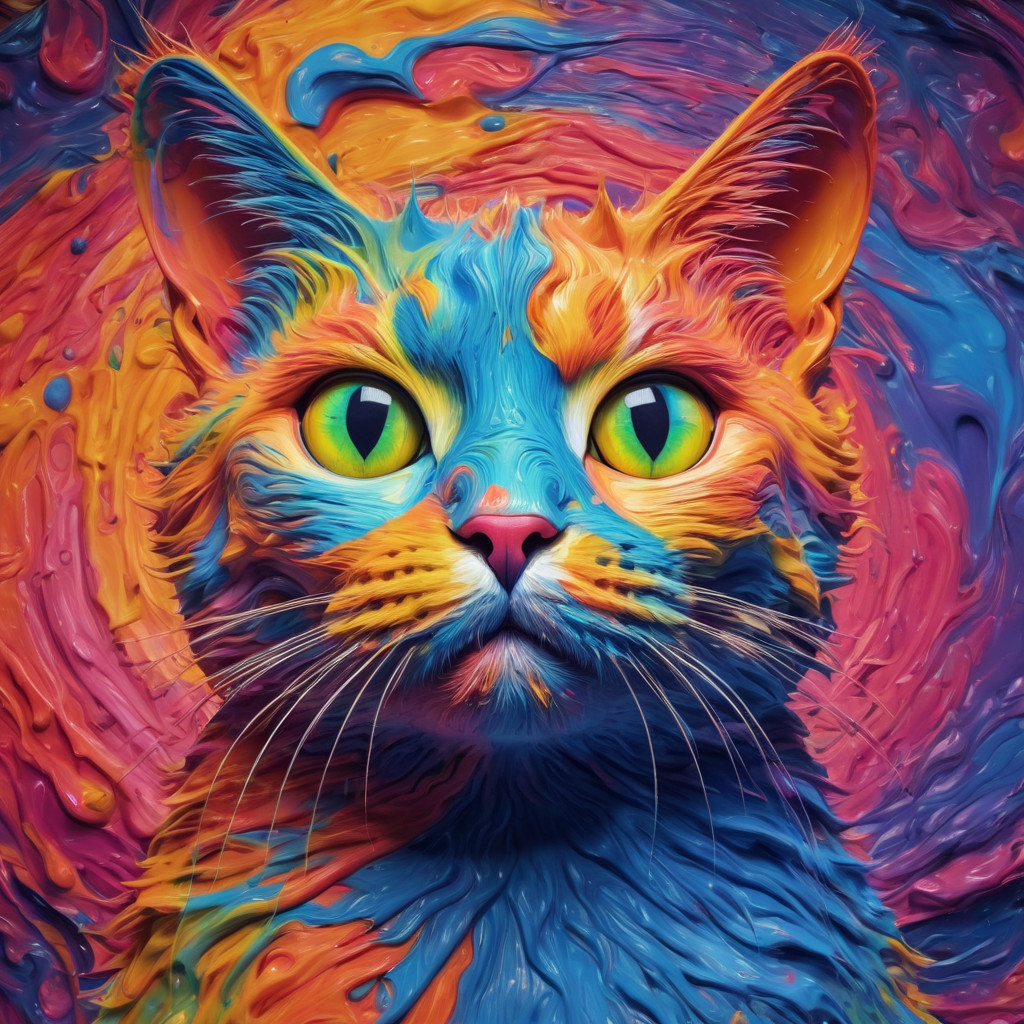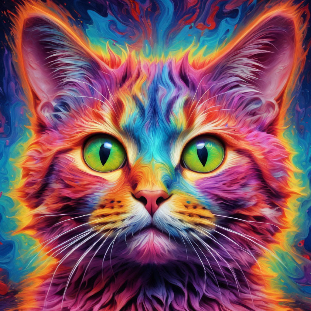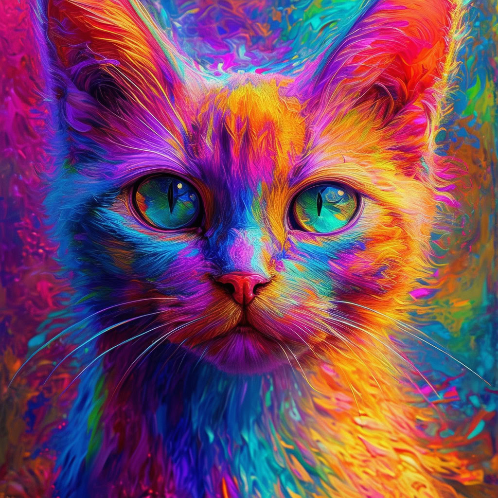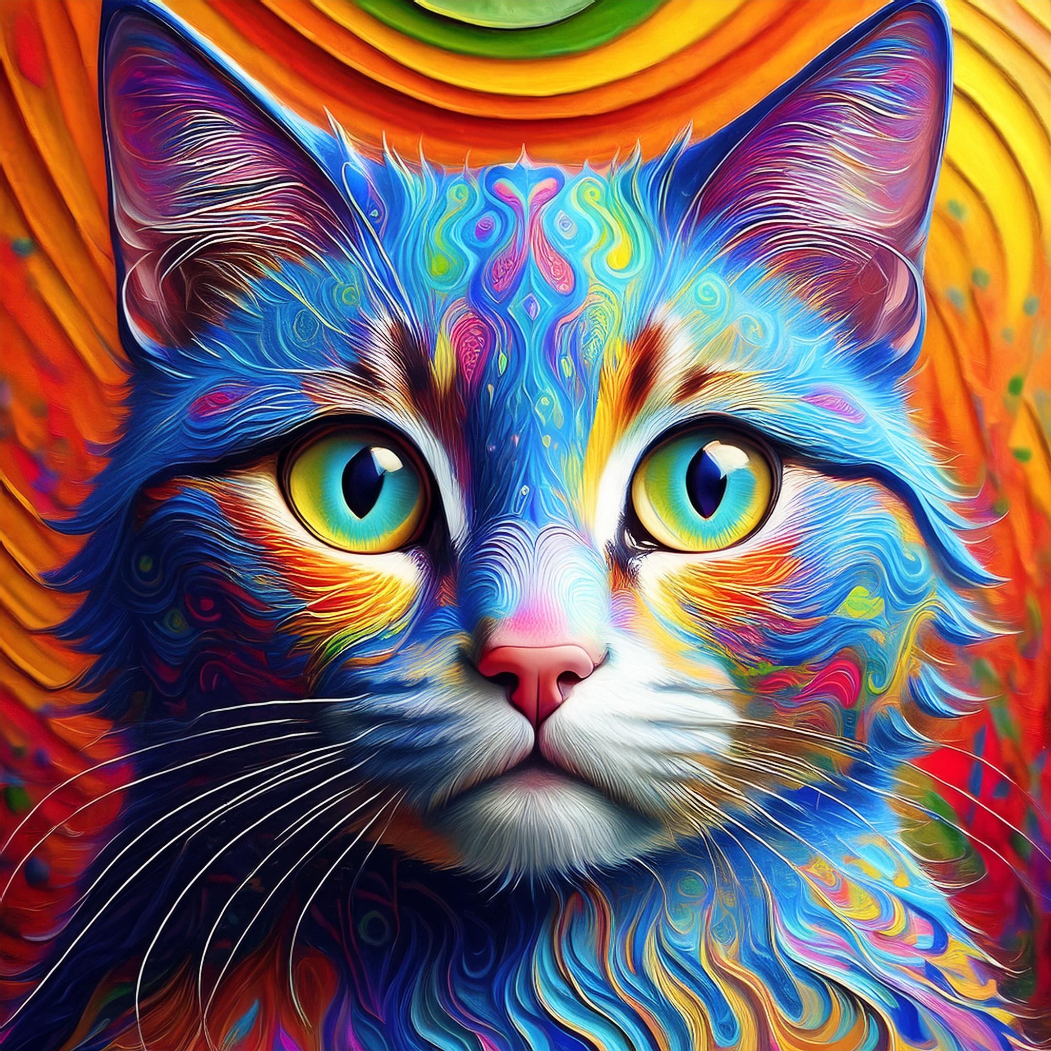 Prompt: fantasy 3d illustration of a colorful cat, centered, looking at viewer, psychedelic art, abstract, ehemeral, elusive and unstable, psychedelic background, oil painting texture