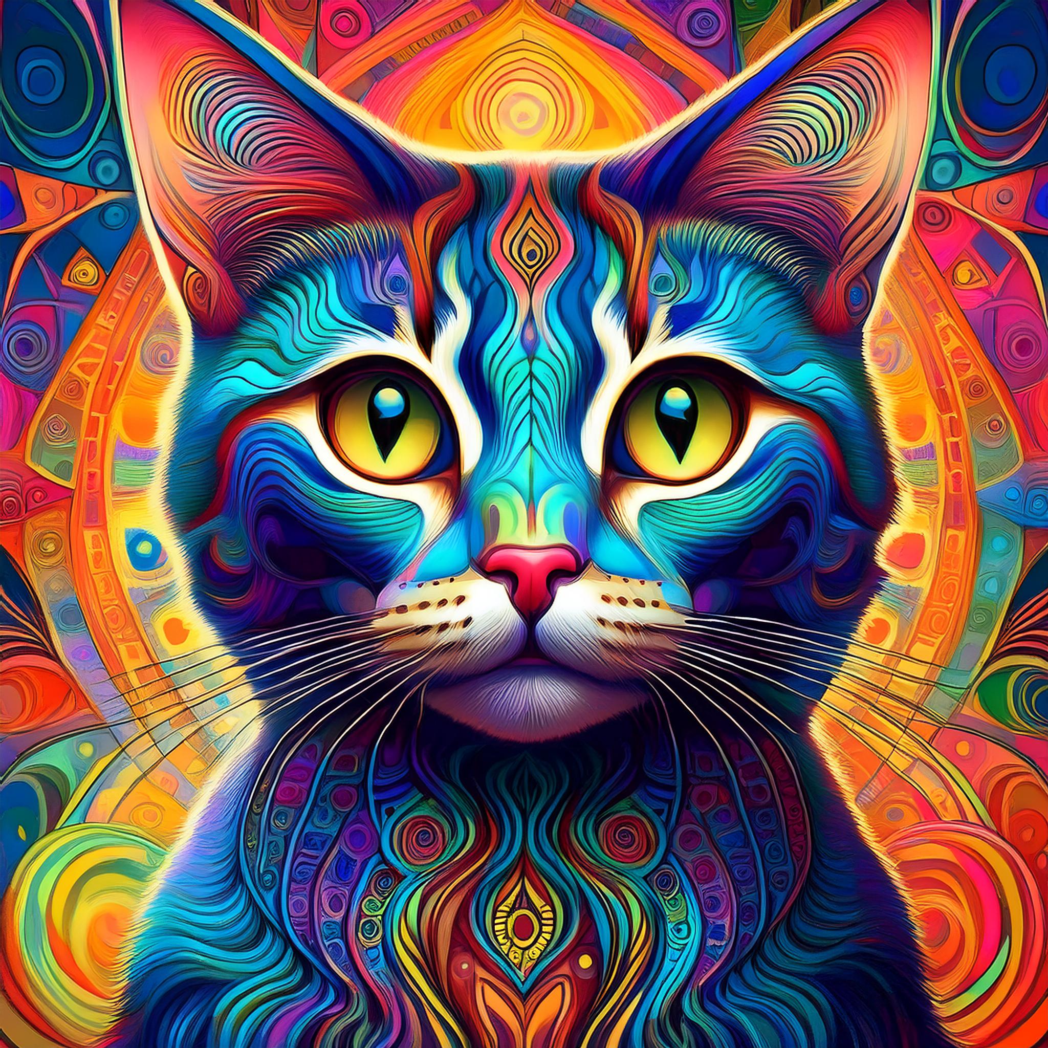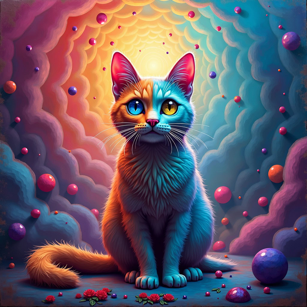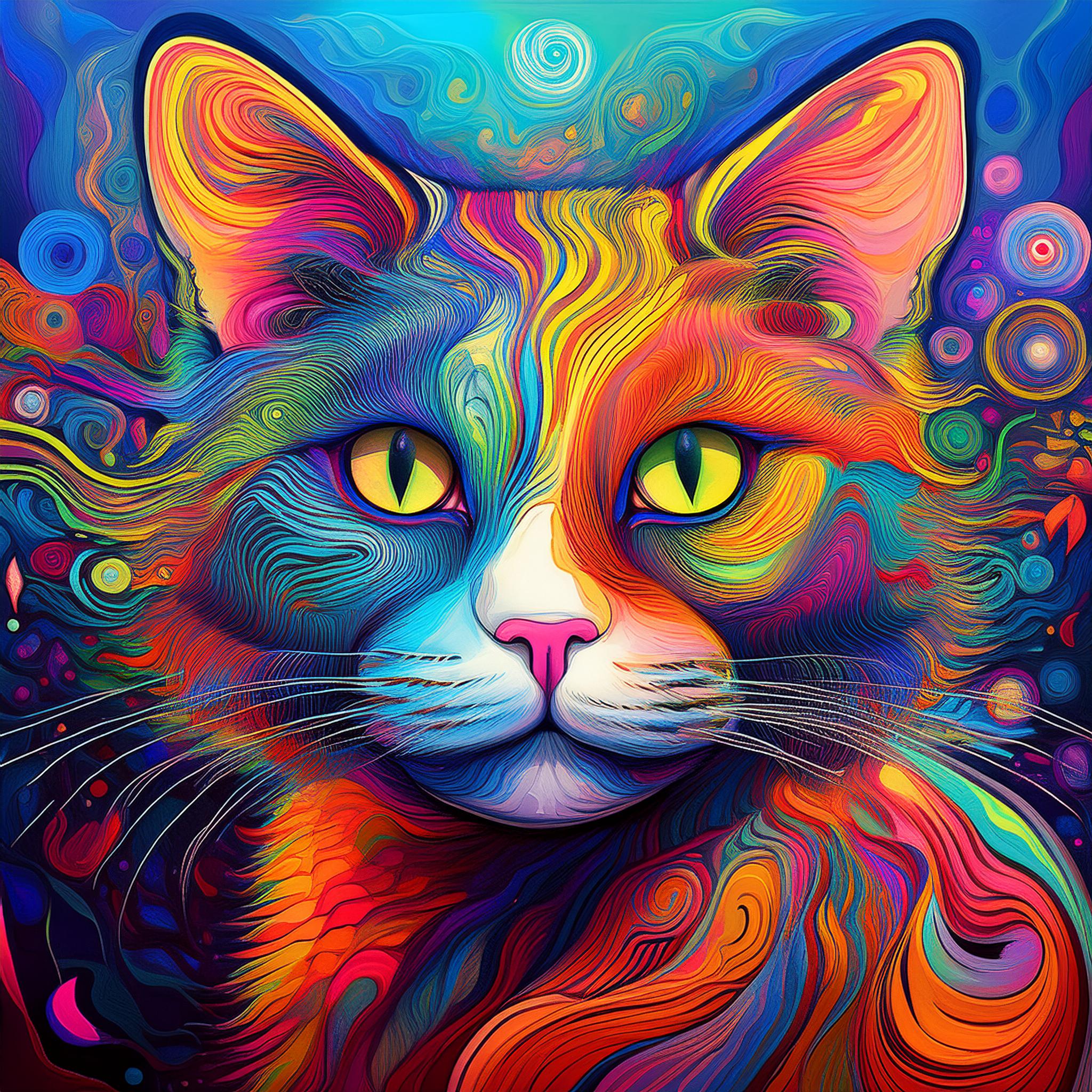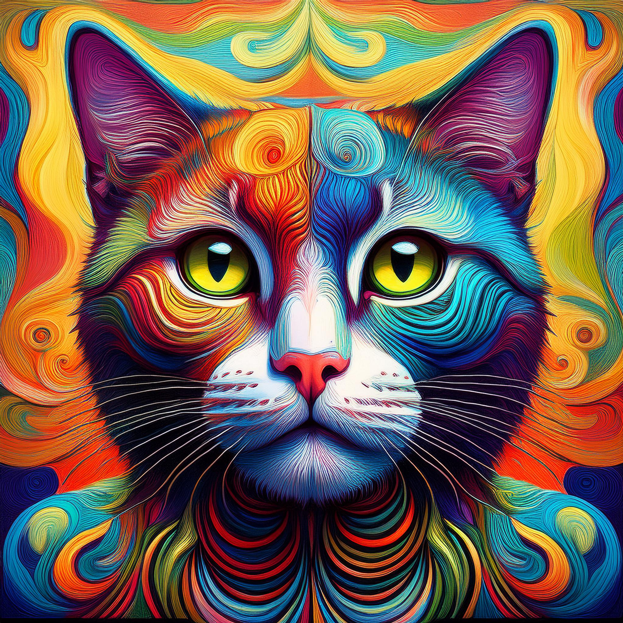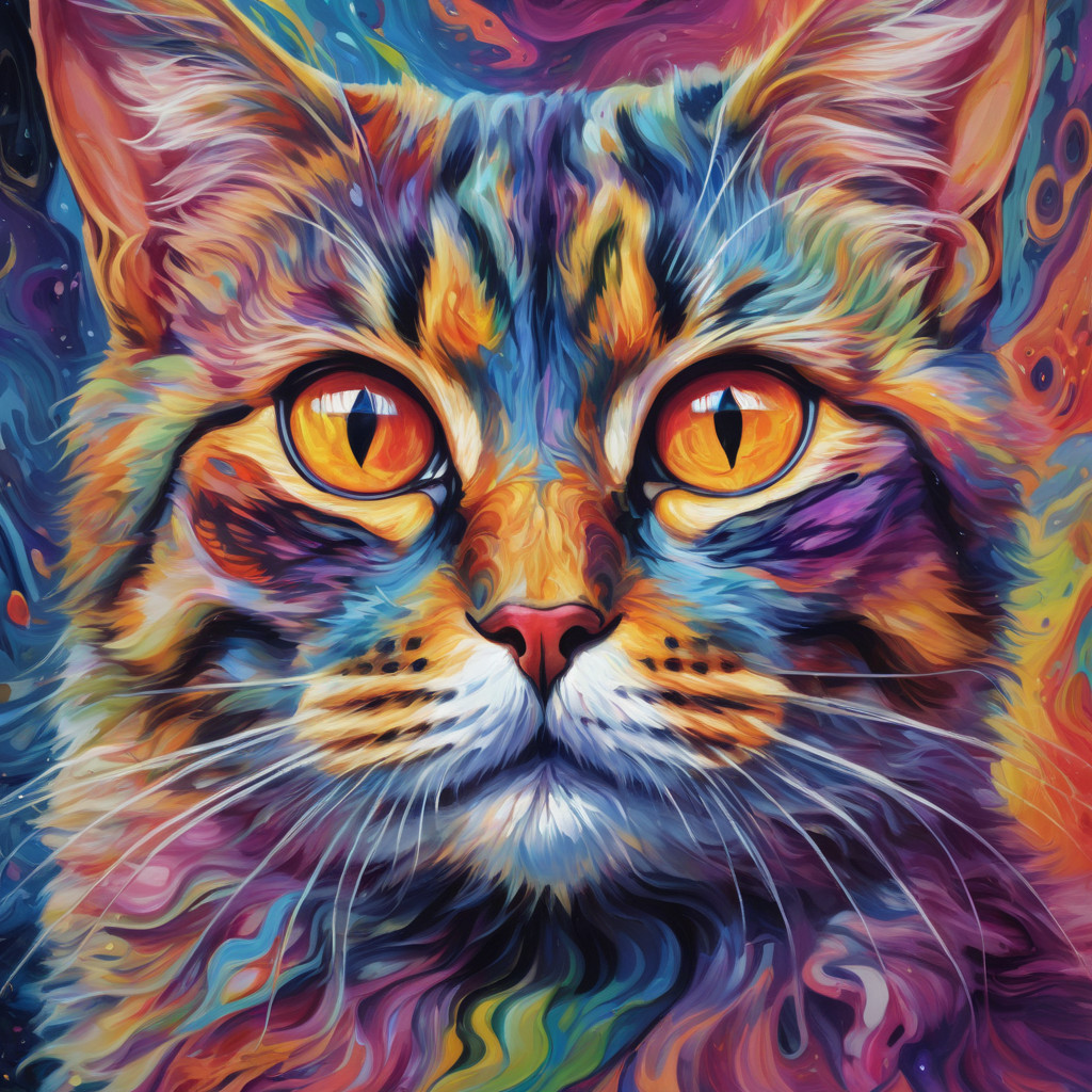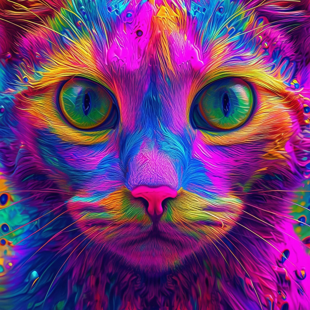 Prompt: fantasy 3d illustration of a colorful cat, centered, looking at viewer, psychedelic art, abstract, ehemeral, elusive and unstable, psychedelic background, oil painting texture