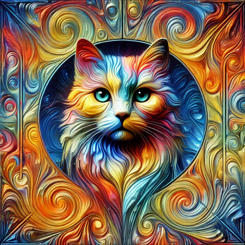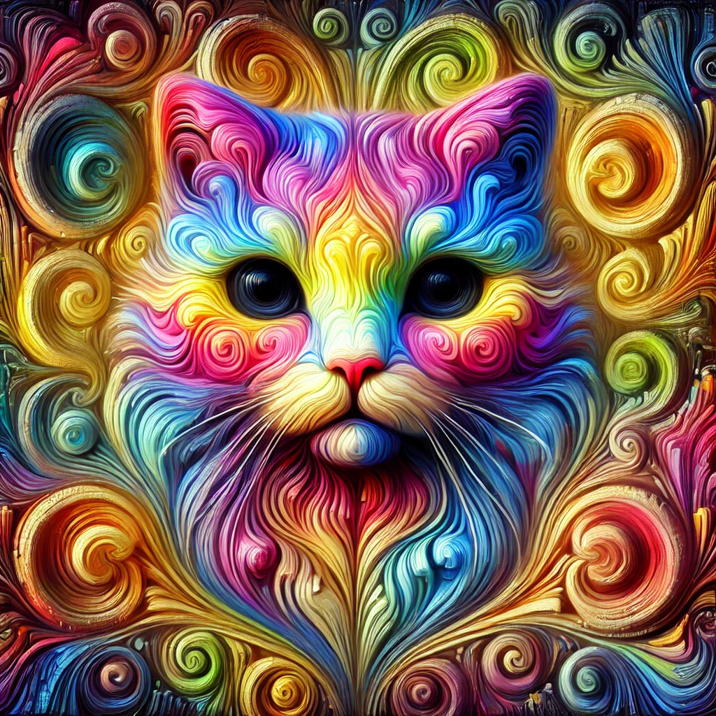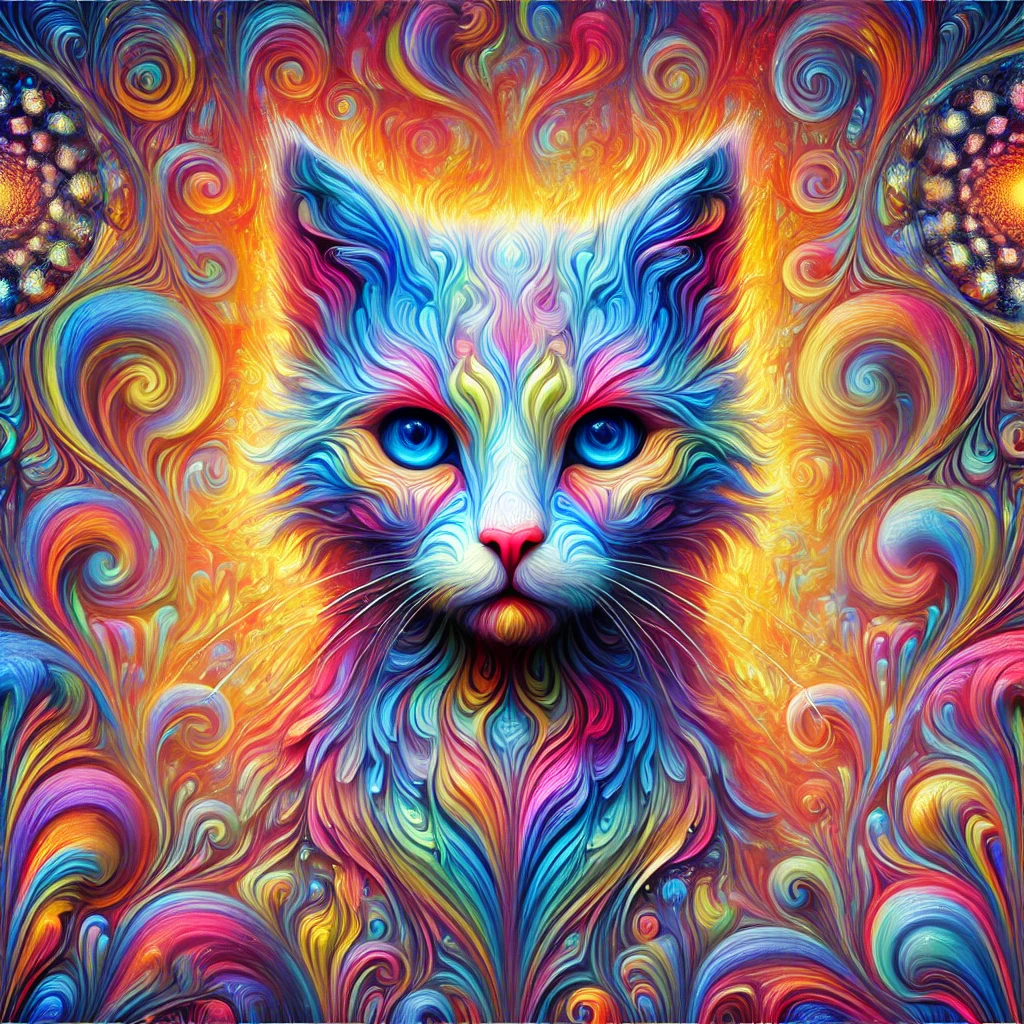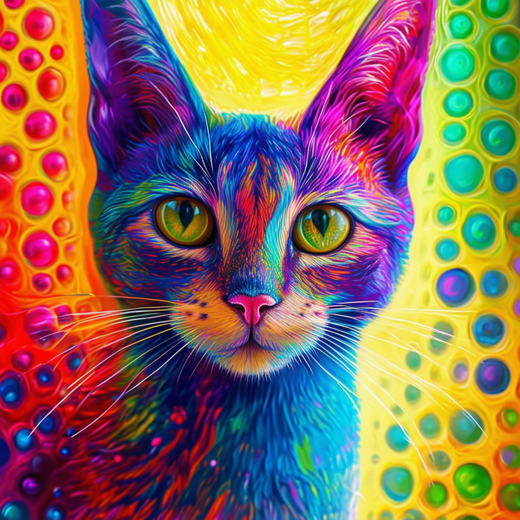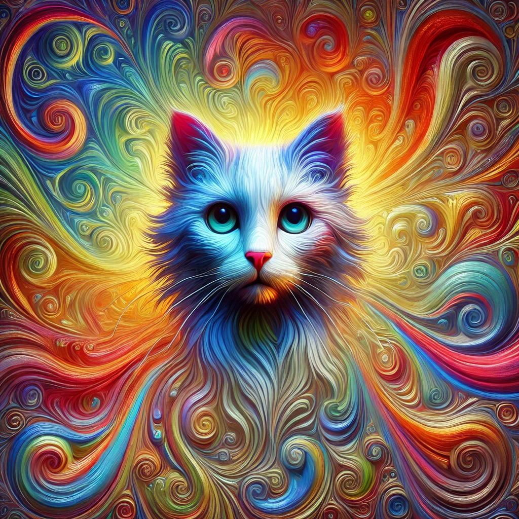 Prompt: fantasy 3d illustration of a colorful cat, centered, looking at viewer, psychedelic art, abstract, ehemeral, elusive and unstable, psychedelic background, oil painting texture