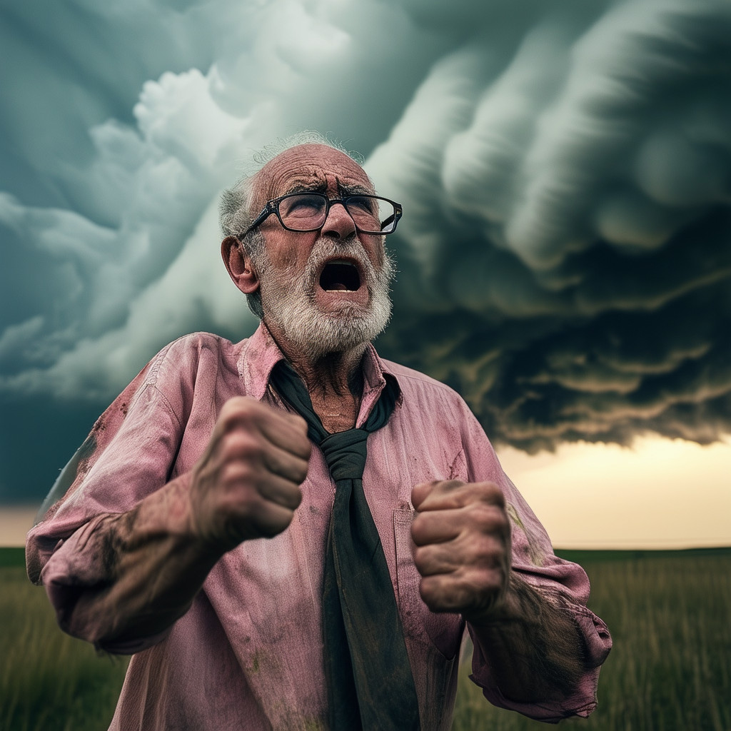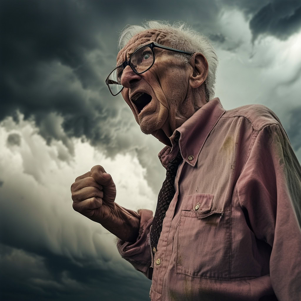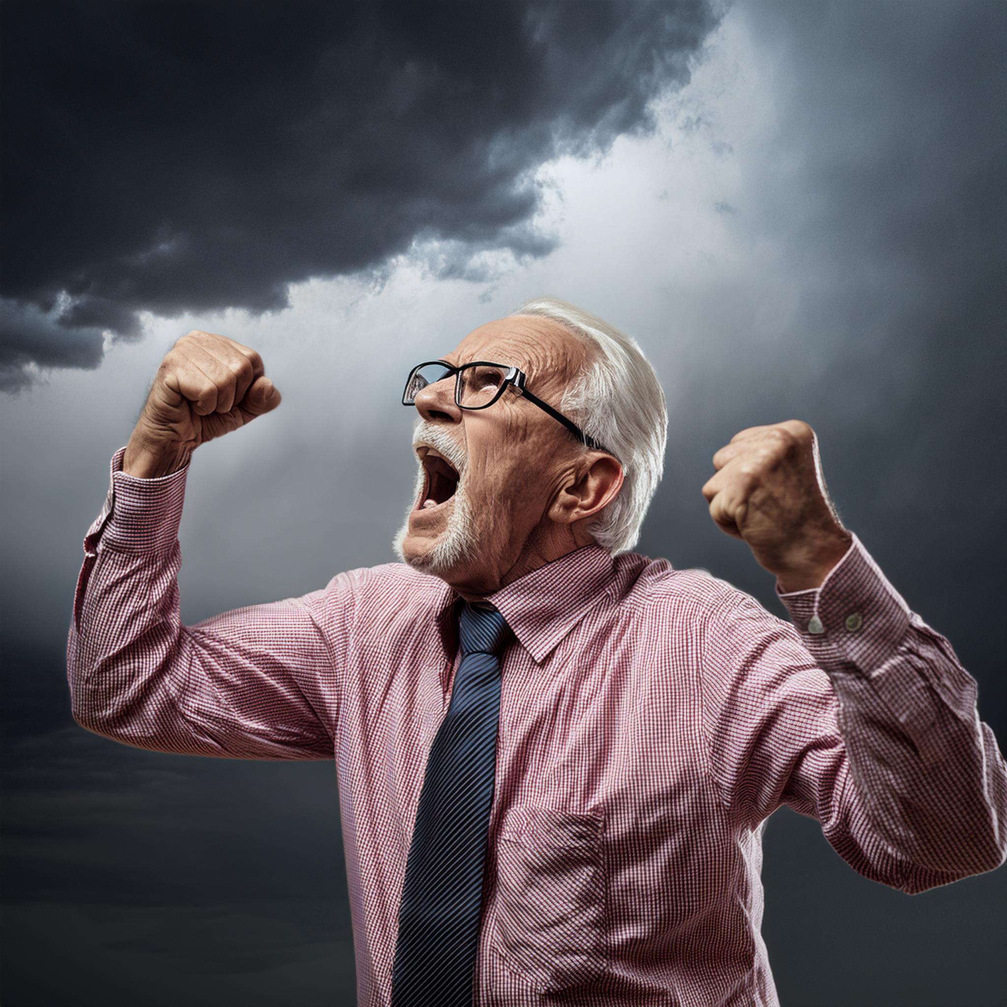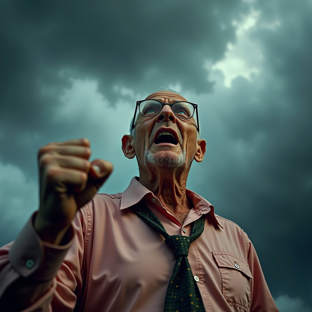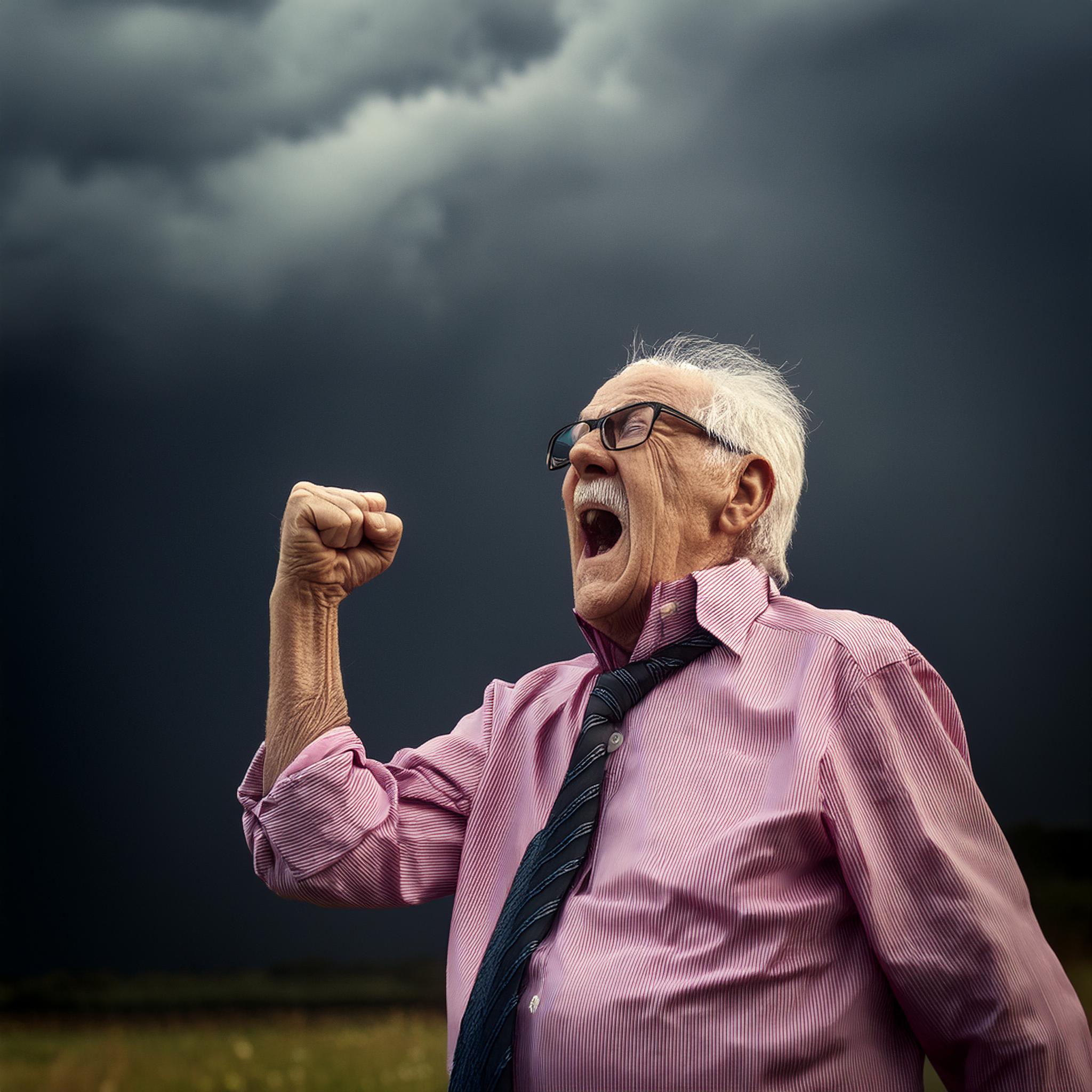 Prompt: photo of a frail old man with clenched fist yelling wearing glasses and an old faded pinkish shirt with a tie around his neck and looking at a threatening storm cloud, cinematic, detailed, atmospheric, dramatic light