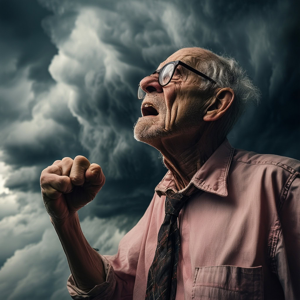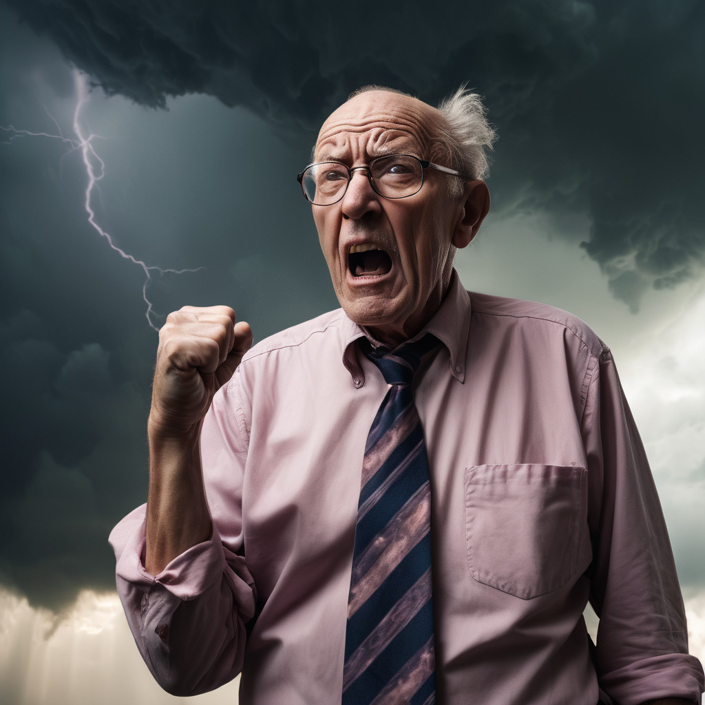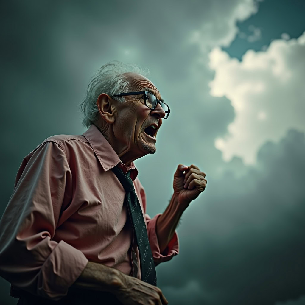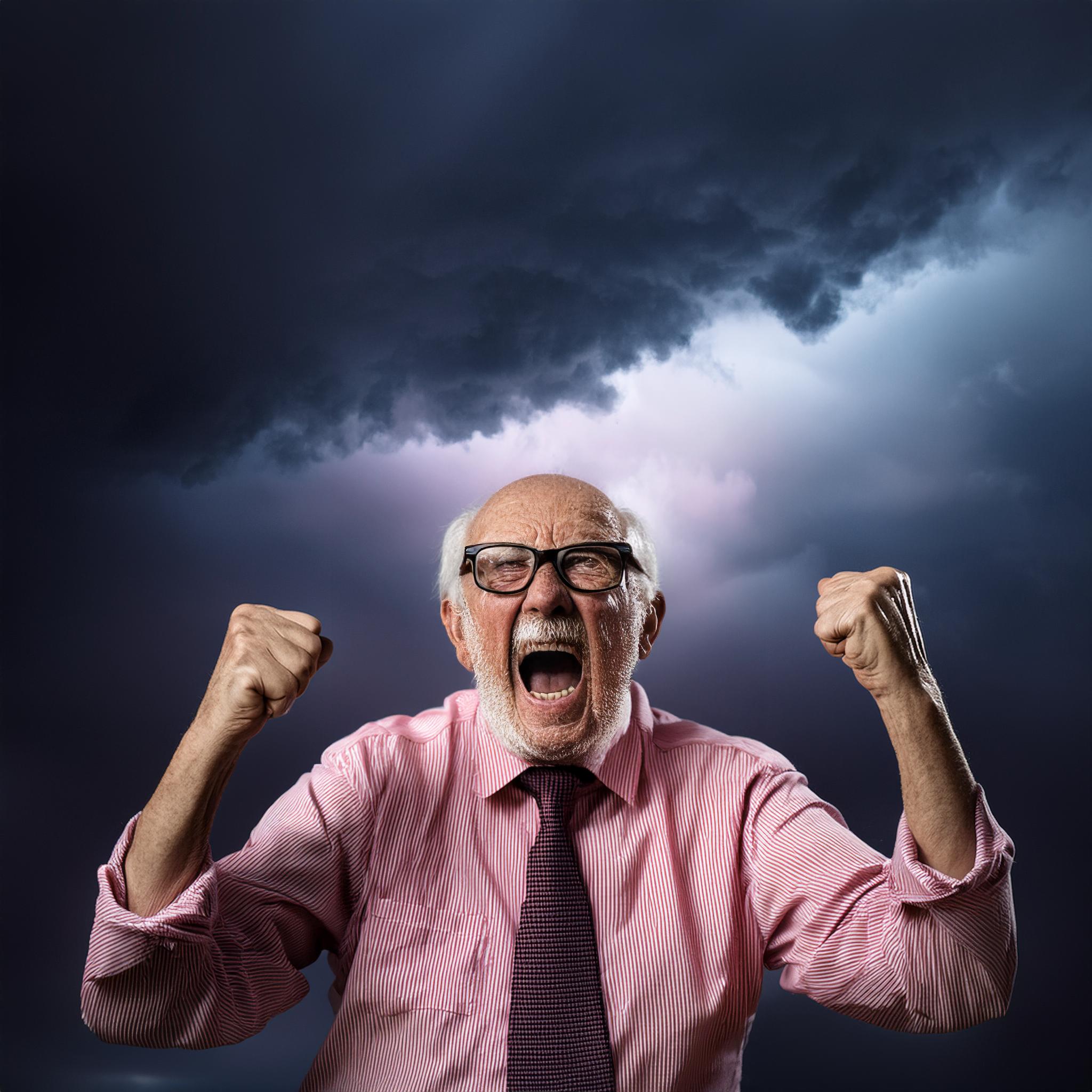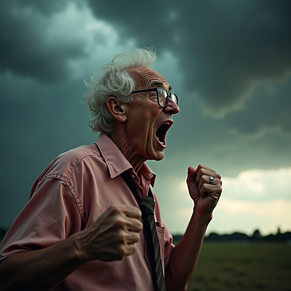 Prompt: photo of a frail old man with clenched fist yelling wearing glasses and an old faded pinkish shirt with a tie around his neck and looking at a threatening storm cloud, cinematic, detailed, atmospheric, dramatic light