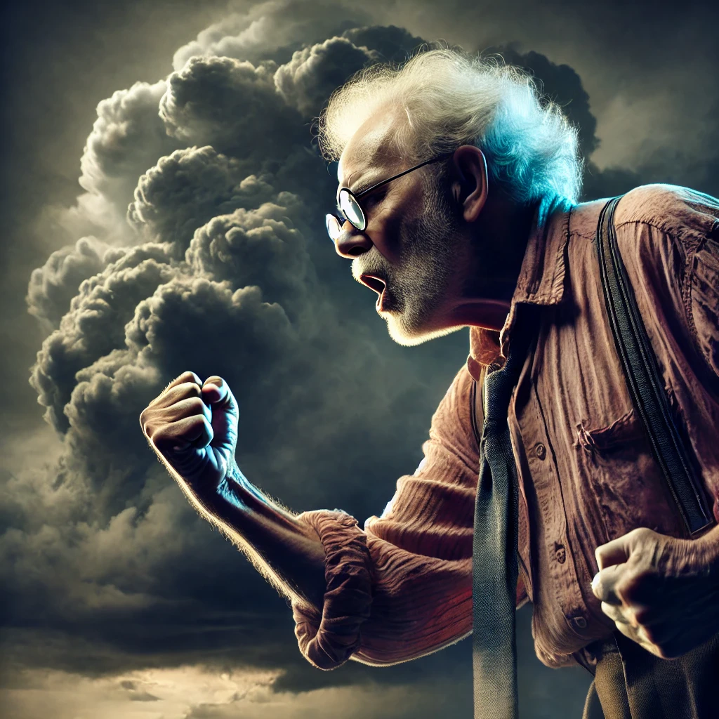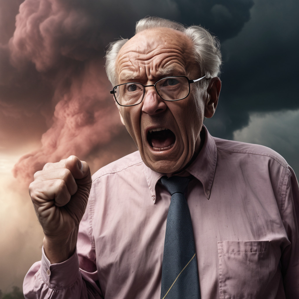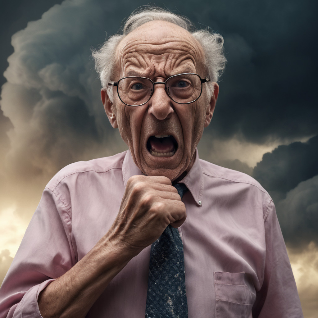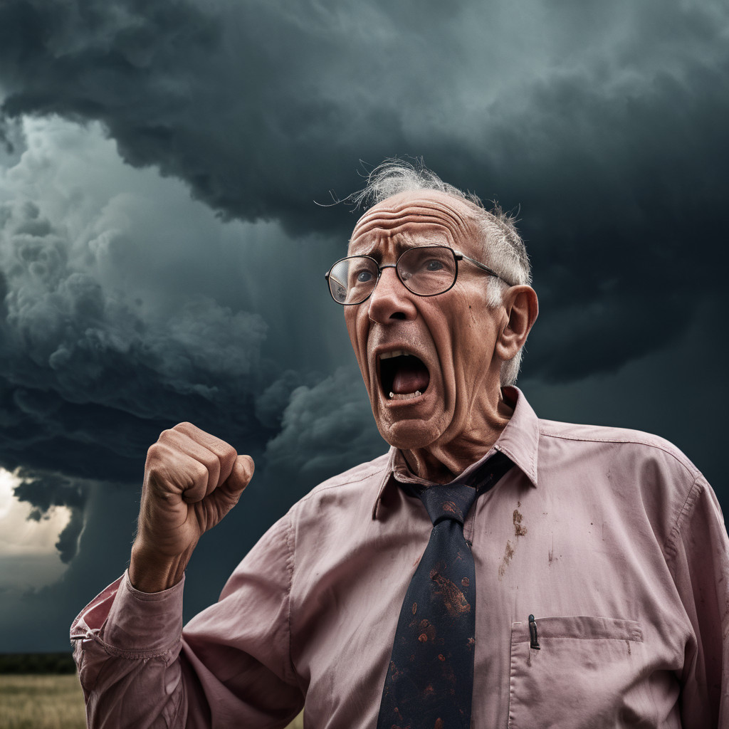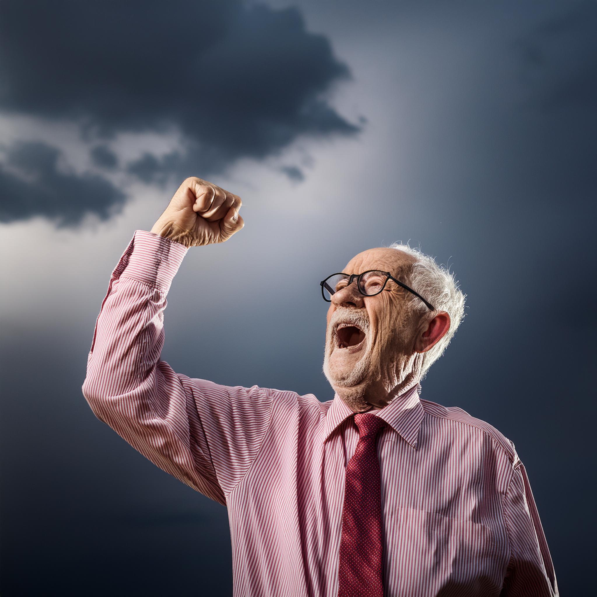 Prompt: photo of a frail old man with clenched fist yelling wearing glasses and an old faded pinkish shirt with a tie around his neck and looking at a threatening storm cloud, cinematic, detailed, atmospheric, dramatic light
