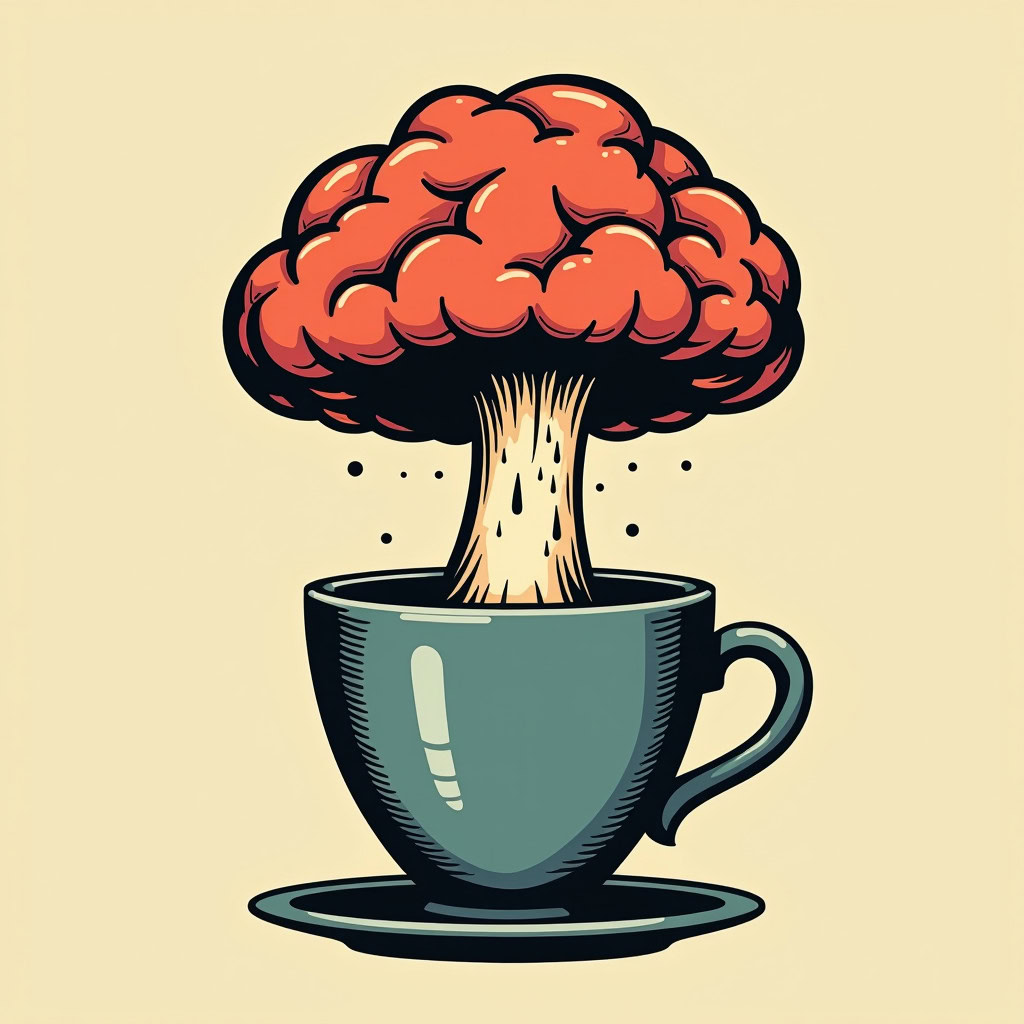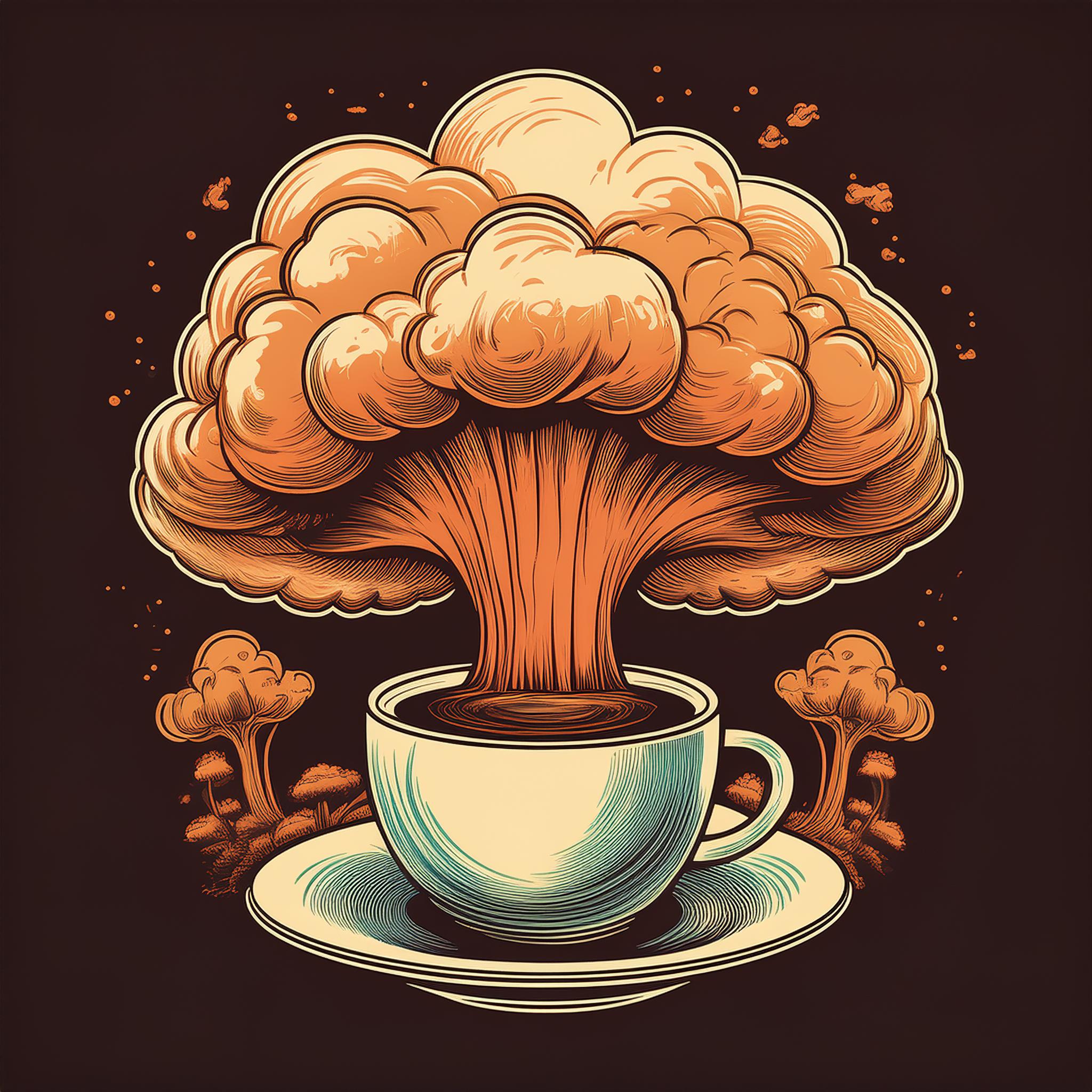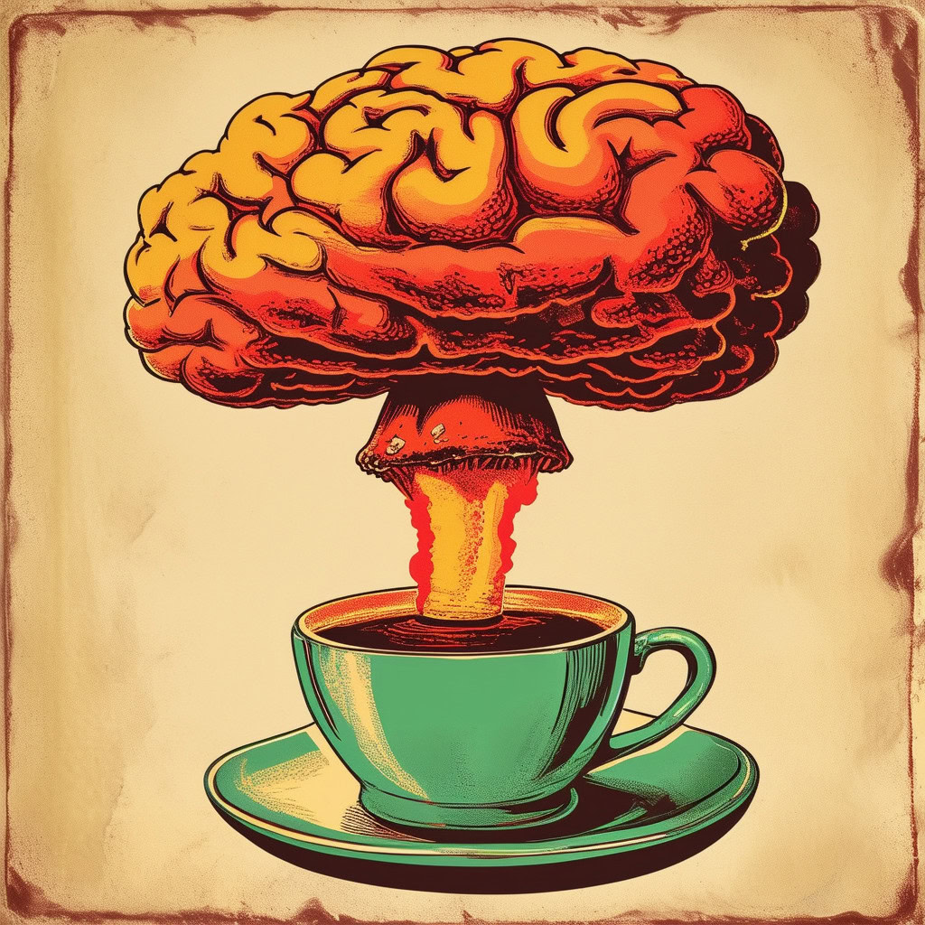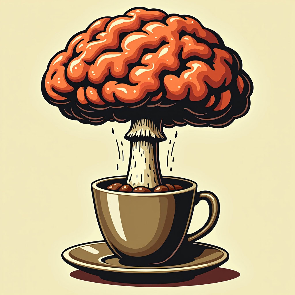 Prompt: Coffee logo, featuring a mushroom cloud coming out of a cup, the cloud looks like brains, full colour print, vintage colours, 1960s