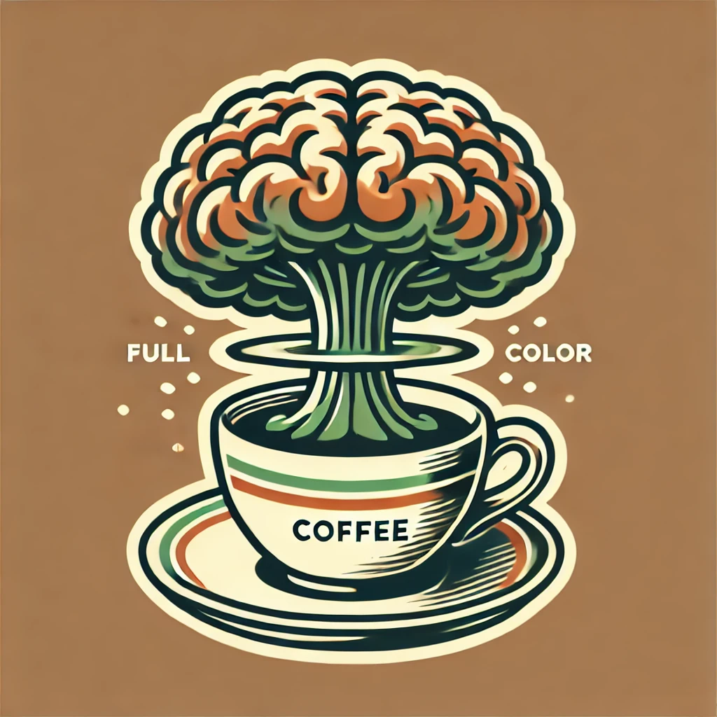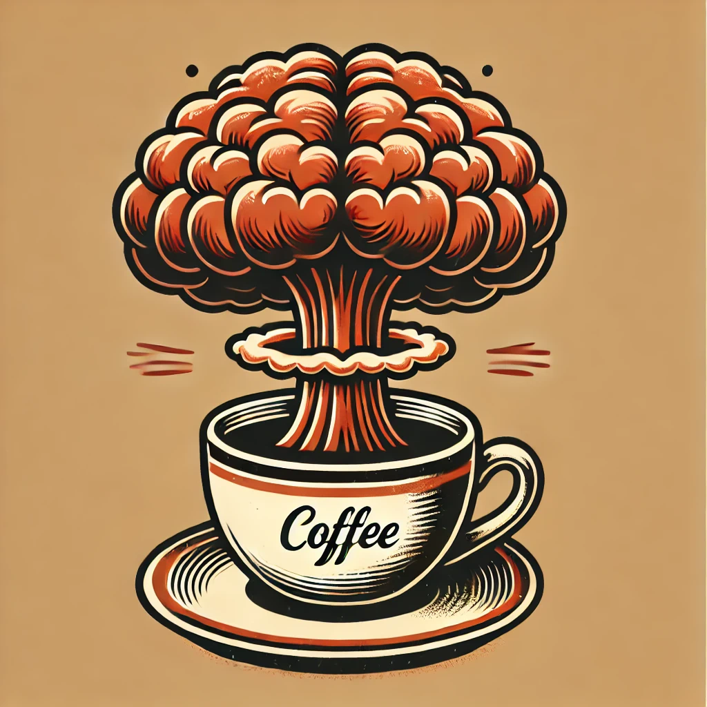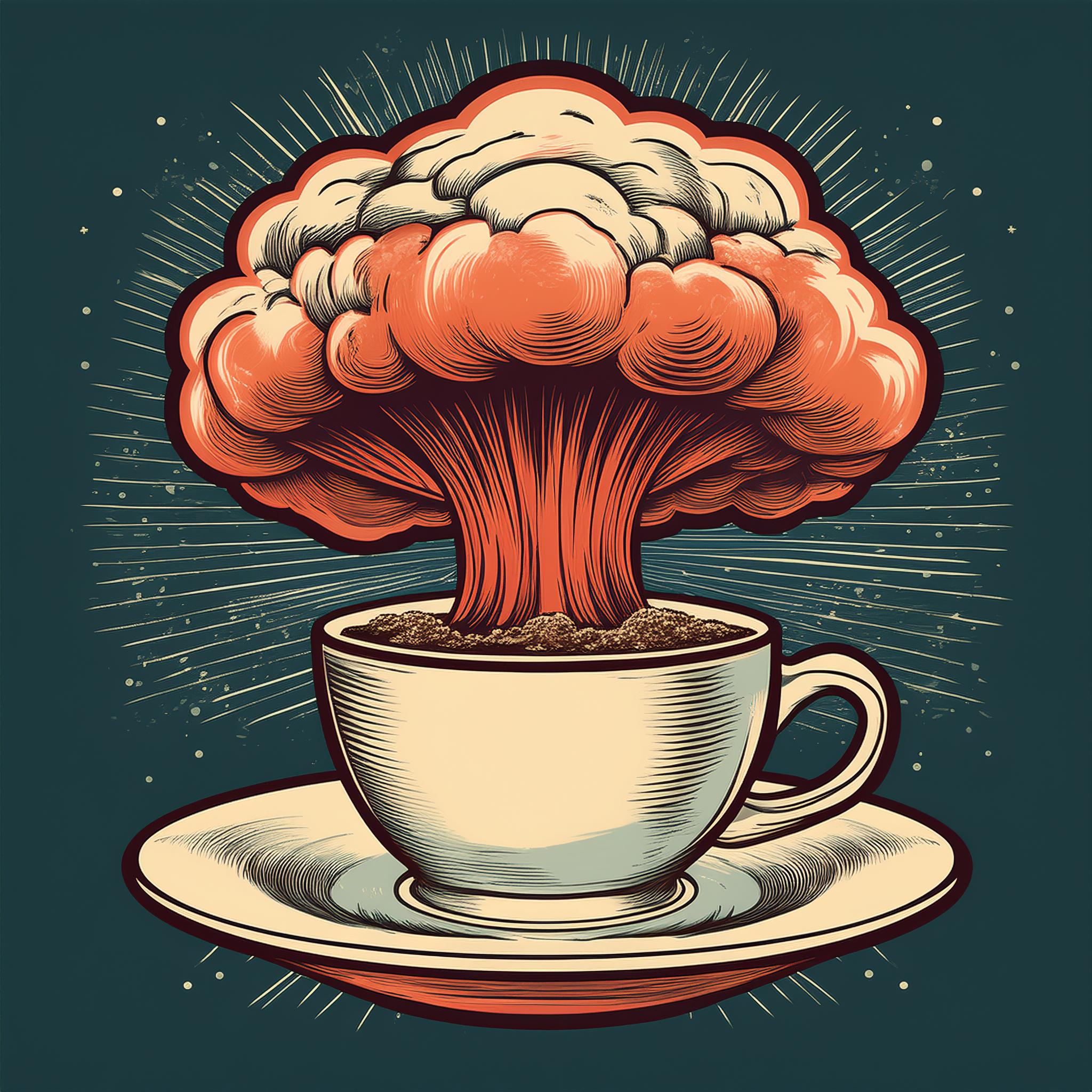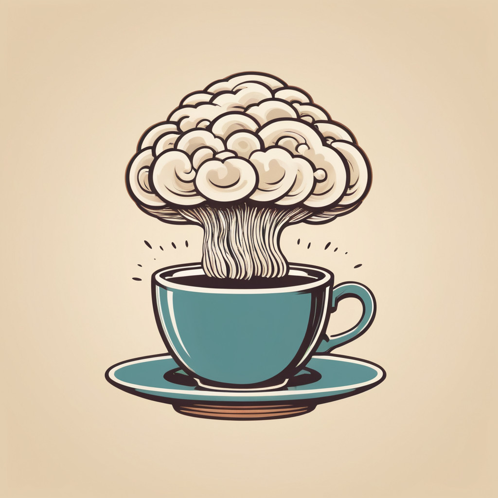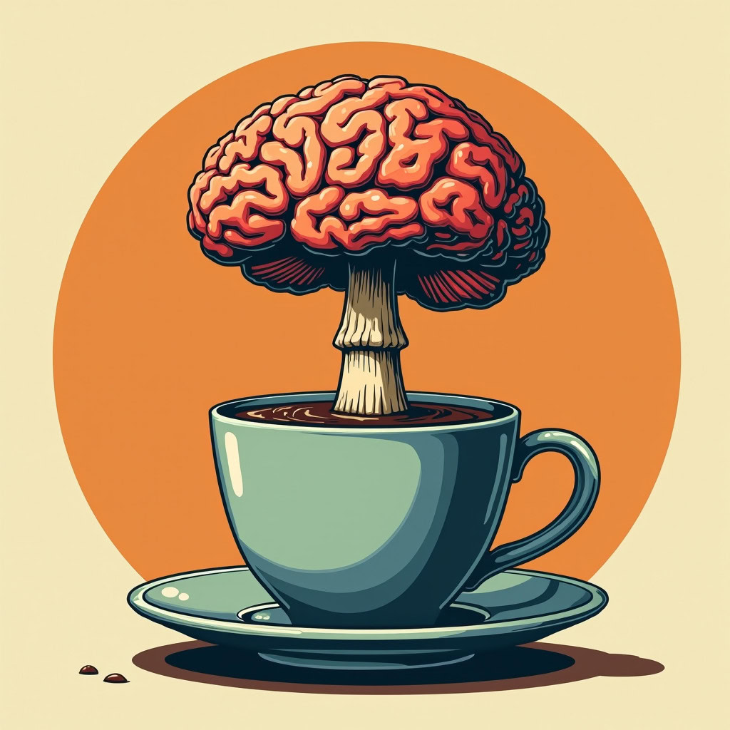 Prompt: Coffee logo, featuring a mushroom cloud coming out of a cup, the cloud looks like brains, full colour print, vintage colours, 1960s