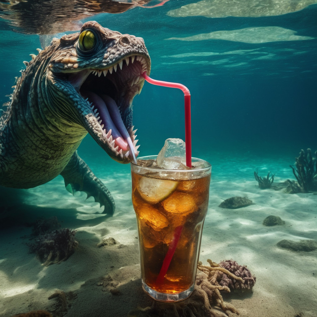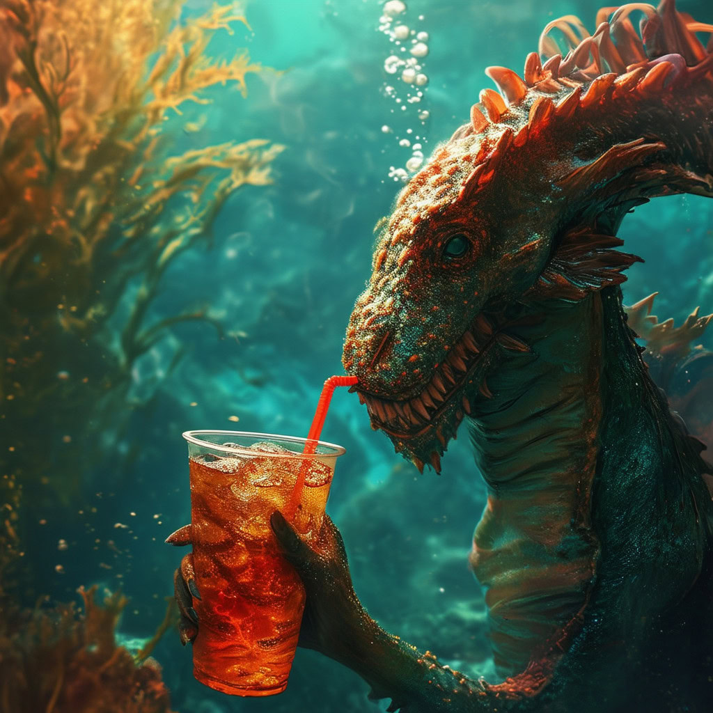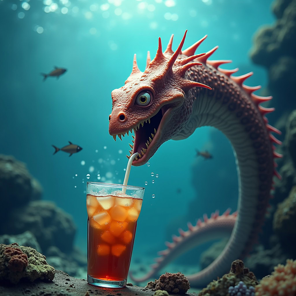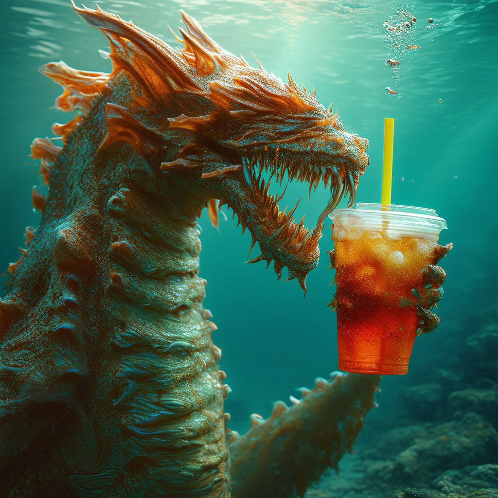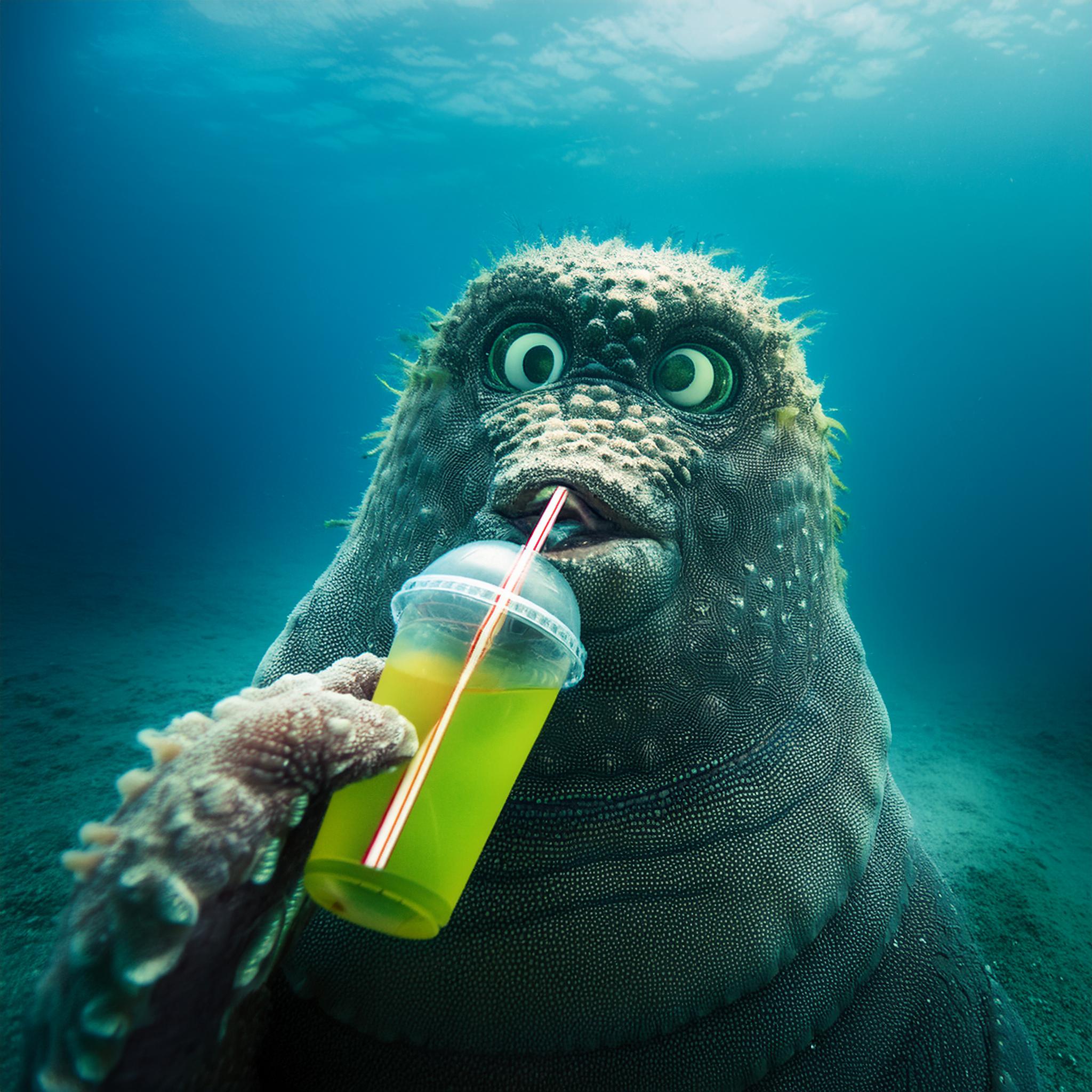 Prompt: photo of a sea monster drinking a soda with a drinking straw, underwater, deep sea, fantasy, abstract