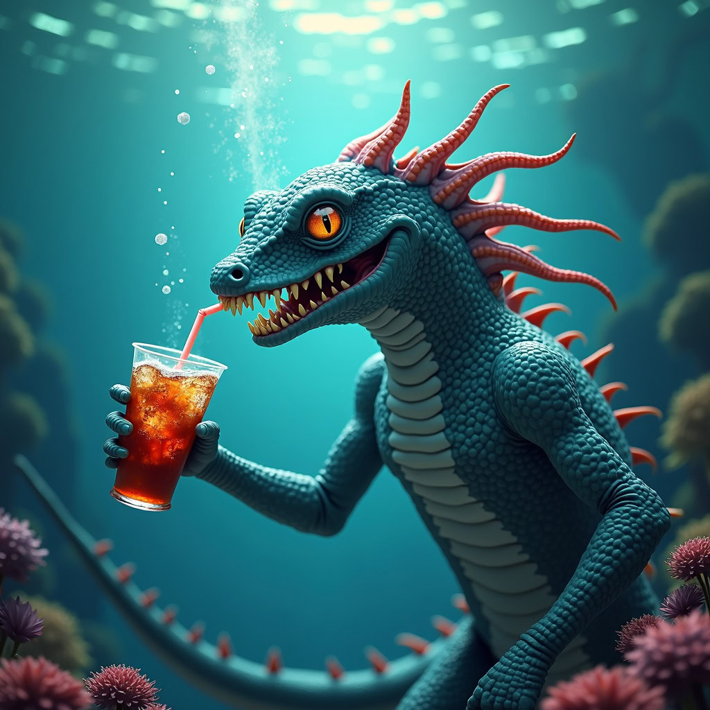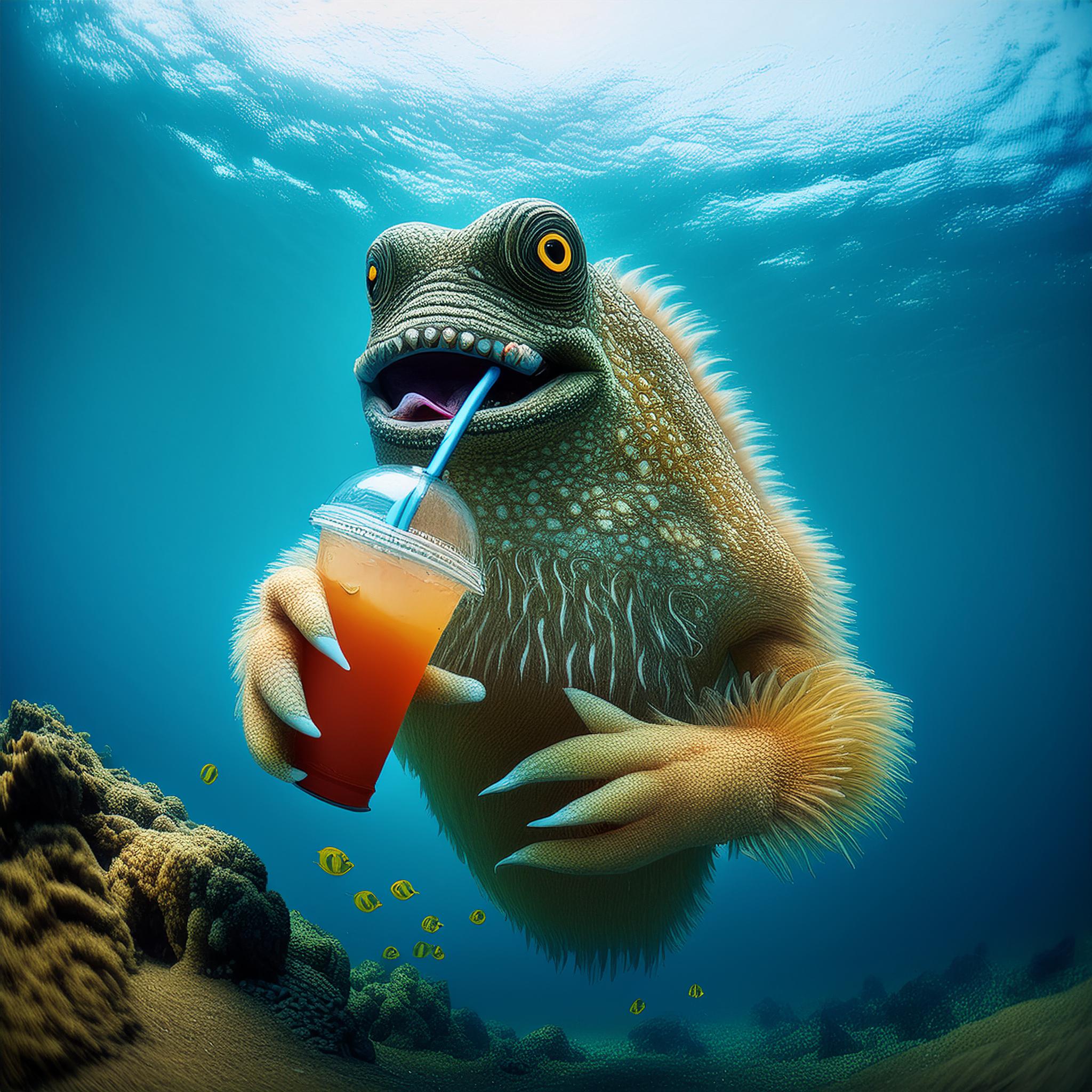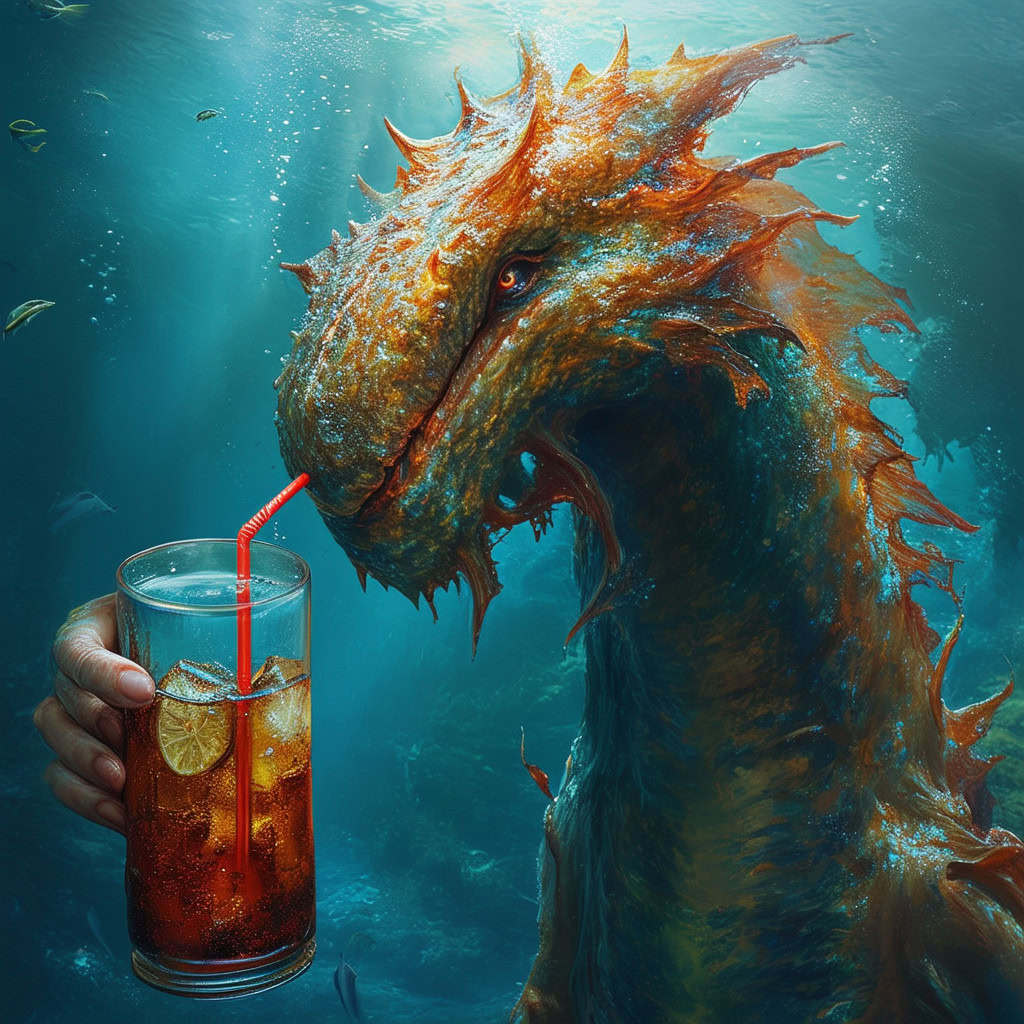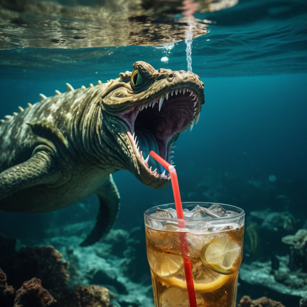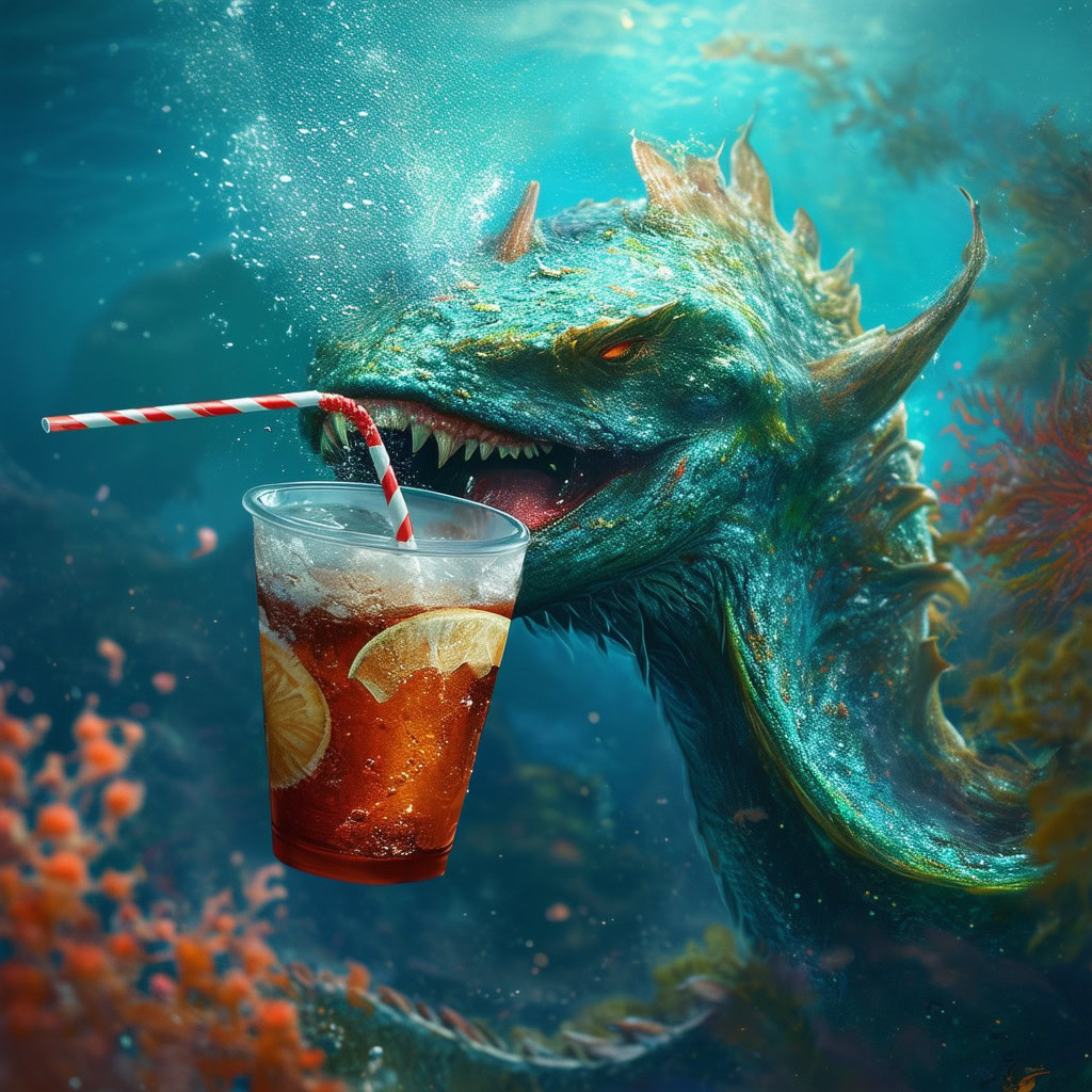 Prompt: photo of a sea monster drinking a soda with a drinking straw, underwater, deep sea, fantasy, abstract