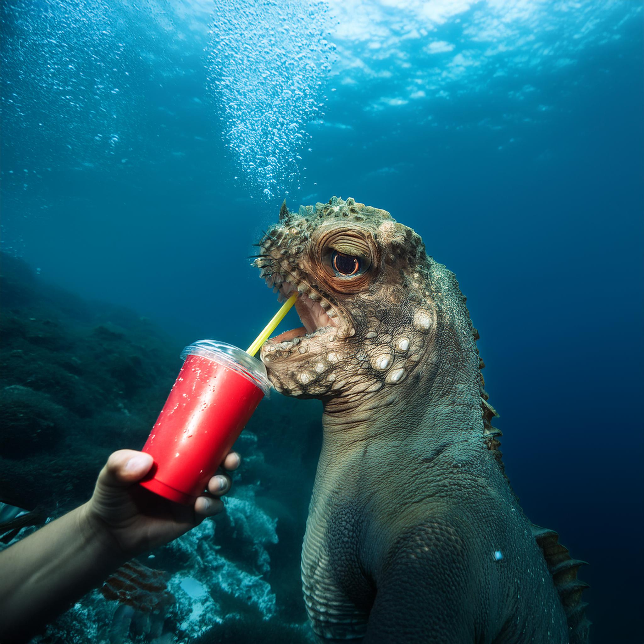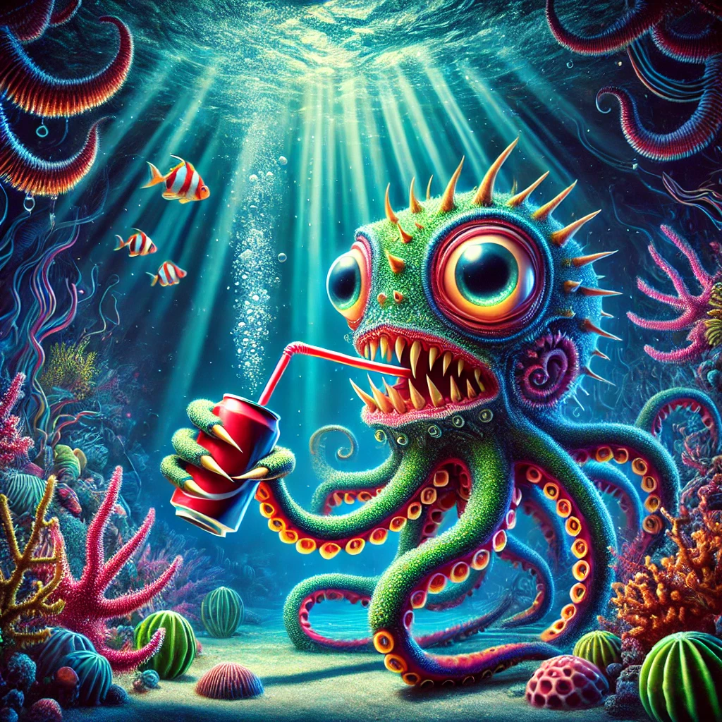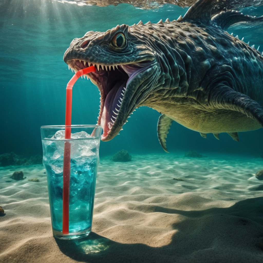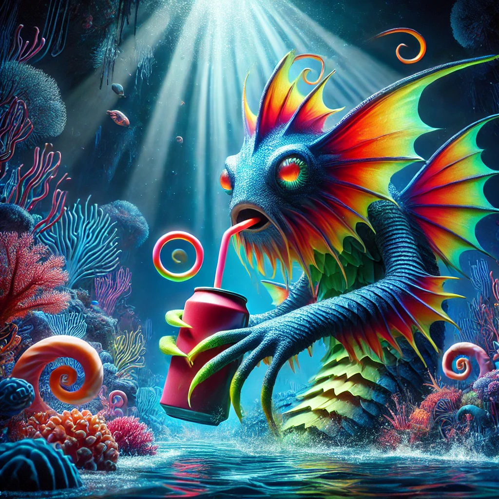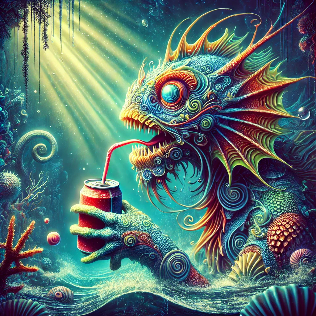 Prompt: photo of a sea monster drinking a soda with a drinking straw, underwater, deep sea, fantasy, abstract