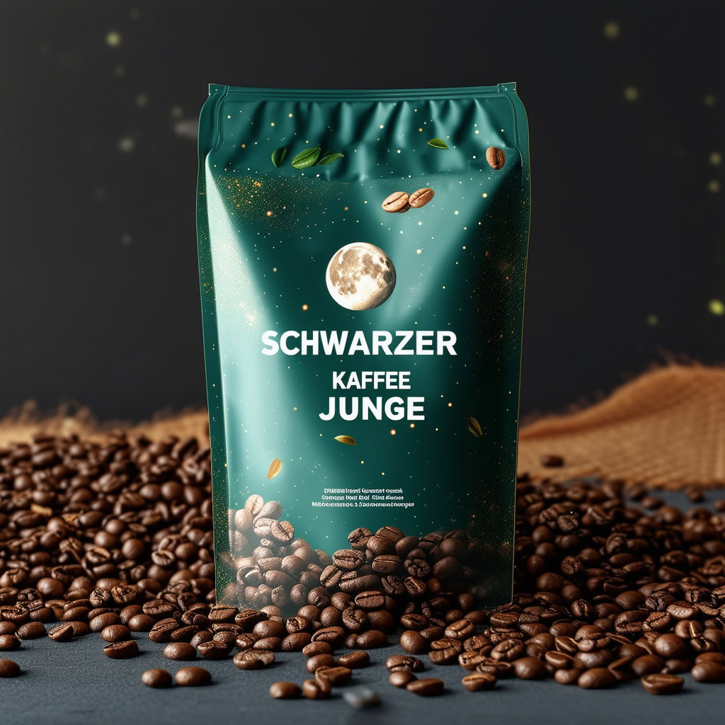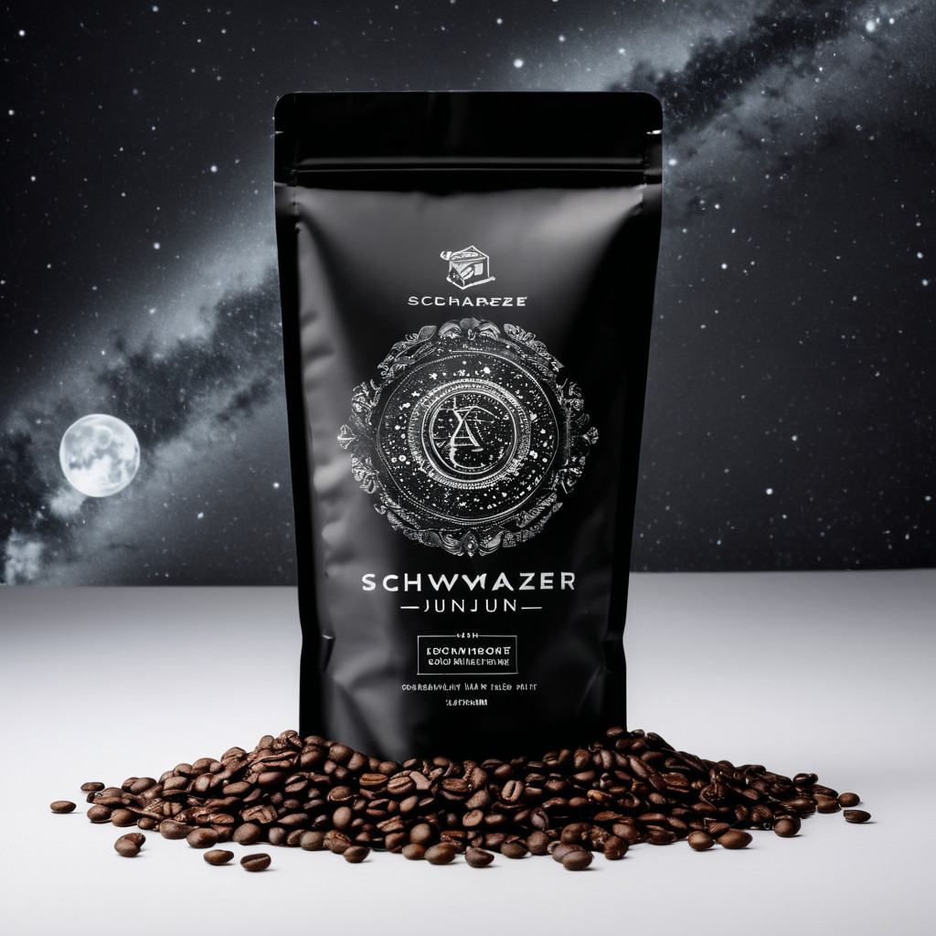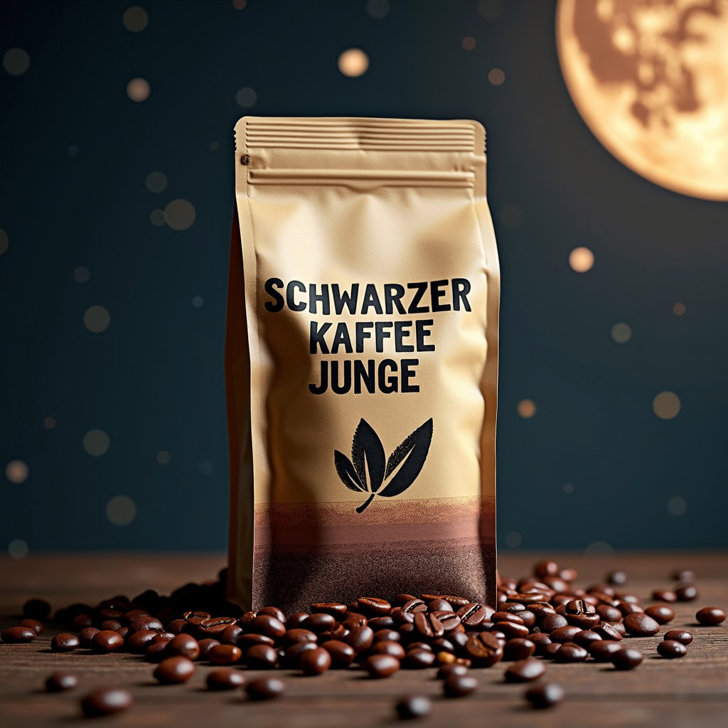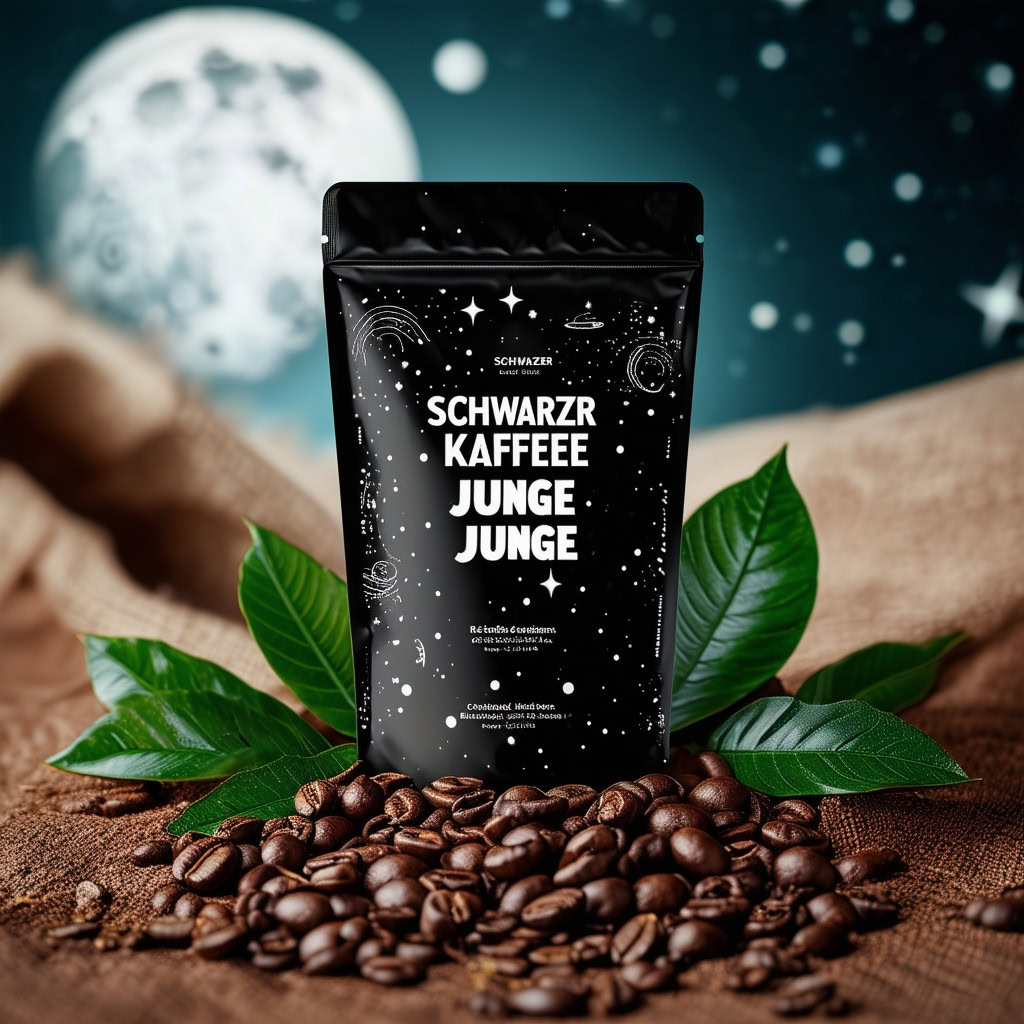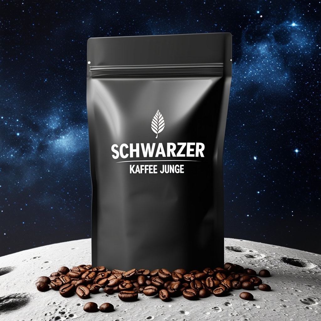 Prompt: a realistic standup pouch product photo mockup decorated with coffee beans and Coffee-leaves with the words „SCHWARZER KAFFEE JUNGE“ featured prominently, scifi, on the moon, space, stars, night