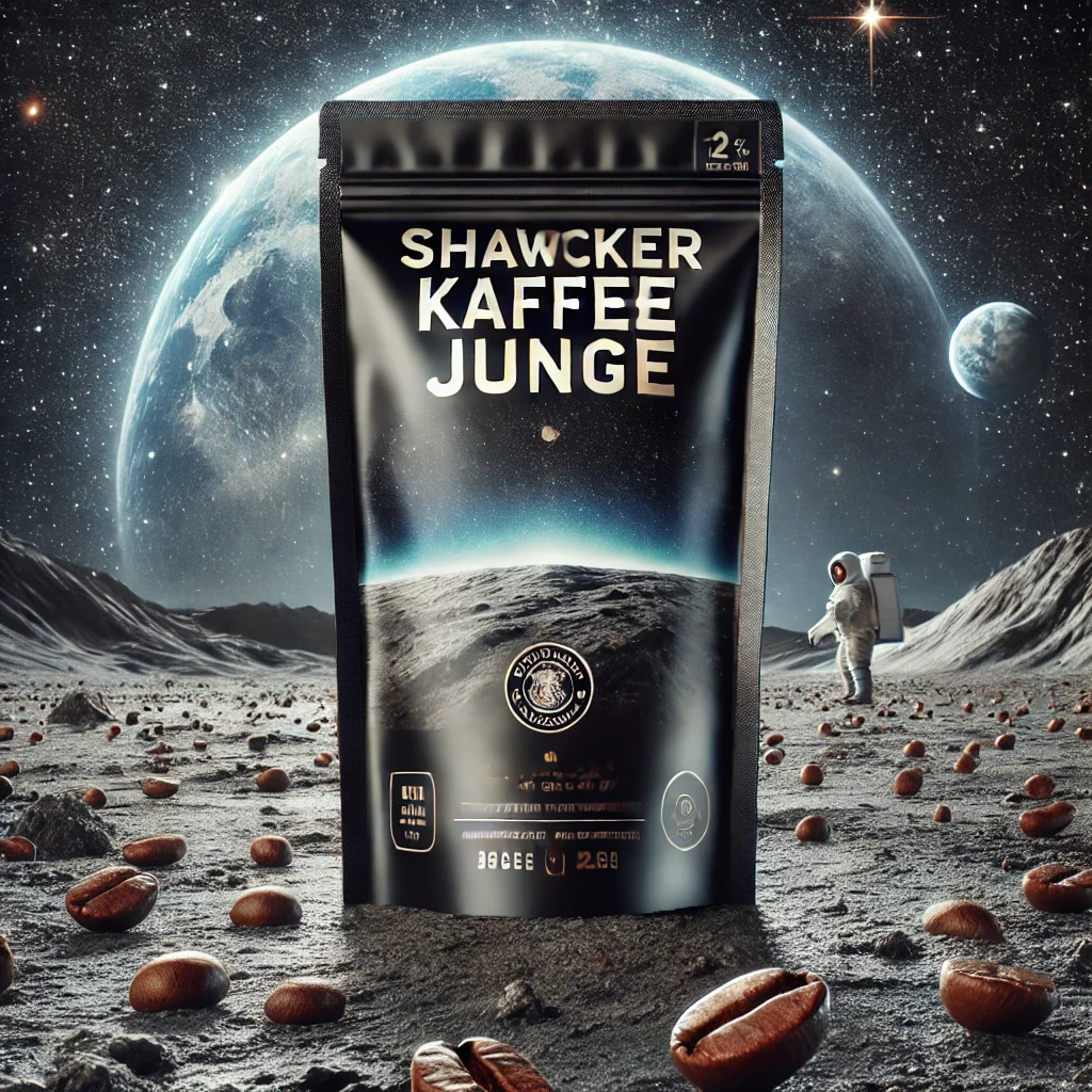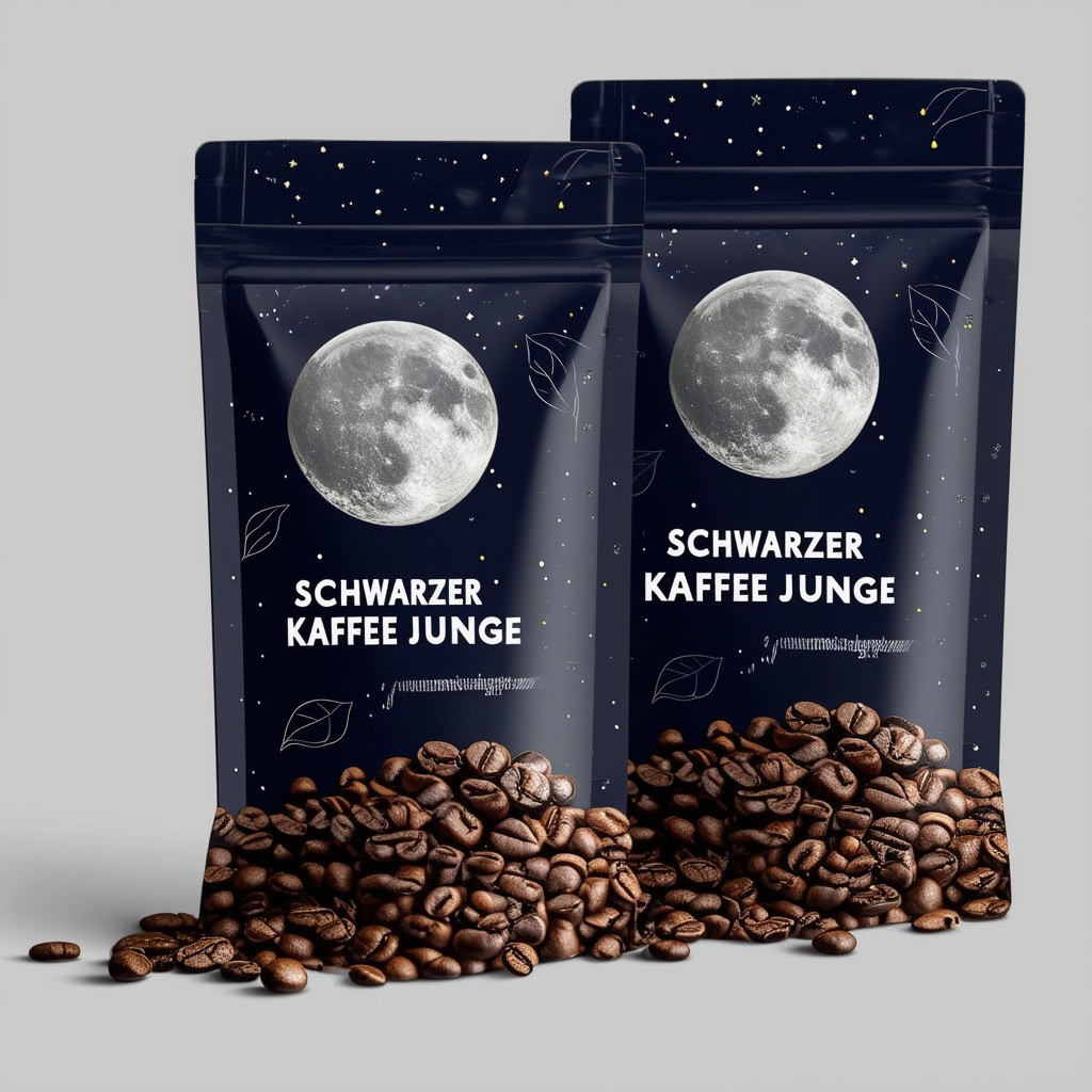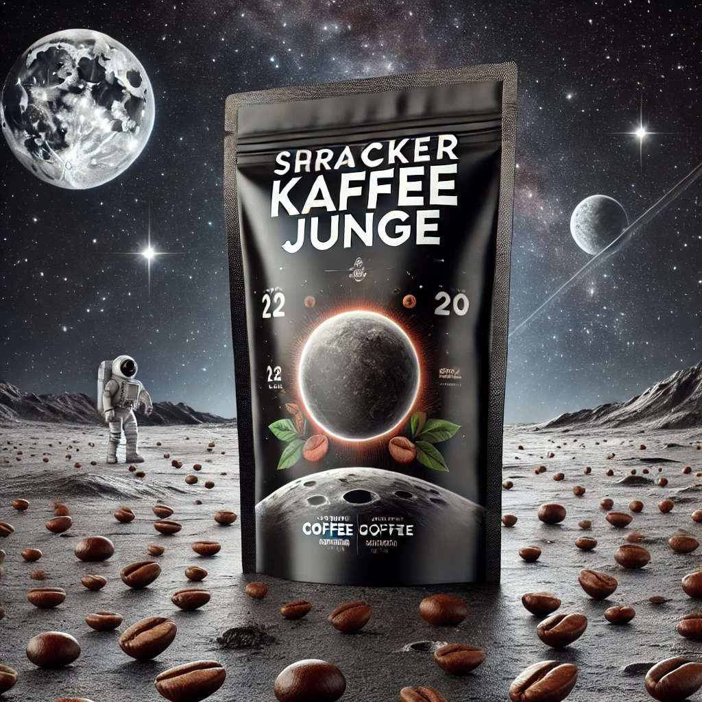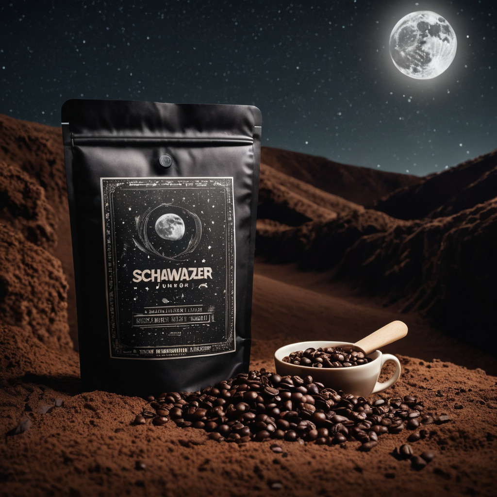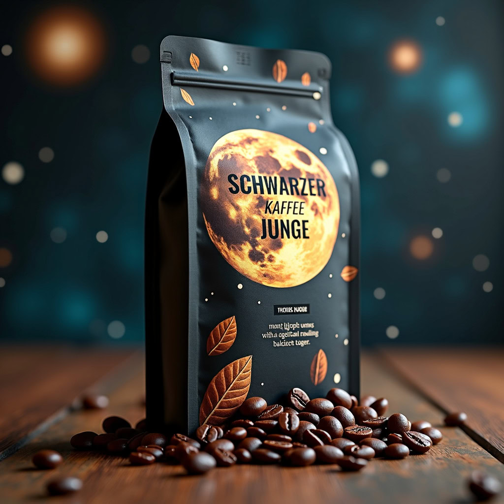 Prompt: a realistic standup pouch product photo mockup decorated with coffee beans and Coffee-leaves with the words „SCHWARZER KAFFEE JUNGE“ featured prominently, scifi, on the moon, space, stars, night