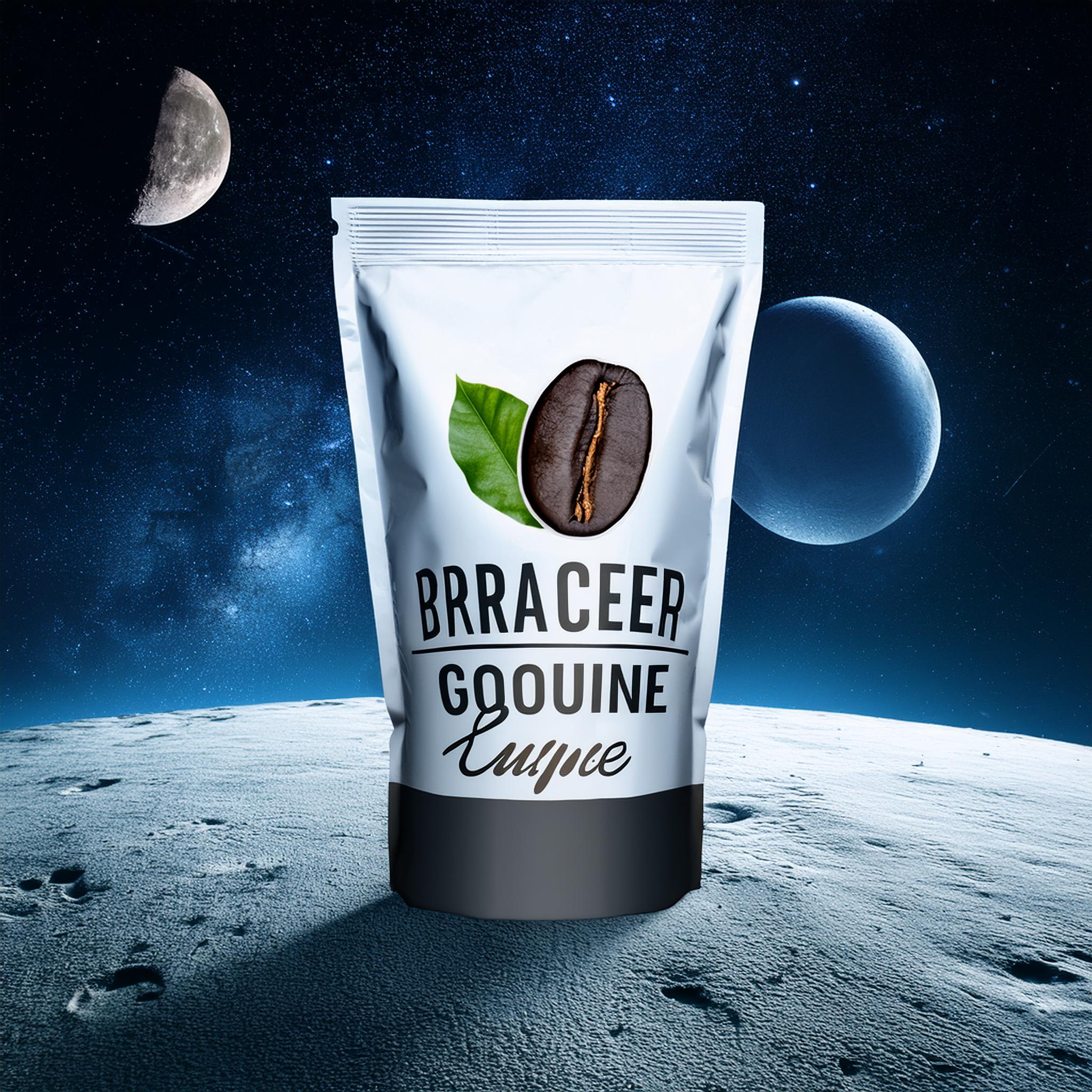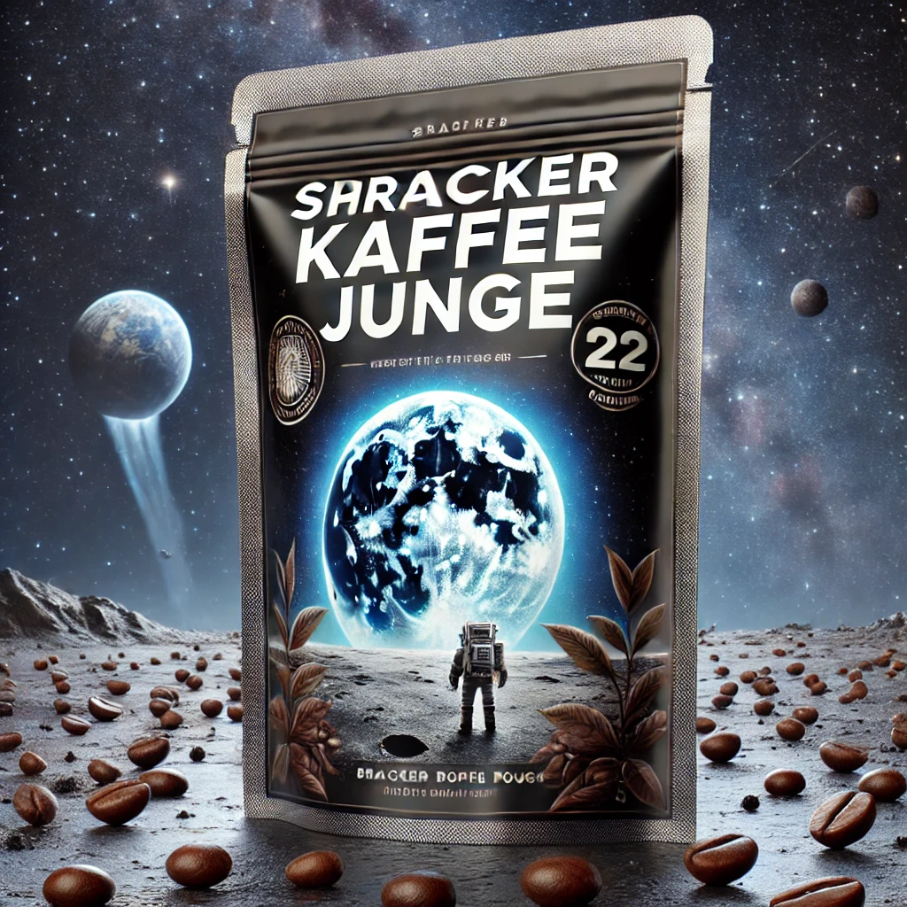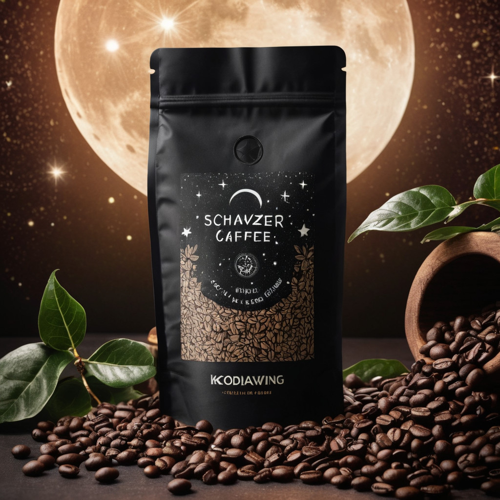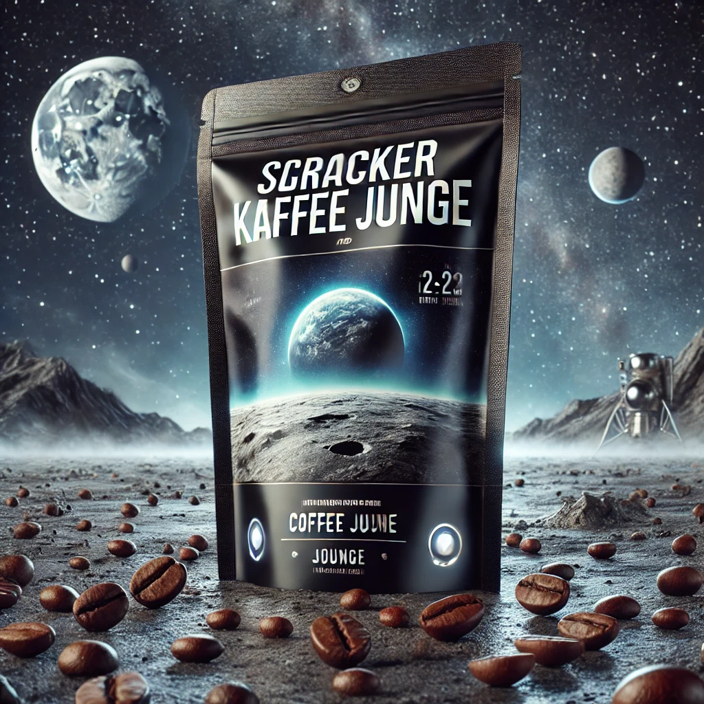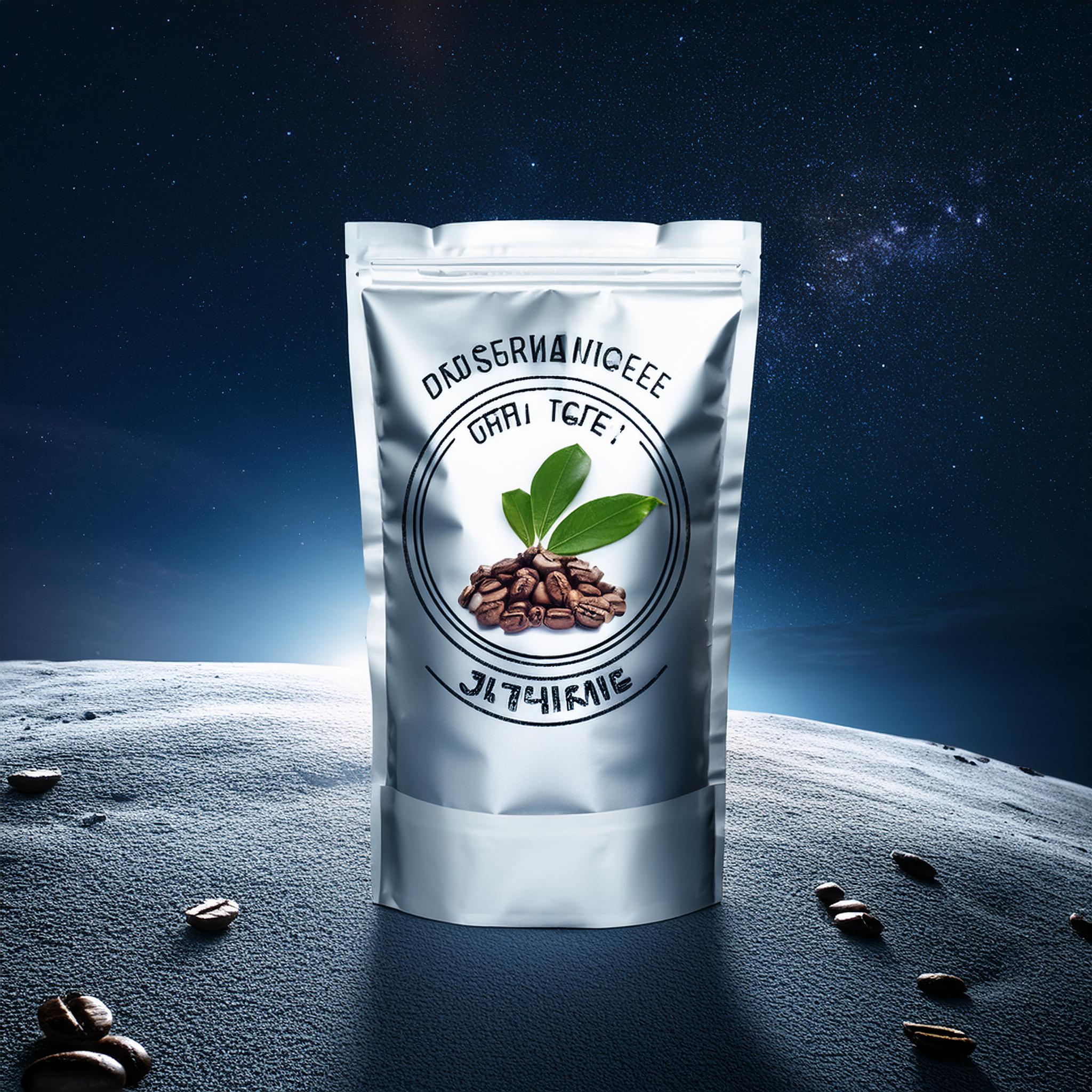 Prompt: a realistic standup pouch product photo mockup decorated with coffee beans and Coffee-leaves with the words „SCHWARZER KAFFEE JUNGE“ featured prominently, scifi, on the moon, space, stars, night