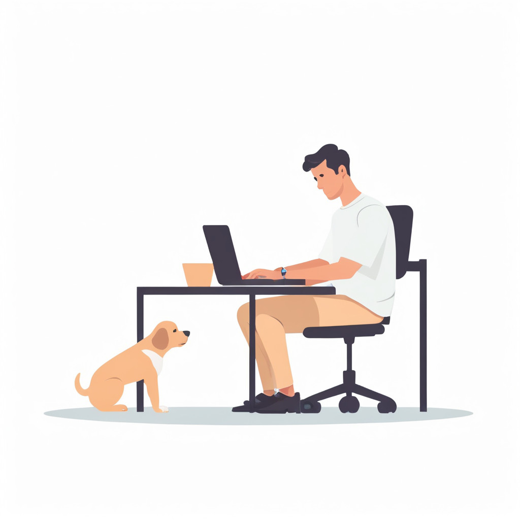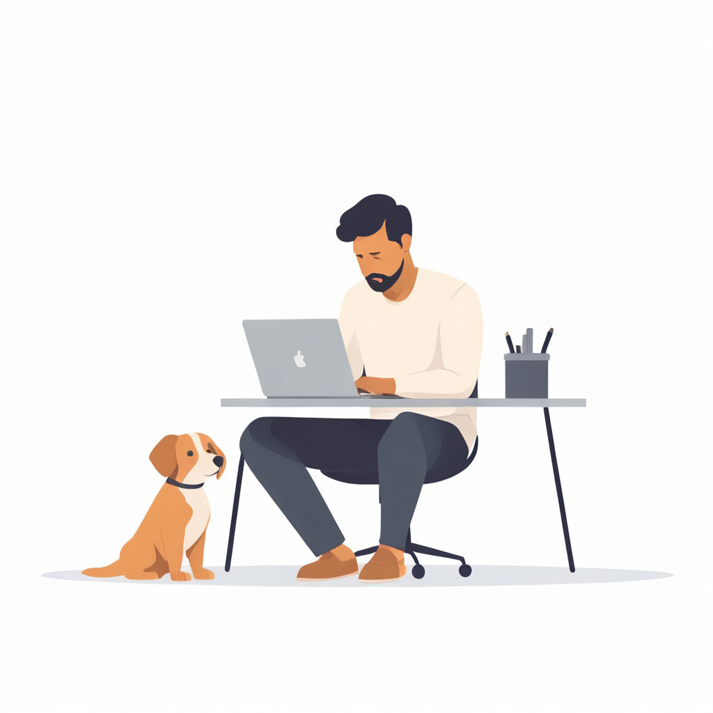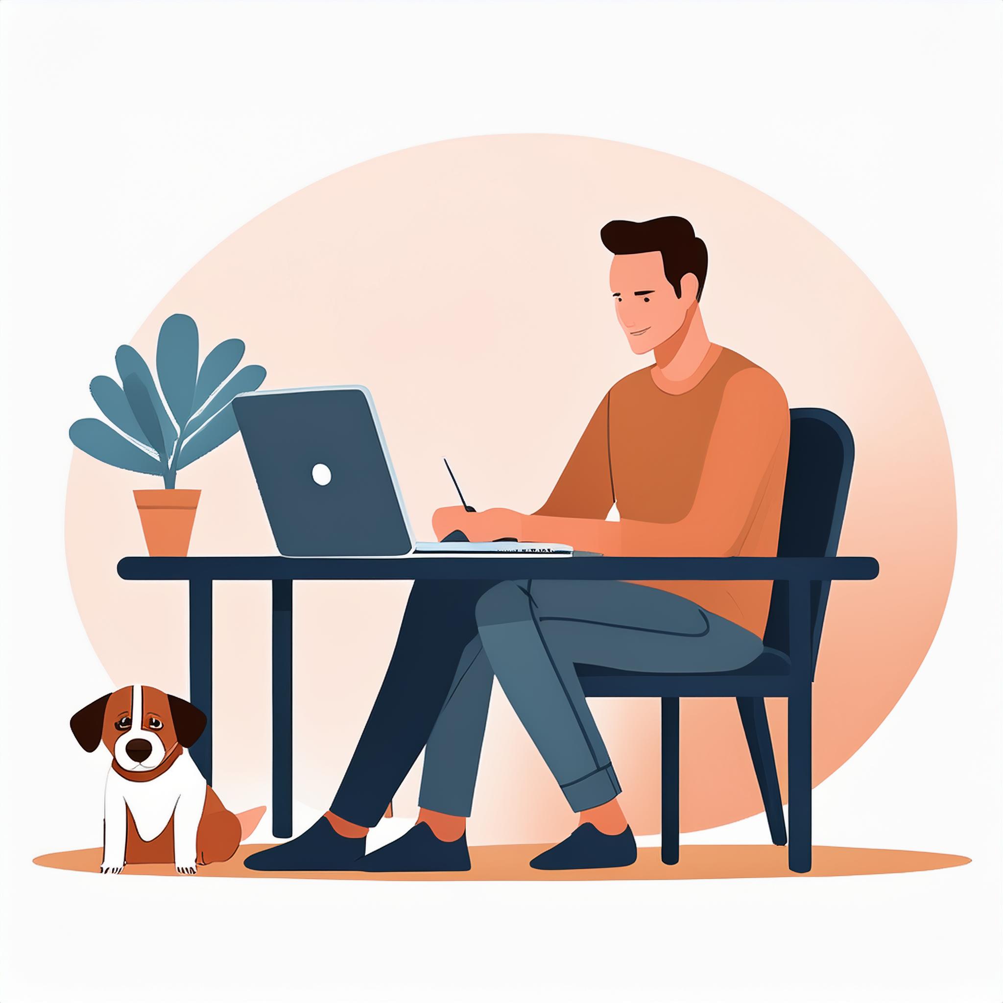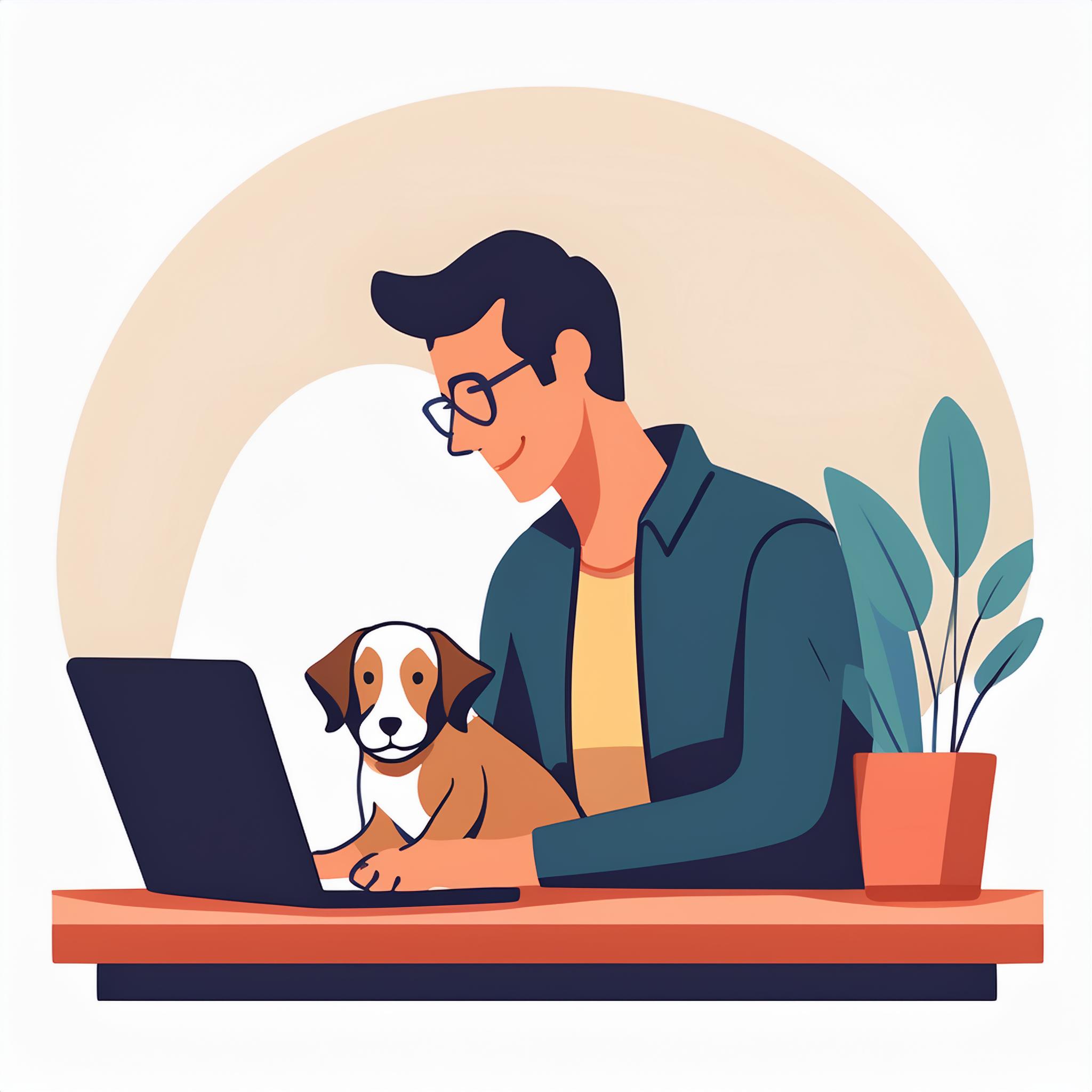 Prompt: flat vector illustration of a man sitting at a desk with his laptop, puppy, isolated on a white background, simple, minimalistic, closeup