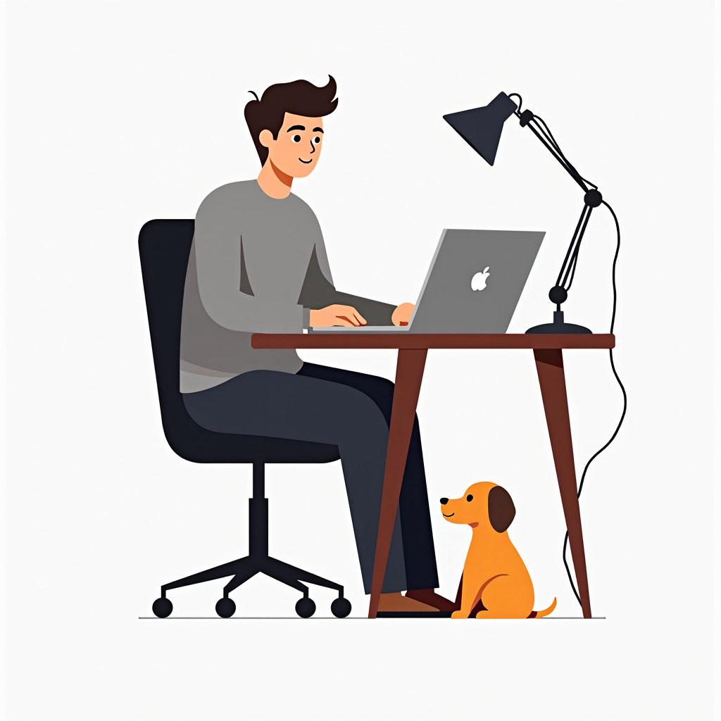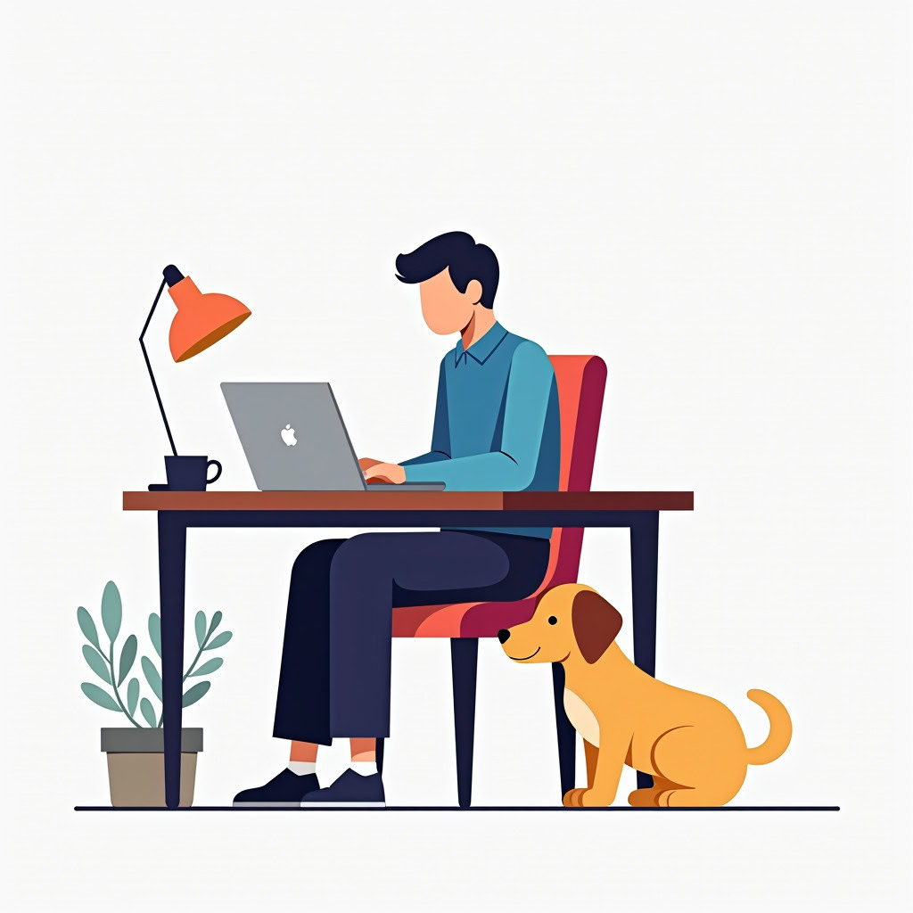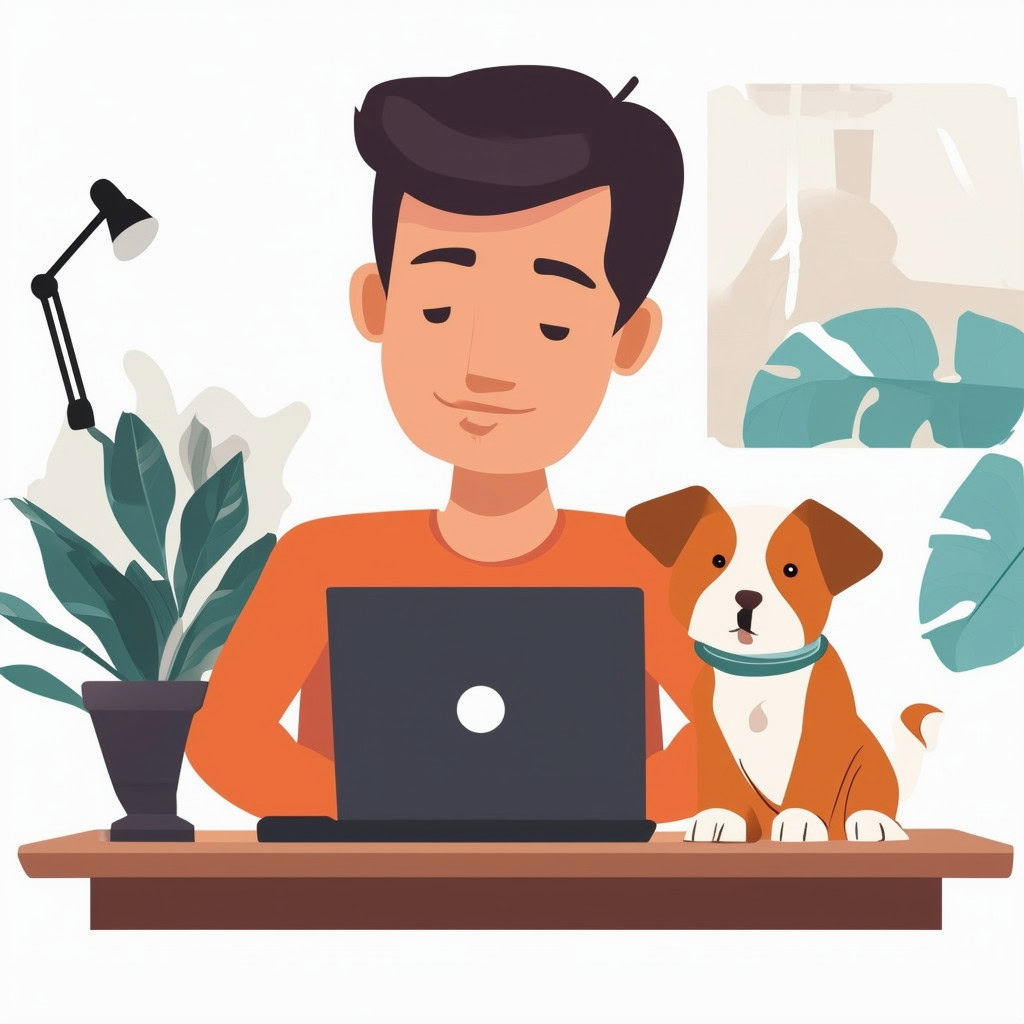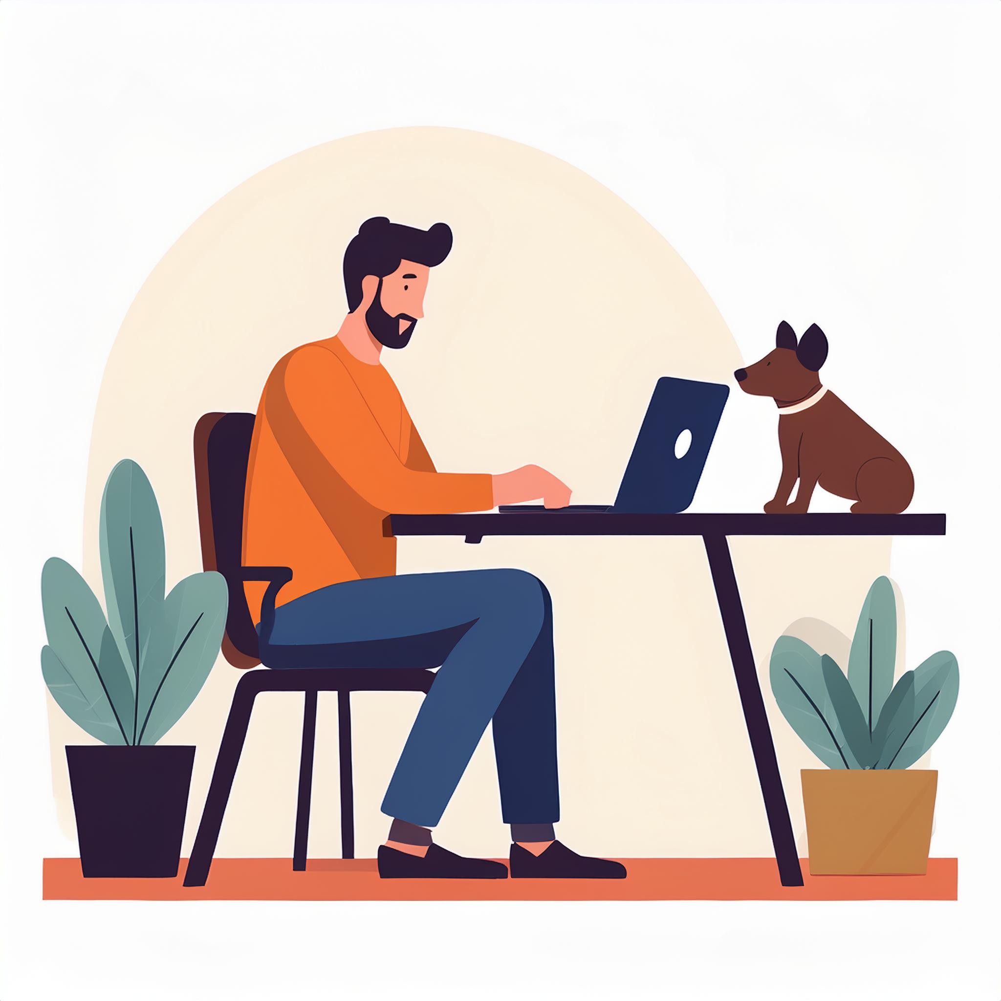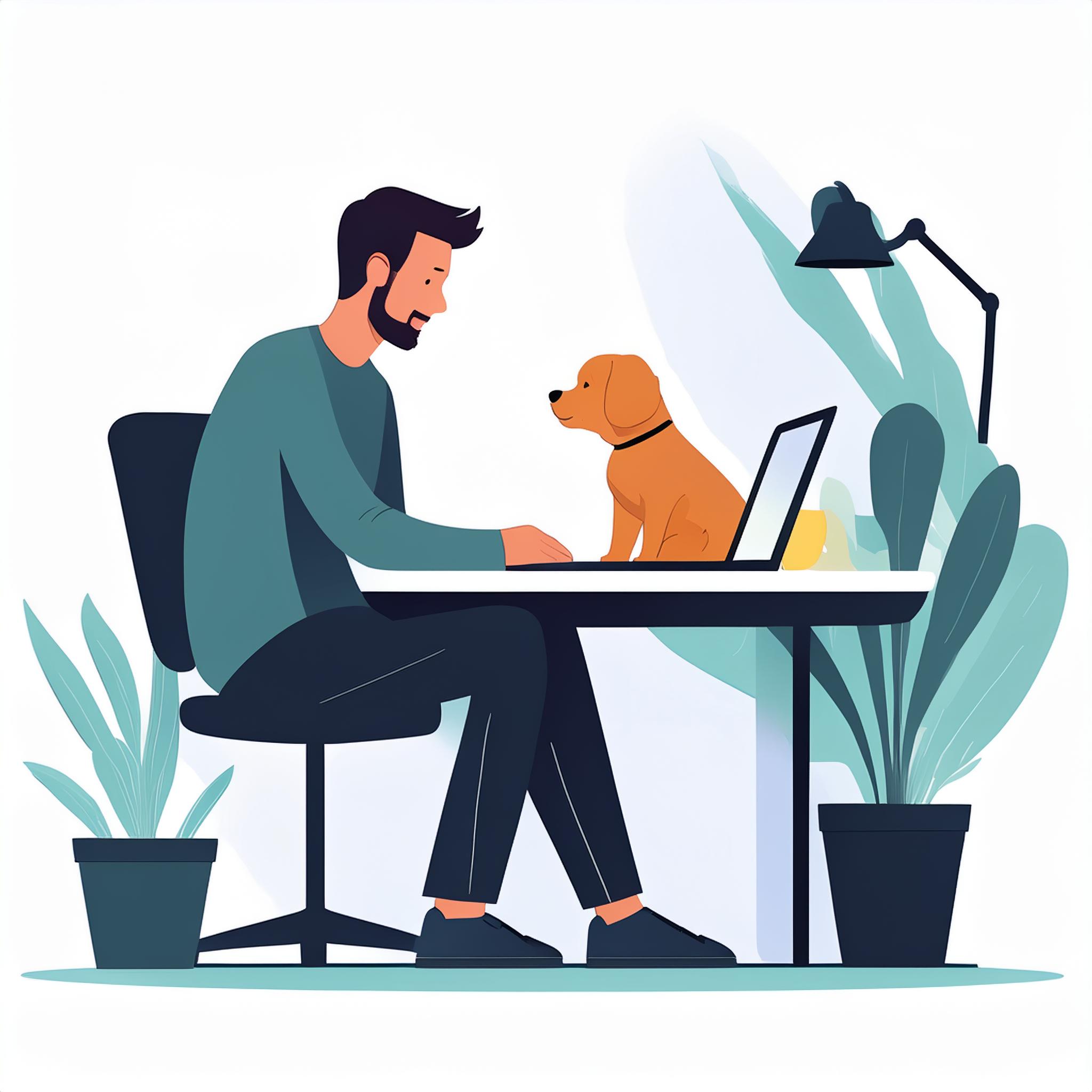 Prompt: flat vector illustration of a man sitting at a desk with his laptop, puppy, isolated on a white background, simple, minimalistic, closeup
