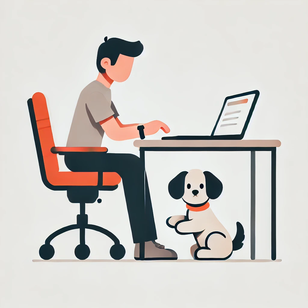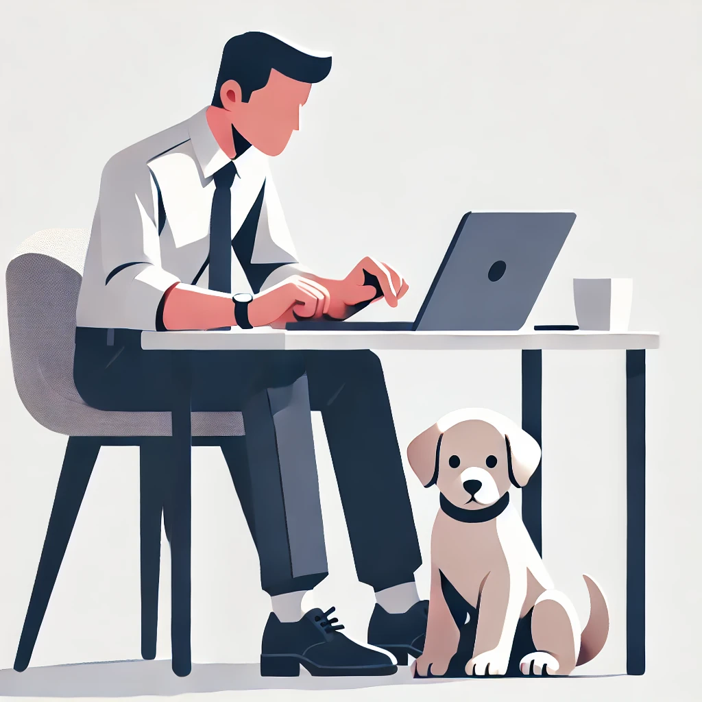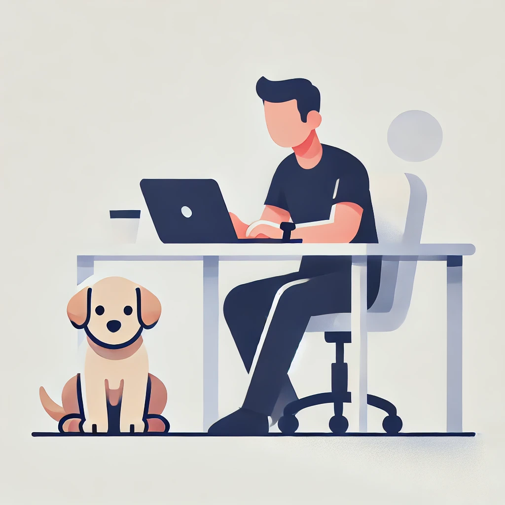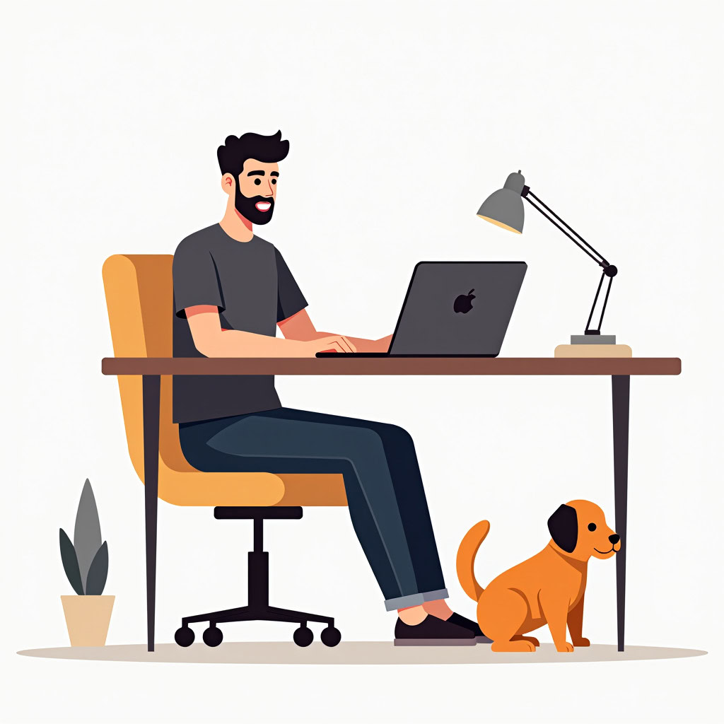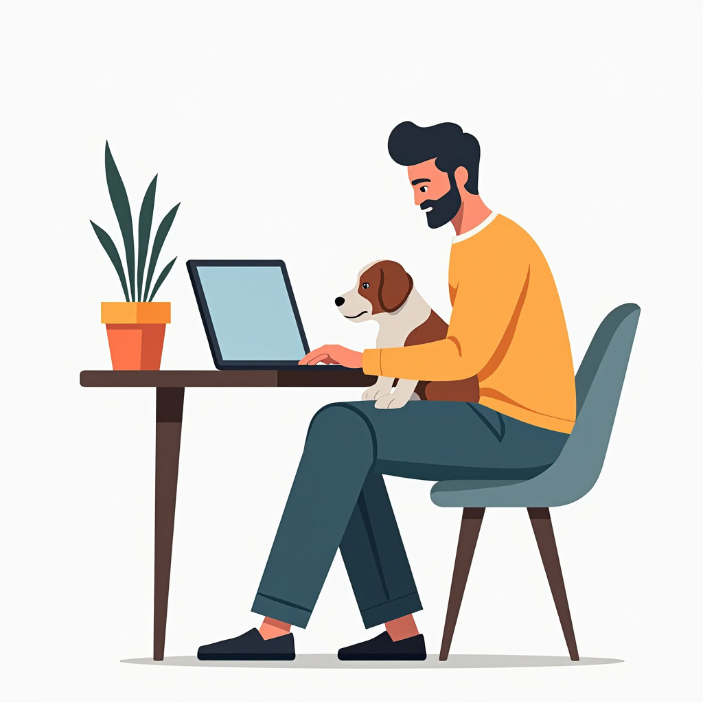 Prompt: flat vector illustration of a man sitting at a desk with his laptop, puppy, isolated on a white background, simple, minimalistic, closeup