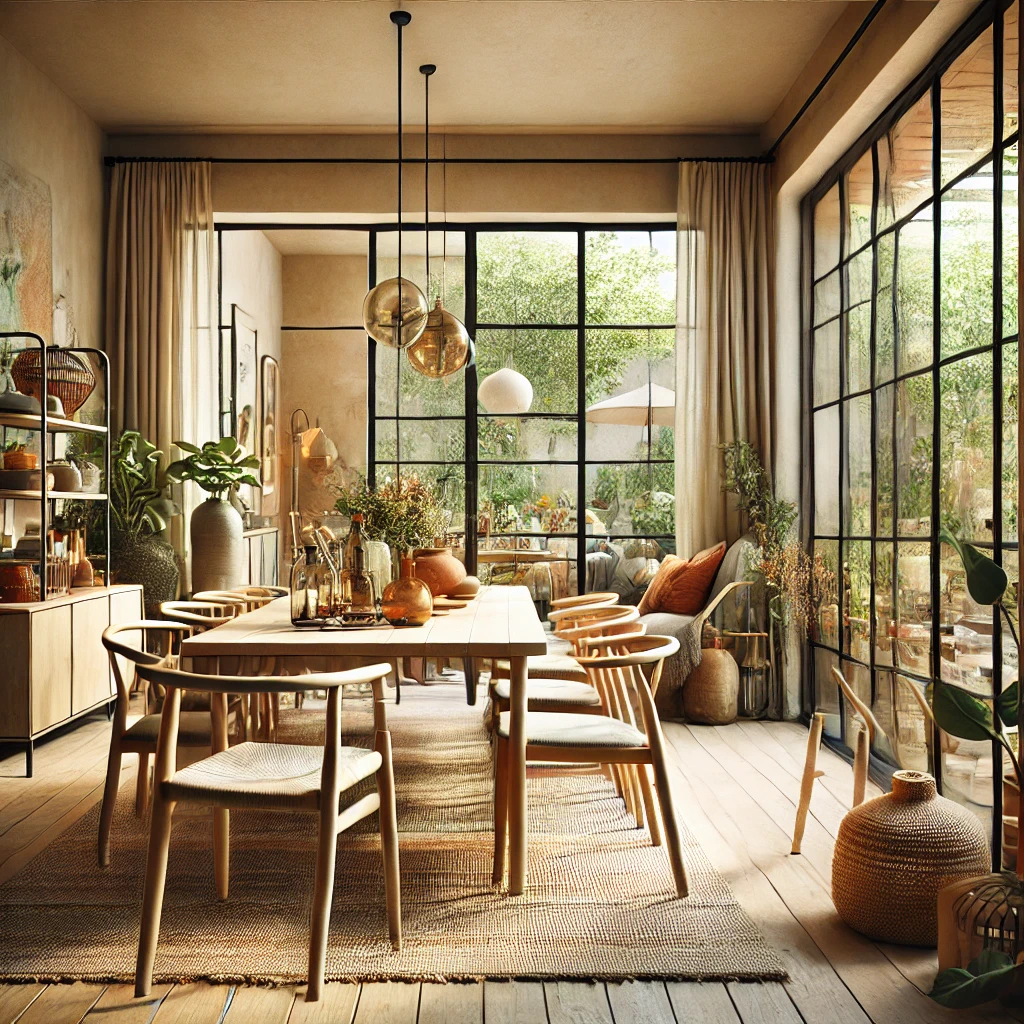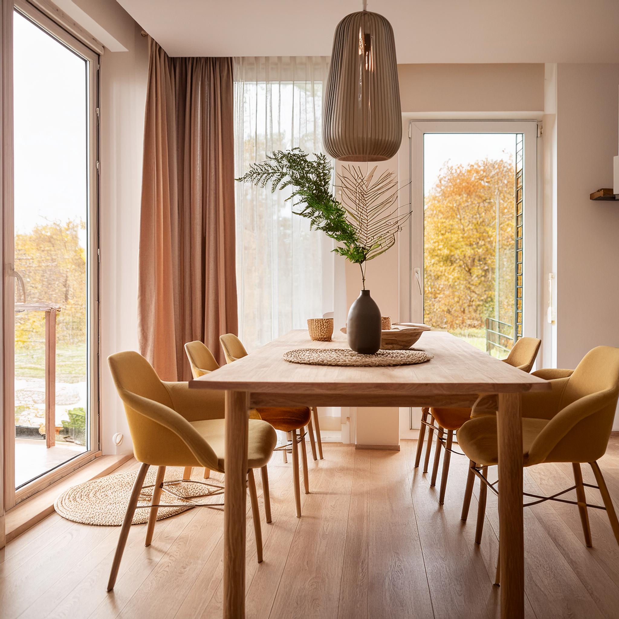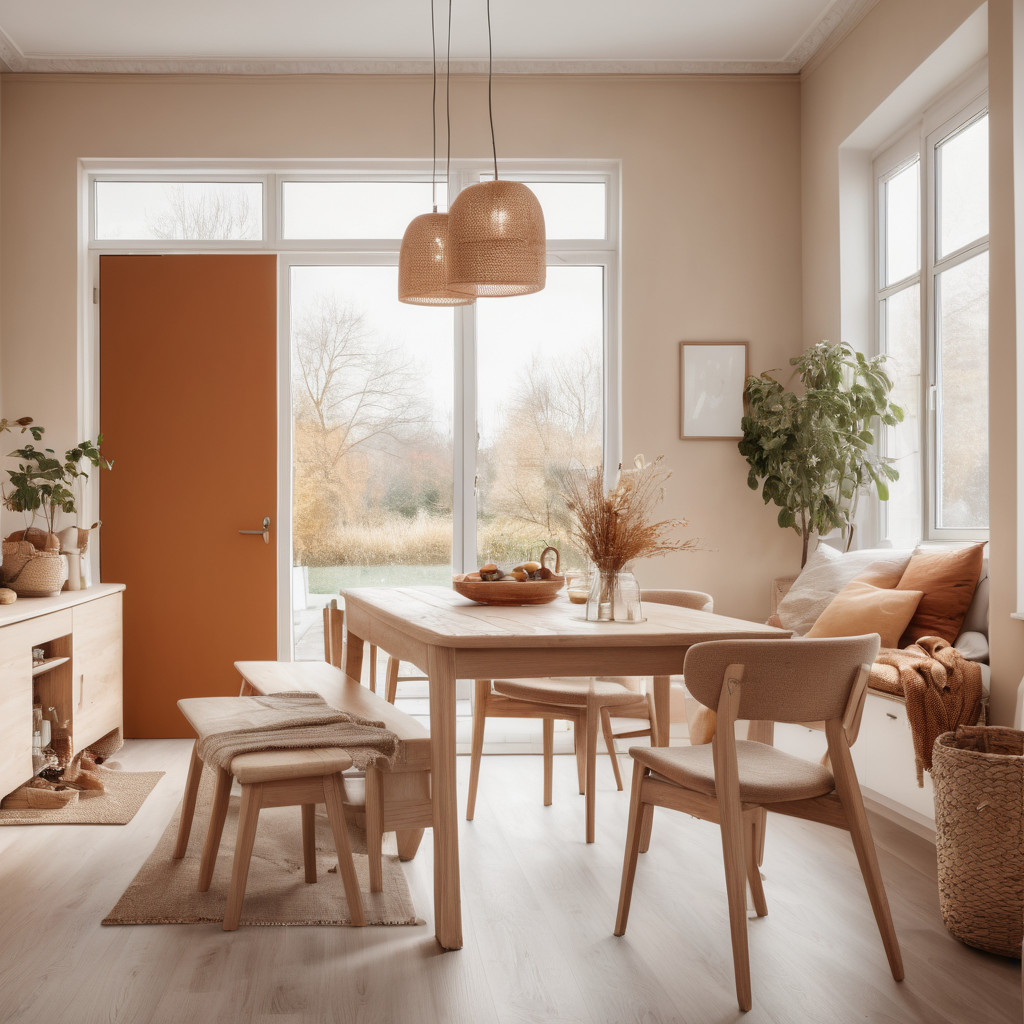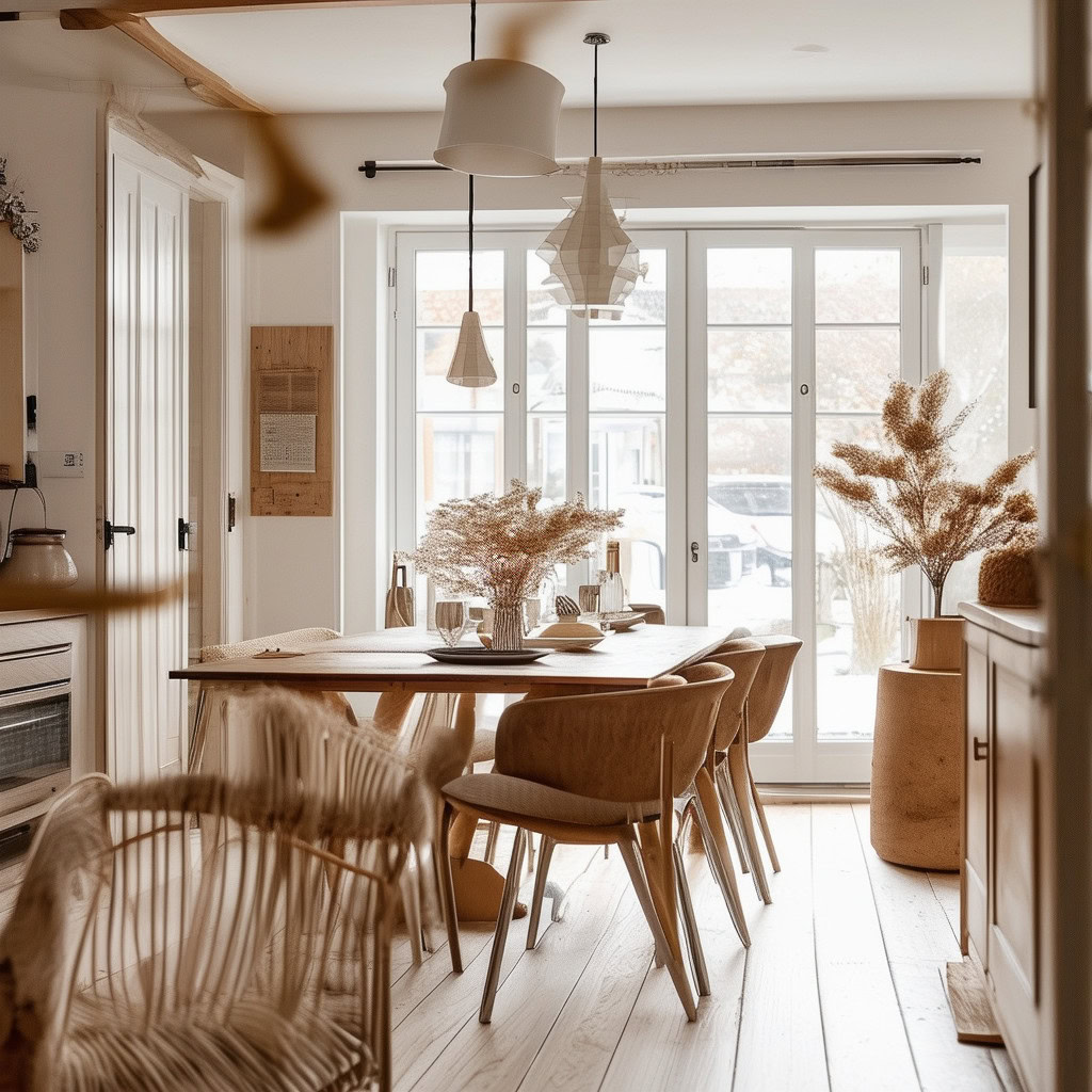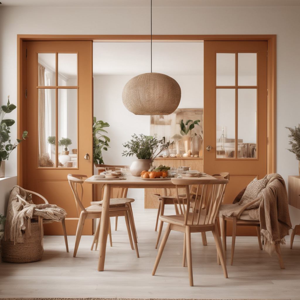Prompt: photo of a dining room with large doors and modern swedish furniture, decorated in a bright warm and earthy color scheme, hygge style