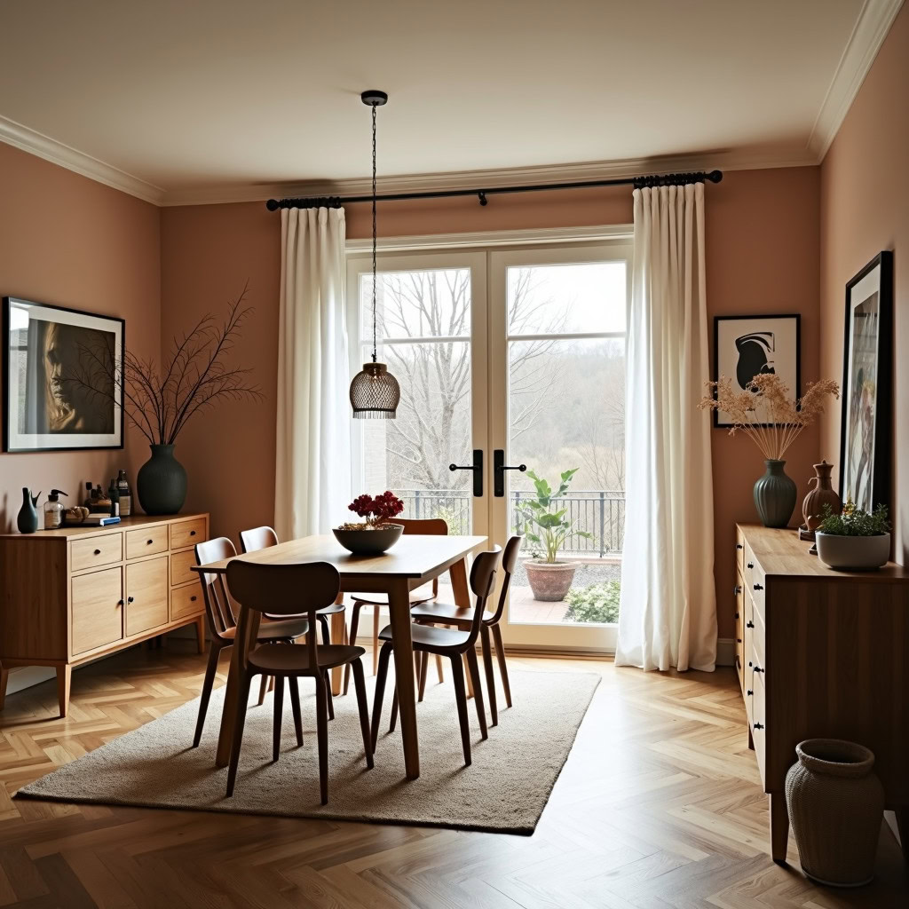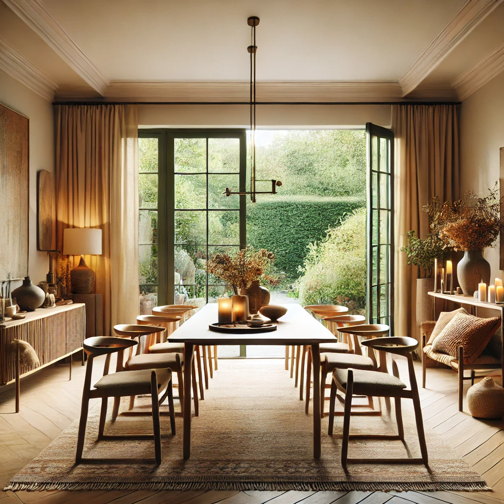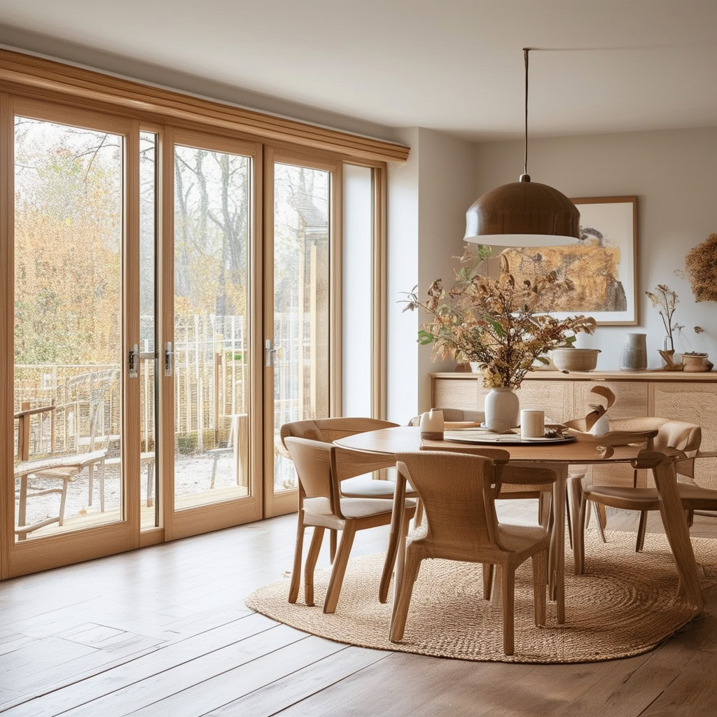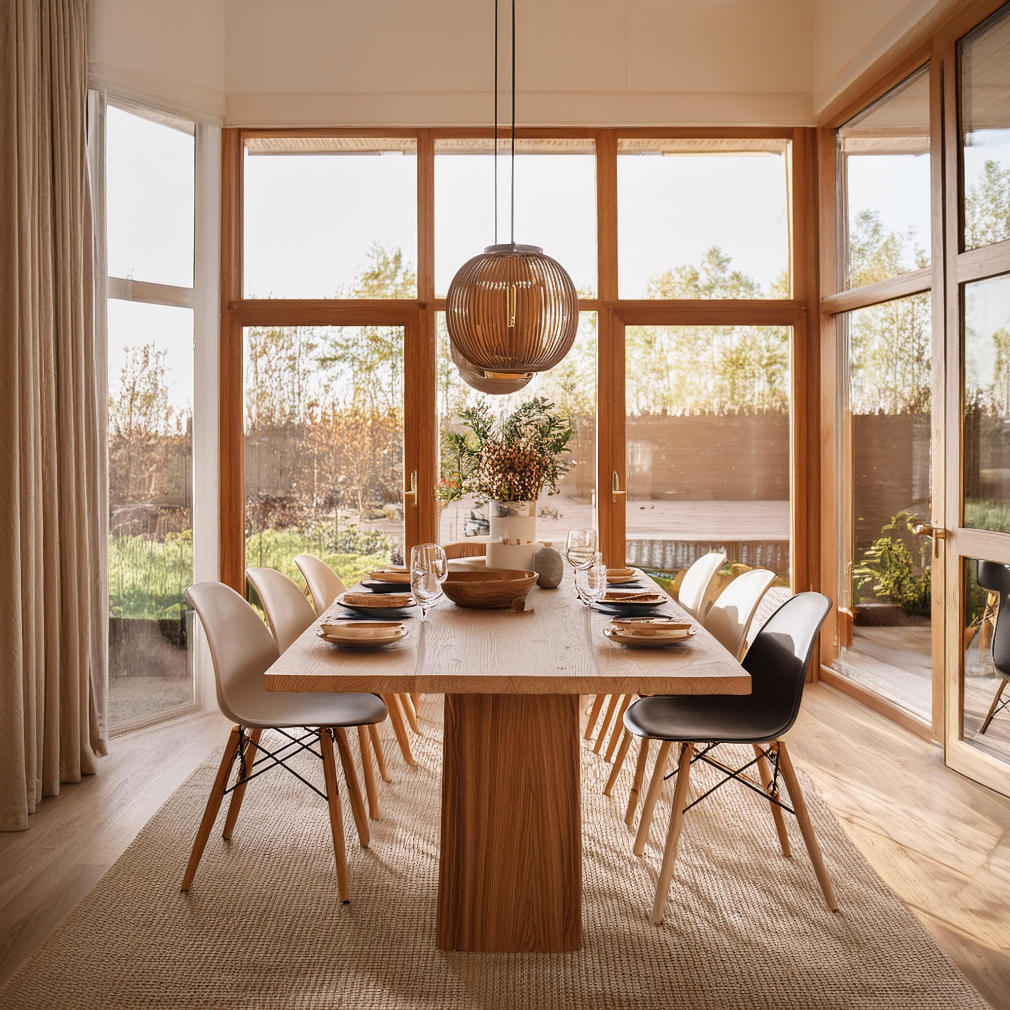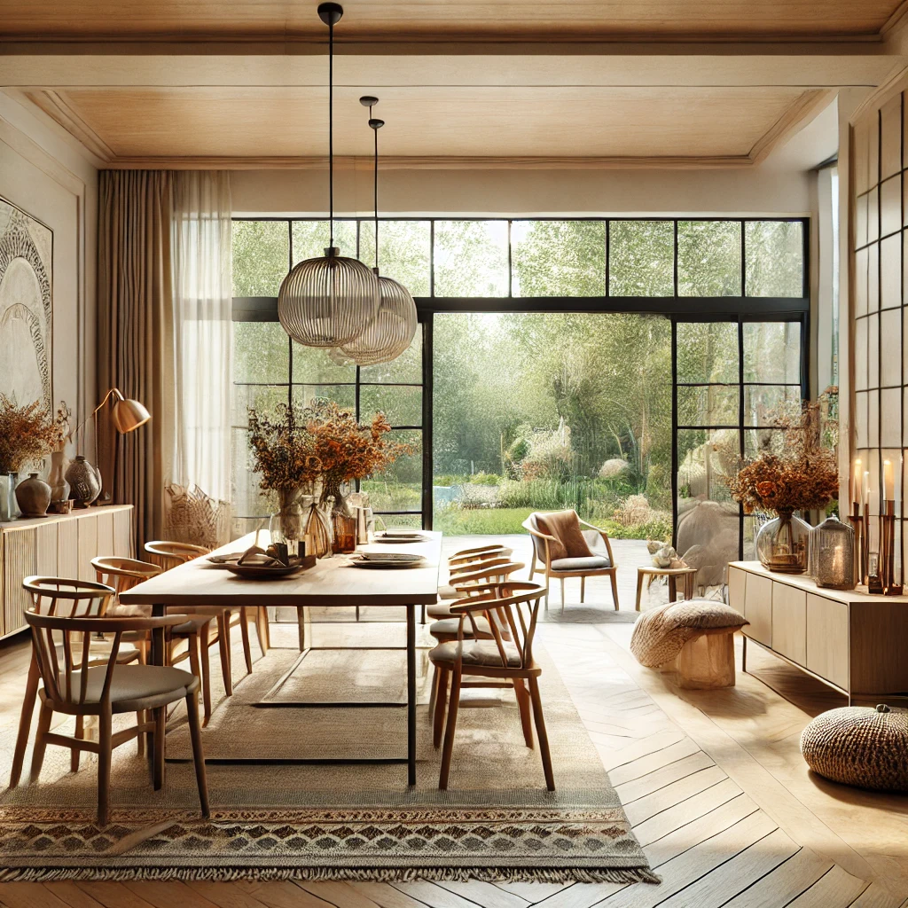 Prompt: photo of a dining room with large doors and modern swedish furniture, decorated in a bright warm and earthy color scheme, hygge style