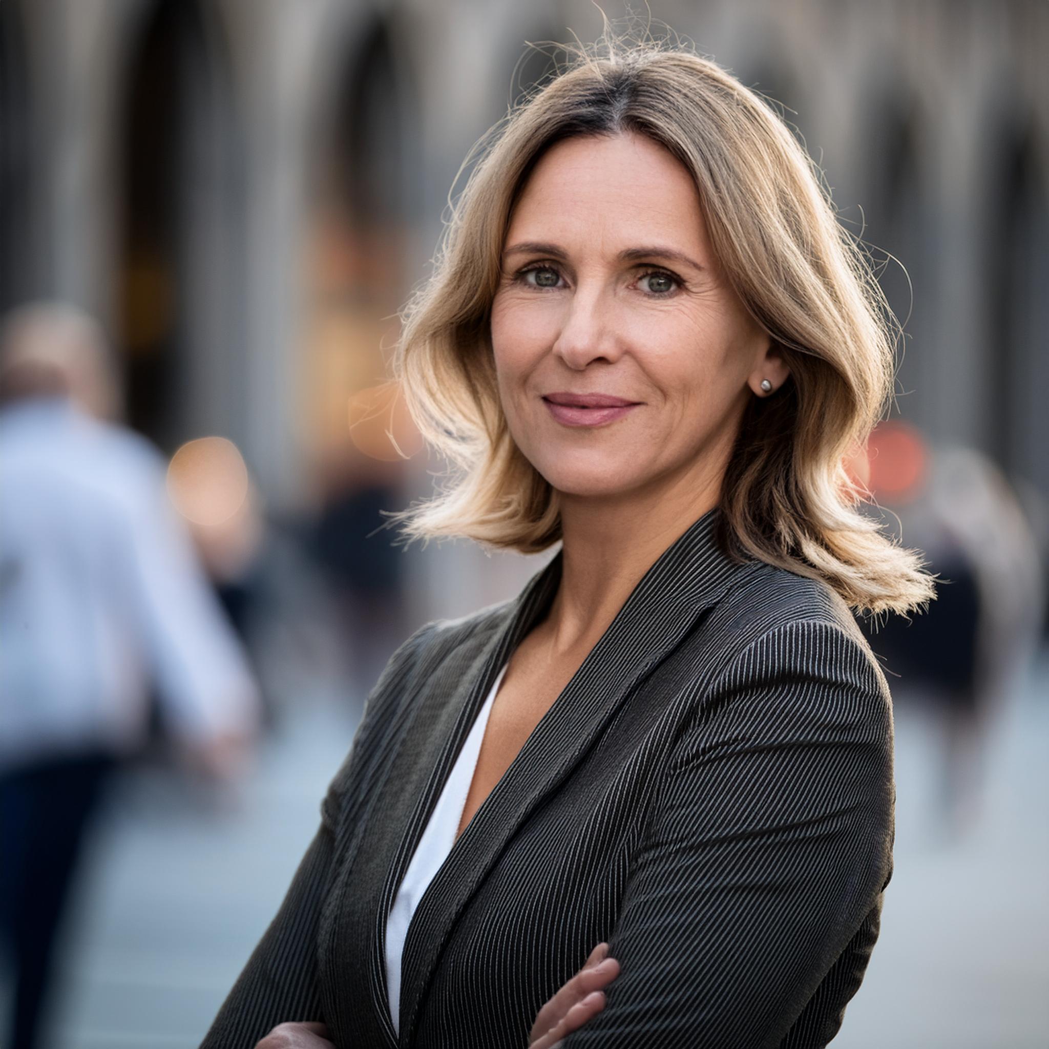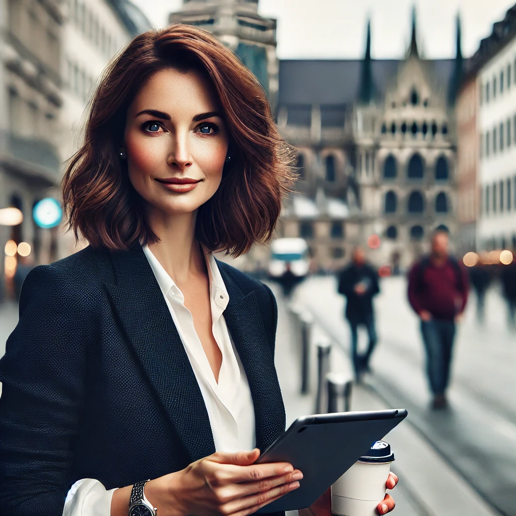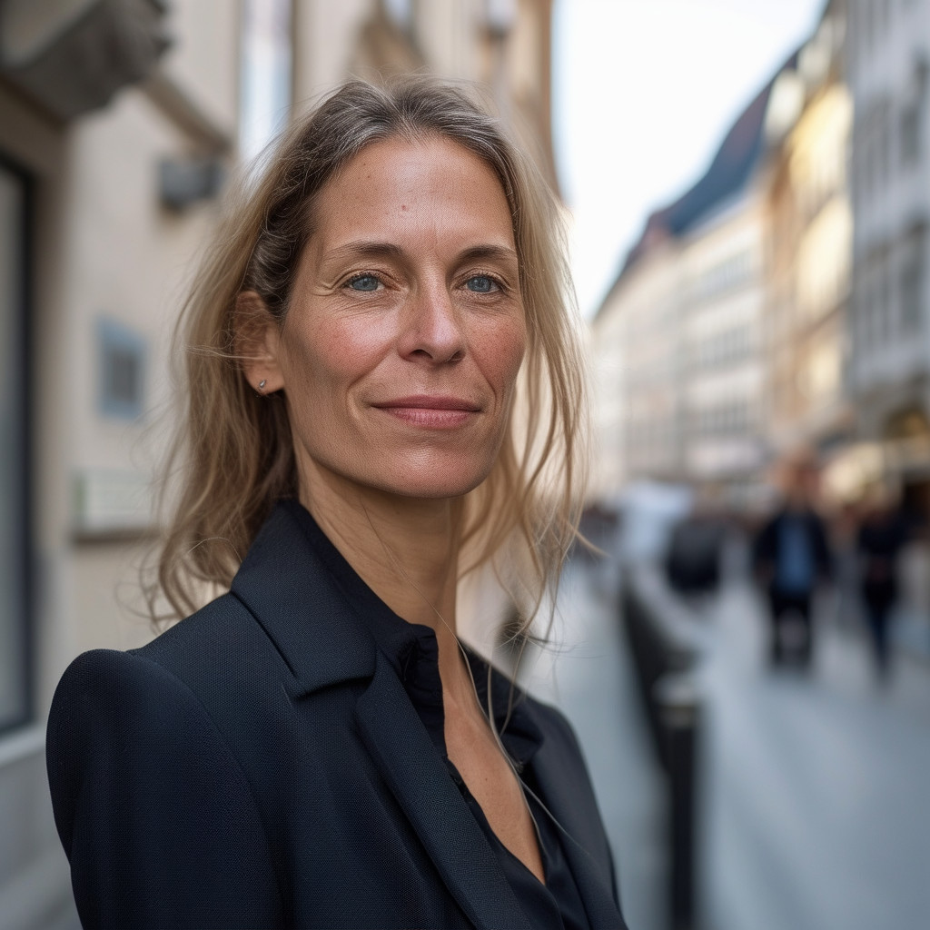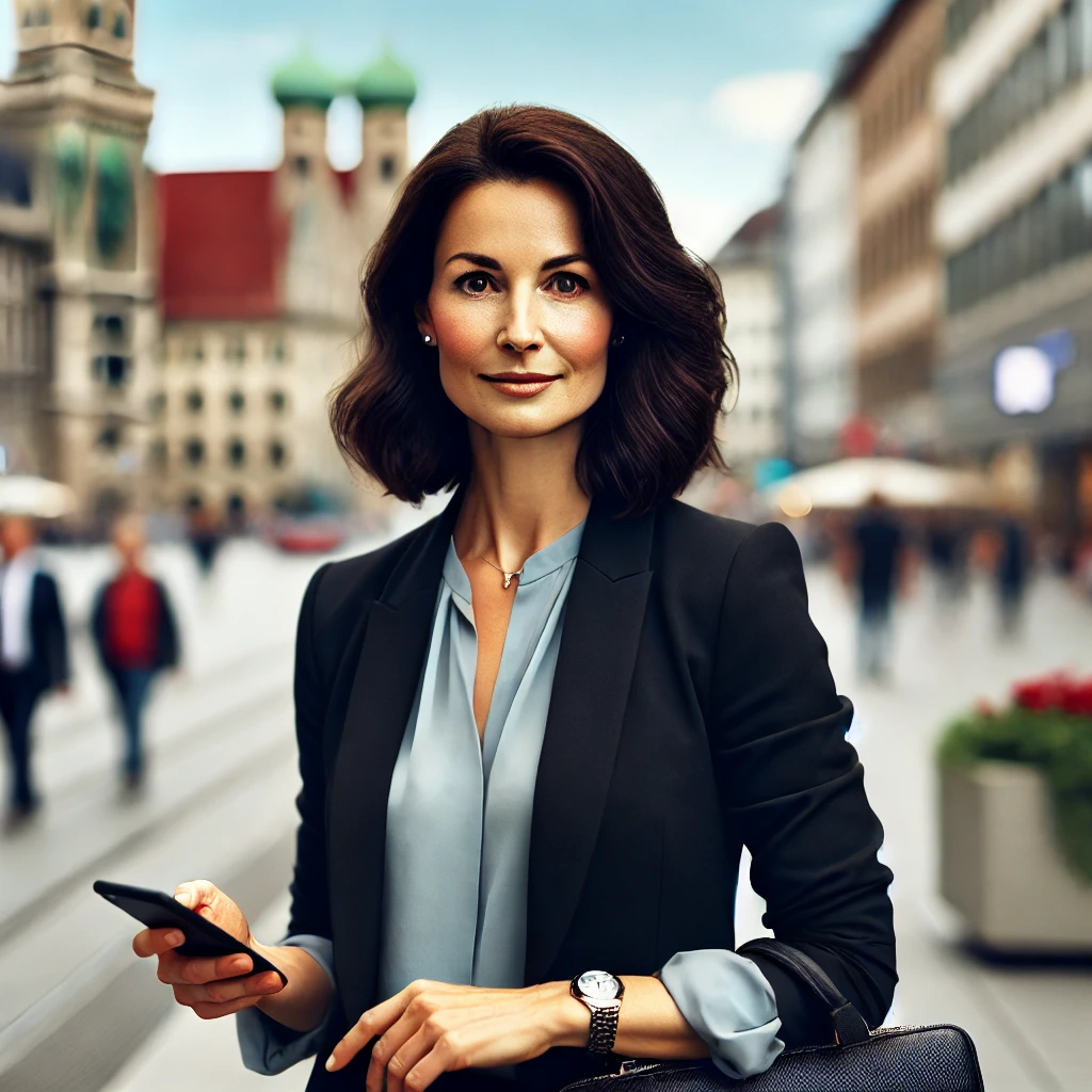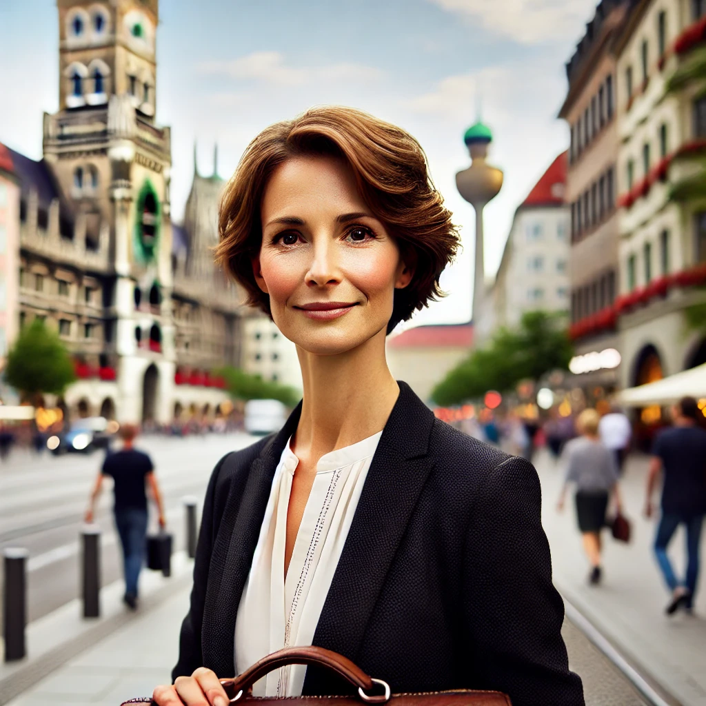 Prompt: portrait photo of a 40 year old business woman, streets of munich