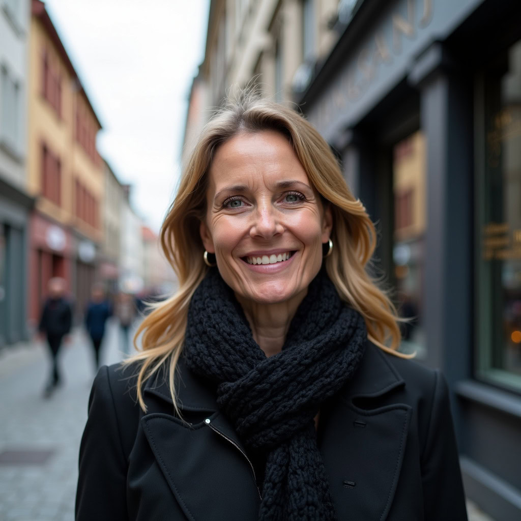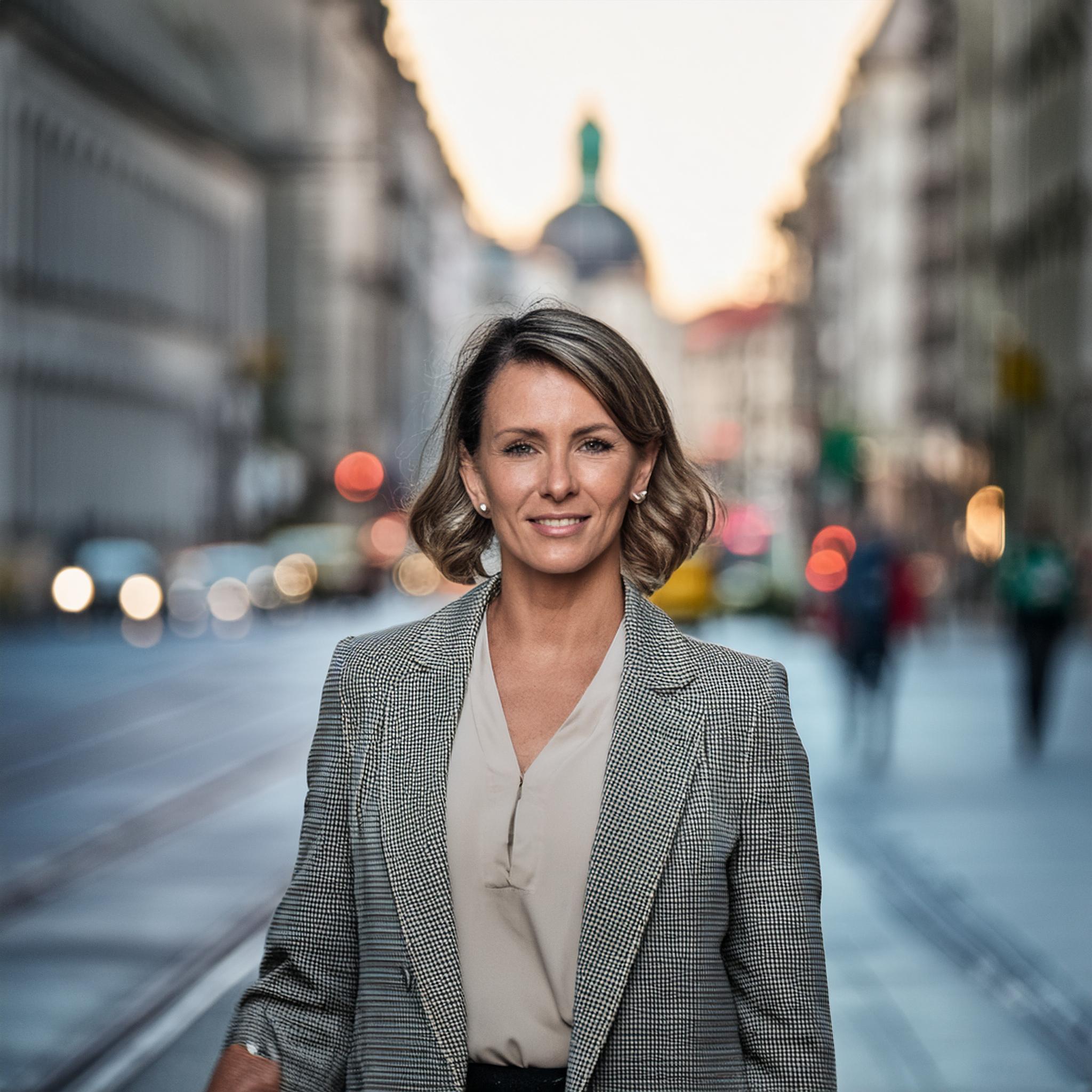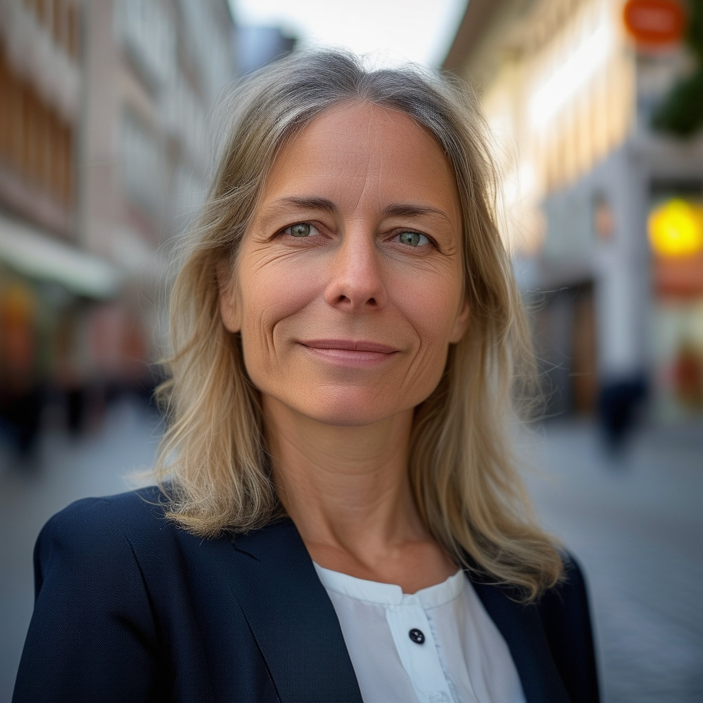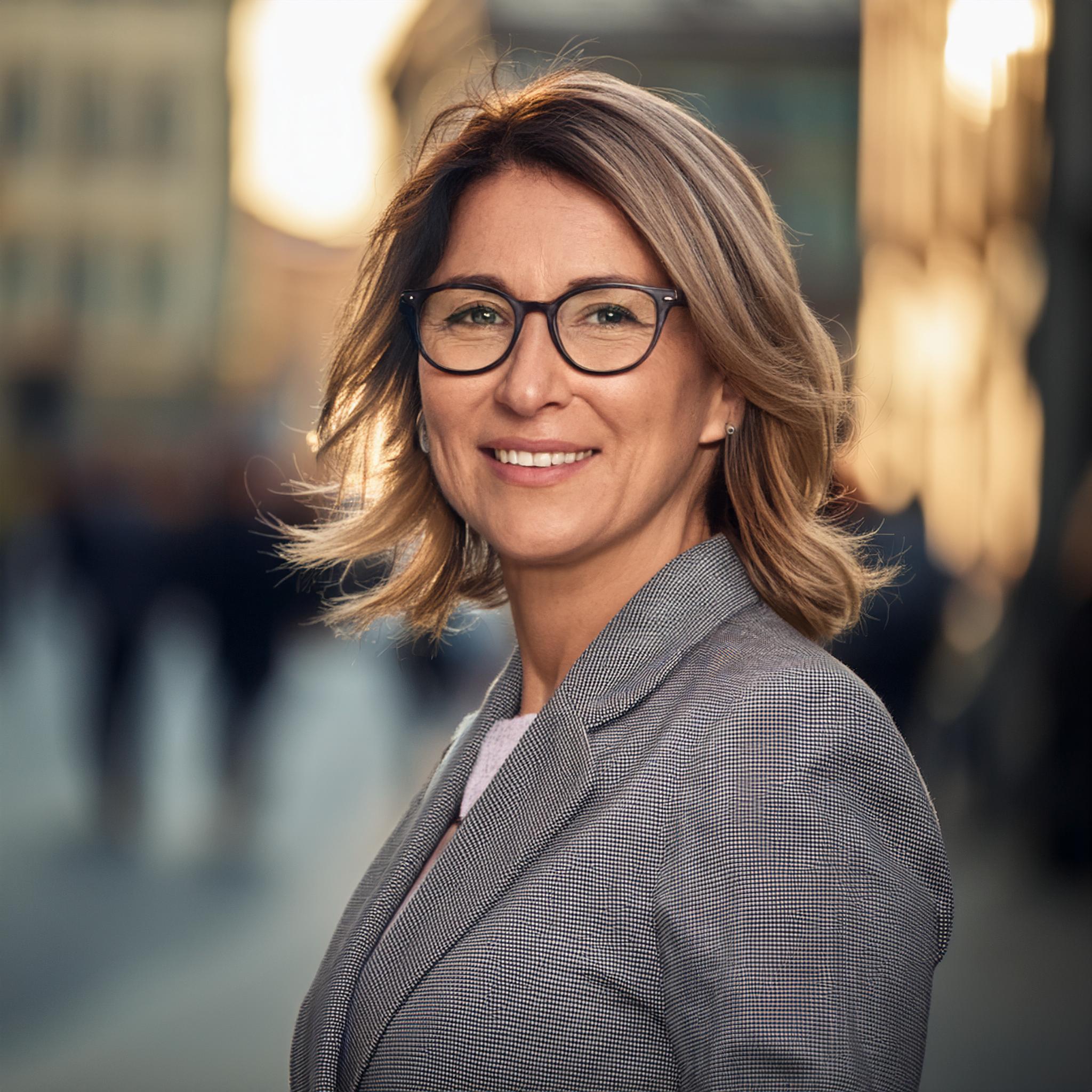 Prompt: portrait photo of a 40 year old business woman, streets of munich