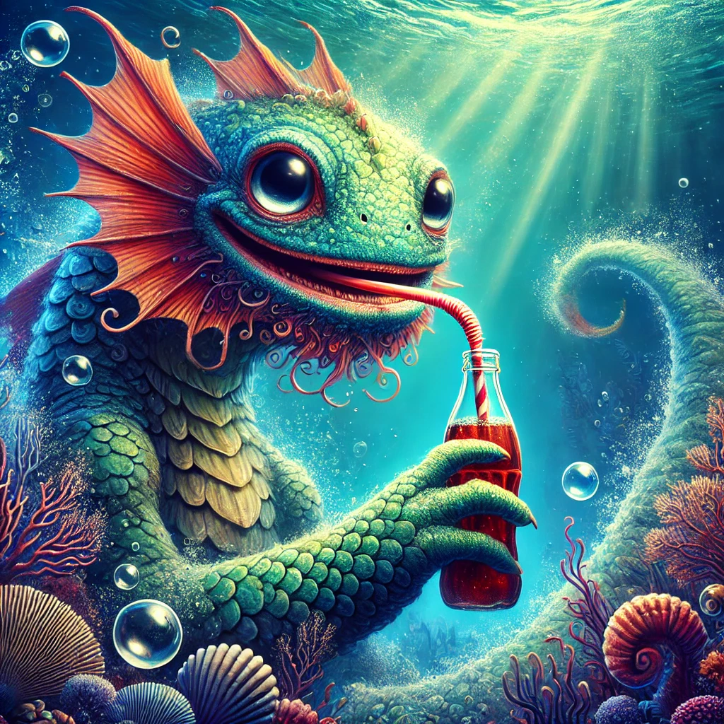 - Dall-E 3: ★★★★☆ (4 Sterne) Sehr kreative und fantasievolle Umsetzung. Die Bilder sind abstrakt und farbenfroh, zeigen eindeutig Seemonstern, die Soda mit Strohhalmen trinken. Die Unterwasser-Atmosphäre ist gut eingefangen. Leichter Abzug, weil die Bilder mehr abstrakt als fotorealistisch sind.