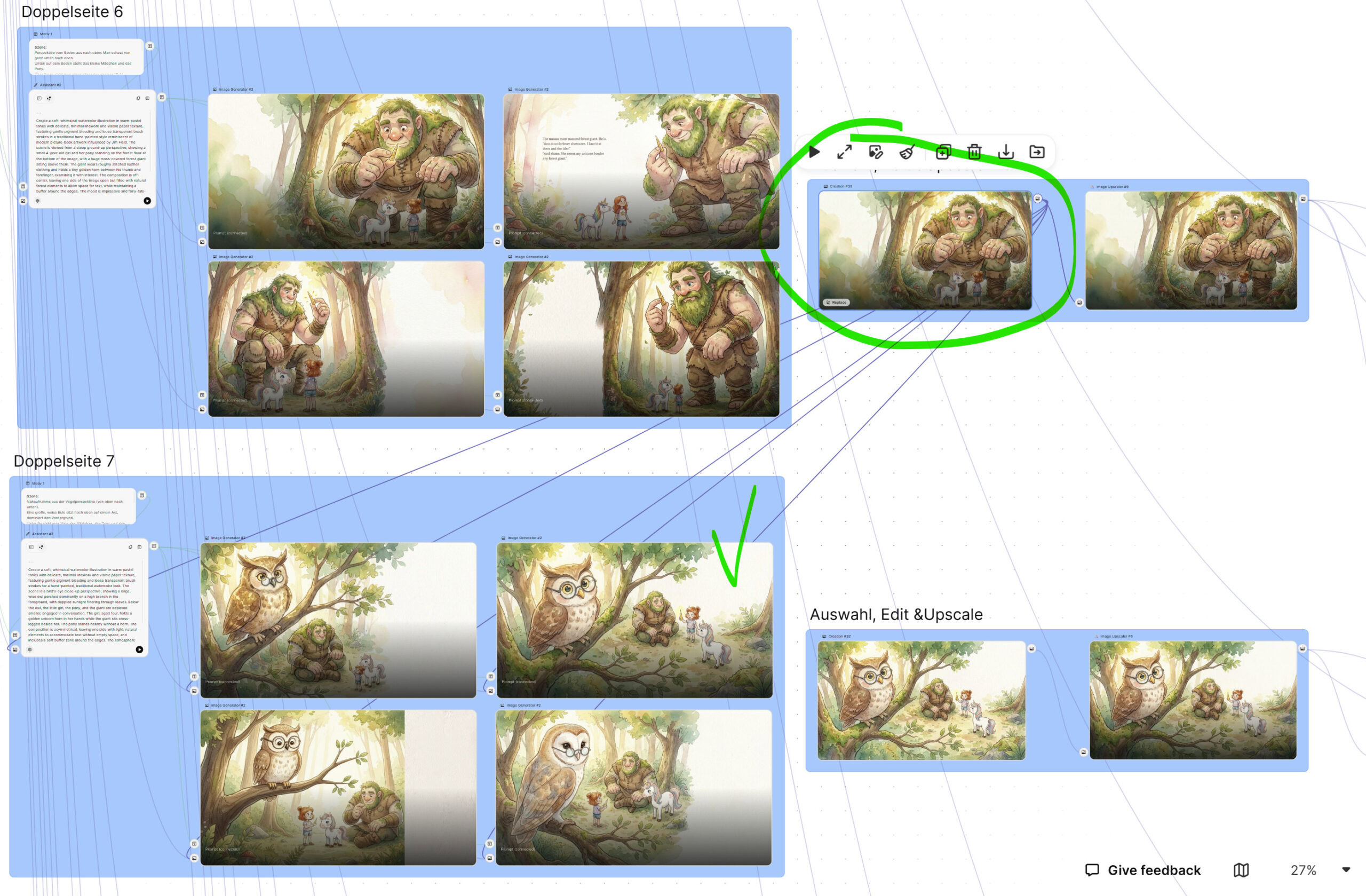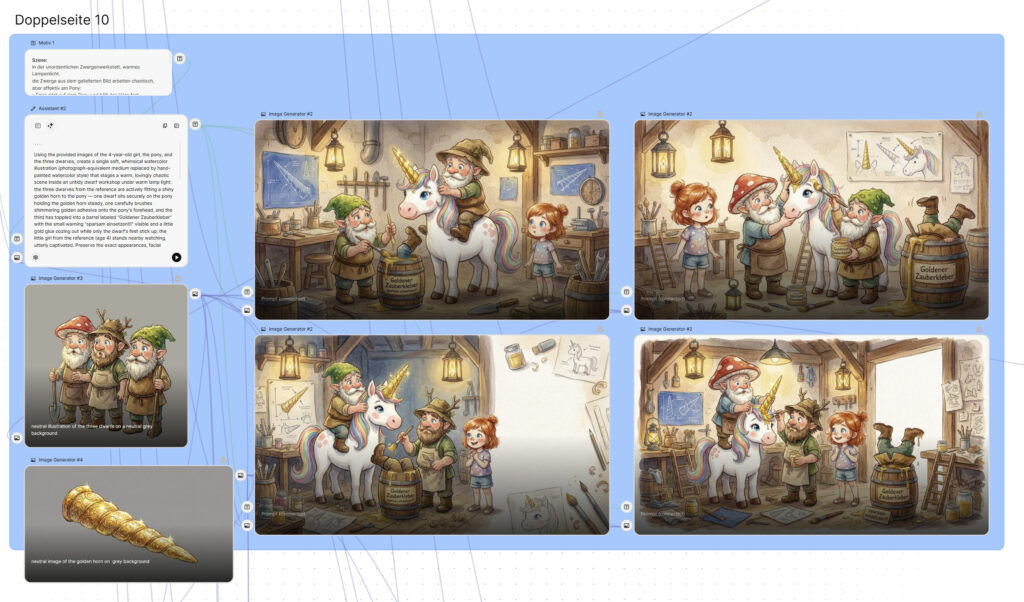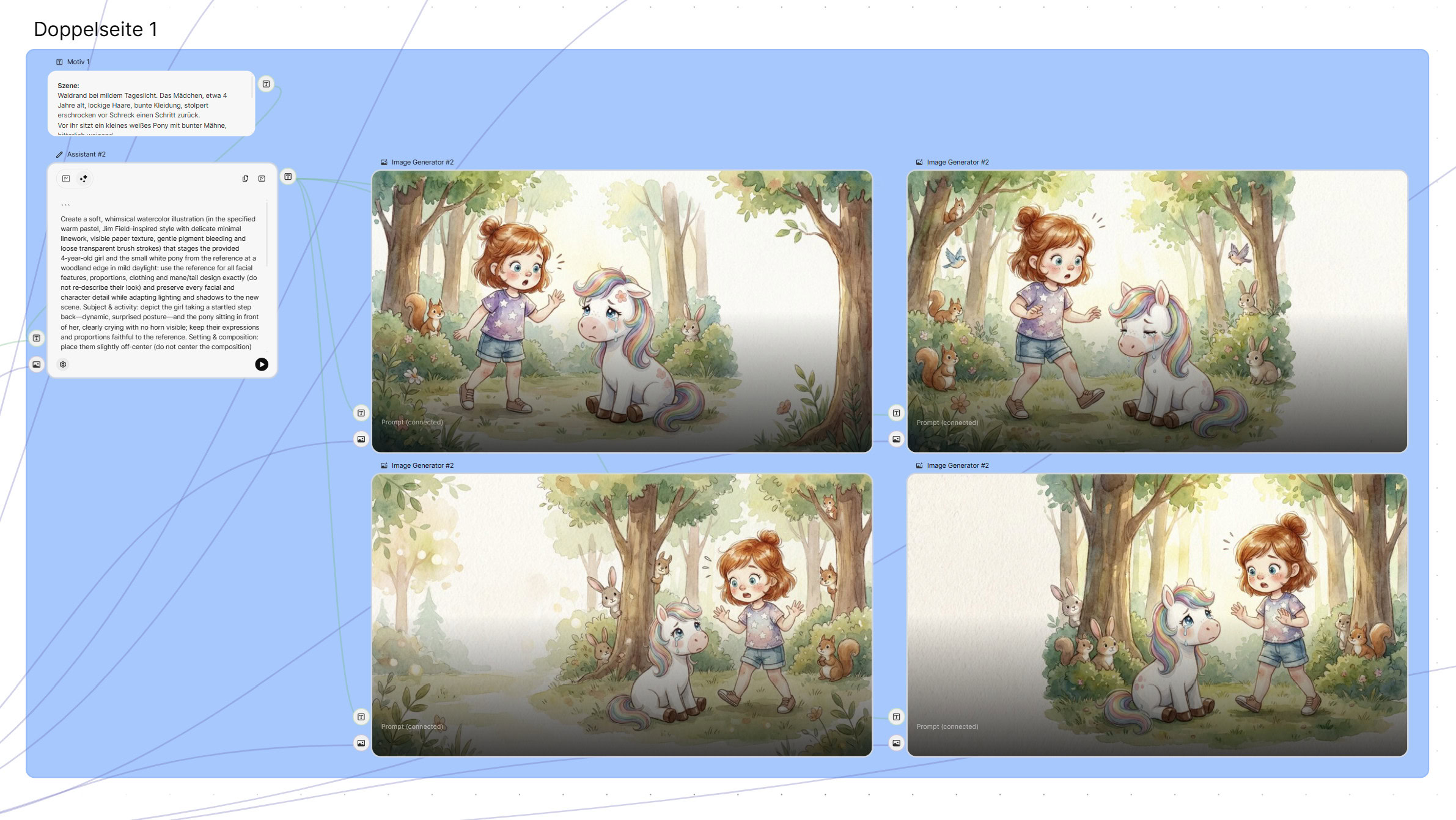 Jetzt wird es technisch etwas anspruchsvoller. Ein Kinderbuch ist mehr als eine Ansammlung schöner Einzelbilder. Ich brauchte einen natürlichen Fluss, konsistenten Stil und wiederkehrende Elemente (das Horn, die Nebencharaktere). Ein klassischer monolitscher Generator kommt da schnell an seine Grenzen. Man verliert den Überblick.