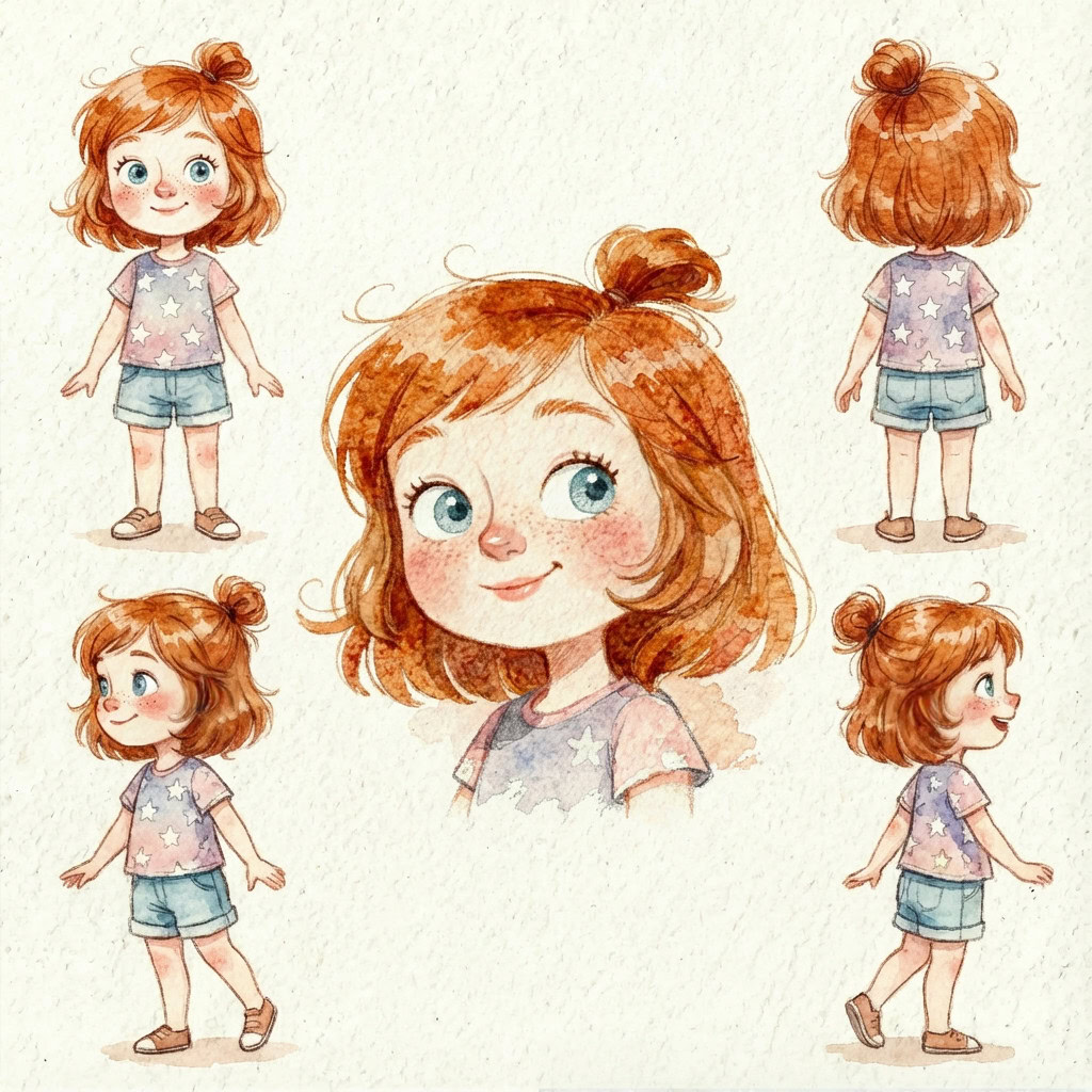 Using the provided watercolor illustration of the 4-year-old girl, please create a complete character sheet. Place the original portrait in the center, preserving all facial details, freckles, red hair with the small topknot, and her gentle, curious expression. Surround the portrait with four full-body views — front, side, back, and a 3/4 pose — each rendered with characteristic childlike abstraction: simplified, charming proportions, slightly oversized head, soft rounded limbs, and a warm, whimsical silhouette. Maintain her clothing exactly as in the reference: a pastel T-shirt with soft star patterns in light lavender and peach tones, paired with simple light-blue jeans, plus her pink wristwatch on the left arm. Keep the overall style fully aligned with the reference: soft, whimsical watercolor illustration with warm pastel tones, delicate minimal linework, visible paper texture, gentle pigment bleeding, loose transparent brush strokes, smooth gradients, subtle shading, and an airy, friendly picture-book atmosphere. Ensure diffuse, warm lighting across all views and preserve all facial details precisely while integrating the full-body poses seamlessly into the final sheet.